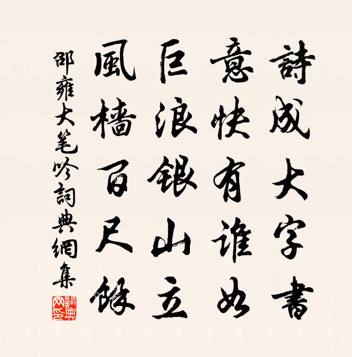詩詞名句歷史字典書法欣賞書法字典國語詞典說文解字康熙字典古漢語字典標 題 作 者 詩 句 大筆吟作者:邵雍 朝代:宋代大筆吟原文詩成大字書,意快有誰如。巨浪銀山立,風檣百尺餘。詩詞問答問:大筆吟的作者是誰?答:邵雍問:大筆吟寫於哪個朝代?答:宋代邵雍大筆吟書法欣賞大筆吟書法作品詩詞推薦越州歌二十首汪元量〔宋代〕月夜湖歌歌正長,船來船去水茫茫。上塘歌了下塘唱,更唱吳王與越王。續薛令之題壁李隆基〔唐代〕啄木觜距長,鳳凰羽毛短。苦嫌松桂寒,任逐桑榆暖。絕勝亭程公許〔宋代〕大眼江郊杜集中,勝游何必恨匆匆。模糊樹木丹青古,詰曲汀沙篆籀工。昏曉之分含一氣,乾坤底處是全功。西南游善權洞蔡肇〔宋代〕陰風漠漠護崔嵬,激澗修篁翠壑開。何處人天盡回向,於今龍象亦堪哀。常星曉掛層台冷,隕石宵飛夏屋摧。岩屍虎跑泉蘇軾〔宋代〕亭亭石塔東峰上,此老初來百神仰。虎移泉眼趁行腳,龍作浪花供撫掌。至今遊人灌濯罷,臥聽空階環玦響。故知謁仙觀二首馬戴〔唐代〕我生求羽化,齋沐造仙居。葛蔓沒丹井,石函盛道書。寒松多偃側,靈洞遍清虛。一就泉西飲,雲中採藥蔬。山空題劉氏所藏展子虔感應觀音二首黃庭堅〔宋代〕人間猶有展生筆,佛事蒼茫煙景寒。常恐花飛蝴蝶散,明窗一日百回看。次范無外孫花翁游法喜寺韻二首葉茵〔宋代〕江流環合路紆迴,香火千年地少埃。佛法本從方寸起,逢人剛道自西來。蘇子美竹軒和王勝之梅堯臣〔宋代〕庭無十步廣,有竹才百個。子時喔其間,賓友或來和。琴壺置於傍,圖籍亦在左。誰憐修修影,只畏寒日過。誰憐參預陳公輓詩二首劉克莊〔宋代〕人嘆摛毫妙,天知補袞忠。力猶挽元氣,身已御長風。家譜侔洪氏,官稱似范公。獨憐蓴鯽奠,不得至苕中。用李參政韻並錄寄舟峰師四首曹勛〔宋代〕昔年壯氣激腸肝,錦帶吳鉤鄙隱岩。喜試輕裘裁白紵,笑追落日試重銜。愁隨草色人千里,誰附文期信一緘。會待題陳彥山草堂吳芾〔宋代〕矯首江天正奉懷,一緘遙寄百篇來。頗聞新築草堂就,仍對舊穿花徑開。坐上好山長作伴,窗前修竹鎮相陪。嘉君句江上漁父〔宋代〕十年江上無人問,兩手今朝一度叉。柳枝詞十首徐鉉〔唐代〕新春花柳競芳姿,偏愛垂楊拂地枝。天子遍教詞客賦,宮中要唱洞簫詞。牡丹和潘養大韻陳傅良〔宋代〕看花喜極翻愁人,京洛久矣為胡塵。還知姚魏輩何在,但有歐蔡名不泯。夕陽為我作初霽,佳節過此無多春。更燒偈二首釋曇玩〔宋代〕汝有一對眼,我也有一對眼。汝若瞞,還自瞞。汝若成佛作祖,老僧無汝底分。汝若做驢做馬,老僧救汝不得。池上釋文珦〔宋代〕曉業池上獨憑闌,無限春愁欲訴難。最是閏年時候別,楝花開盡尚清寒。謁金門(李府尹美在)劉辰翁〔宋代〕待借留、幾曾留得,來鴻空怨秋老。至今父老依依恨,猶說李將軍好。東門草。早不為東風,遮卻長安道。餘民如還東山洛上作岑參〔唐代〕春流急不淺,歸枻去何遲。愁客葉舟里,夕陽花水時。雲晴開螮蝀,棹發起鸕鶿。莫道東山遠,衡門在夢思。郊廟朝會歌辭紹熙元年恭上壽星聖皇太后至尊佚名〔宋代〕大哉乾元,既極形容。坤元德至,實興比隆。實冊閏登,勒崇垂鴻。相我縟備,肅肅雍雍。名句推薦煙柳畫橋,風簾翠幕,參差十萬人家。柳永《望海潮·東南形勝》 殊方日落玄猿哭,舊國霜前白雁來。杜甫《九日五首·其一》 忠恕違道不遠。施諸己而不願,亦勿施於人。子思《中庸·第十三章》 誰知得酒尚能狂,脫帽向人時大叫。陸游《三月十七日夜醉中作》 秋草六朝寒,花雨空壇。更無人處一憑闌。朱彝尊《賣花聲·雨花台》 秋蕭索。梧桐落盡西風惡。黃機《憶秦娥·秋蕭索》 花氣襲人知驟暖,鵲聲穿樹喜新晴。陸游《村居書喜》 生事且瀰漫,願為持竿叟。綦毋潛《春泛若耶溪》 最是人間留不住,朱顏辭鏡花辭樹。王國維《蝶戀花·閱盡天涯離別苦》 枝枝相糾結,葉葉競飄揚。李白《古意》