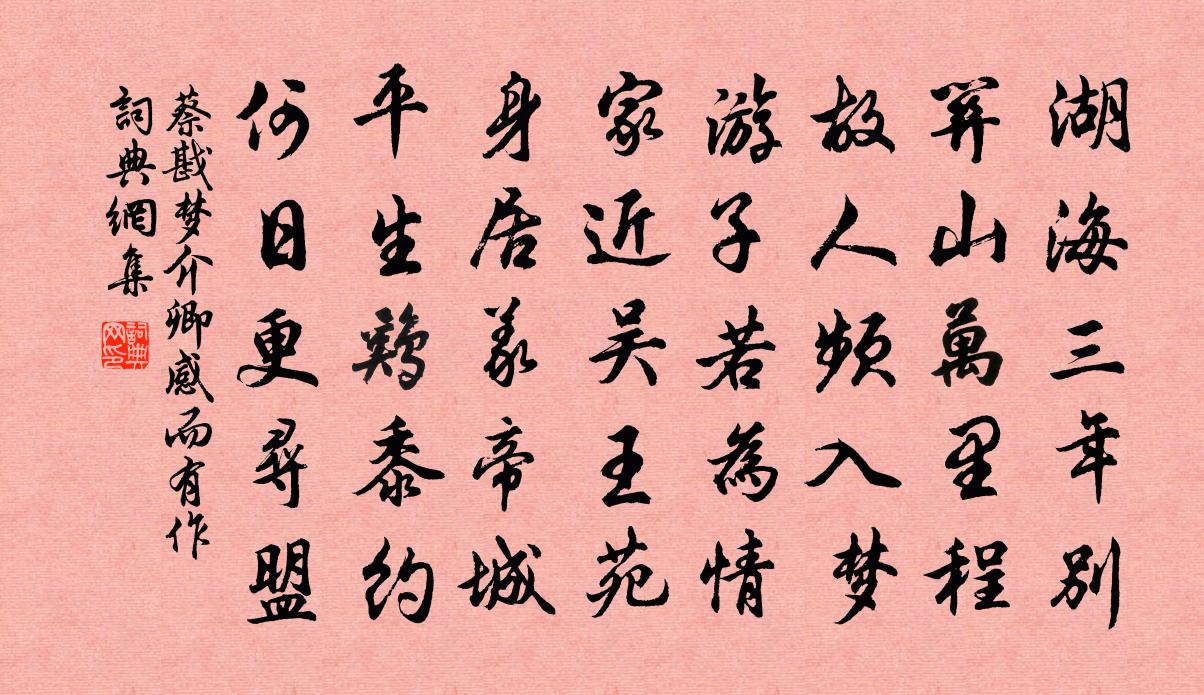 詩詞名句歷史字典書法欣賞書法字典國語詞典說文解字康熙字典古漢語字典標 題 作 者 詩 句 夢介卿感而有作作者:蔡戡 朝代:宋代夢介卿感而有作原文湖海三年別,關山萬里程。故人頻入夢,遊子若為情。家近吳王苑。身居義帝城。平生雞黍約,何日更尋盟。詩詞問答問:夢介卿感而有作的作者是誰?答:蔡戡問:夢介卿感而有作寫於哪個朝代?答:宋代問:夢介卿感而有作是什麼體裁?答:五律蔡戡夢介卿感而有作書法欣賞夢介卿感而有作書法作品詩詞推薦虞美人(揚州賣鏡,上元事也,用前韻)劉辰翁〔宋代〕徐家破鏡昏如霧。半面人間露。等閒相約是看燈。誰料人間天上、似流星。朱門帘影深深雨。憔悴新人舞。天涯海平江虞祖道寫頂相求贊釋曇華〔宋代〕枯松下,盤陀上,獨坐大方,橫按拄杖。謂是應庵,無恁相狀。謂非應庵,誰肯歸向。分付祖道,試自定當。戲鄭閩清灼艾劉克莊〔宋代〕點穴不須醫,針經手自披。既雲丹熟後,焉用火攻為。簡出創牽步,端居痛上眉。閉門功行滿,應有解飛時。初與元九別後忽夢見之及寤而書適至兼寄桐花詩…此寄白居易〔唐代〕永壽寺中語,新昌坊北分。歸來數行淚,悲事不悲君。悠悠藍田路,自去無訊息。計君食宿程,已過商山北。昨夜隱几葛紹體〔宋代〕分明歸去赤城東,依約醒來客夢中。人靜燈昏卷書坐,一窗明月一簾風。秋燈對雨寄史近崔積武元衡〔唐代〕坐聽宮城傳晚漏,起看衰葉下寒枝。空庭綠草結離念,細雨黃花贈所思。蟋蟀已驚良節度,茱萸偏憶故人期。相逢過商叟林居蒙示半村詩集及曾吉父宏父王元法趙蕃〔宋代〕結交早日類知名,豈但當年王與曾。野鶩家雞隨所嗜,玉環飛燕詎宜憎。筌蹄久矣成深悟,駑馬猶當勉未能。好取上庸張嵲〔宋代〕天將層嶂限中原,獸狀禽心類百蠻。橫木架橋來渡水,搴茅茹火去燒山。尋巫問事看龜意,帶穗收禾御歲艱。非是黎陽寄姚合賈島〔唐代〕魏都城裡曾游熟,才子齋中止泊多。去日綠楊垂紫陌,歸時白草夾黃河。新詩不覺千回詠,古鏡曾經幾度磨。惆悵春晚客懷 其六王冕〔元代〕詩酒從時適,功名委壯圖。好山隨處有,閒客近來無。冠蓋駢三輔,烽塵暗四隅。餘生營計拙,且僦好樓居。寄林少忠因為家叔再留之館王邁〔宋代〕年來師道孰尊到,溫飽何緣得浼君。鴻雁暫為粱稻計,牛羊誰為牧芻勤。琴書到處聊娛目,羽翼生時要薄雲。我偶乙巳正月過英州買得石山曾豐〔宋代〕吾之好石如好色,要須肌理膩且澤,真成入眼輕連璧。吾之好石如好聲,要須節奏婉且清,真成入耳輕連城。閩浙寄襄州程大夫陳師道〔宋代〕中年為吏晚專城,不獨身榮府亦榮。江漢風流見羊杜,相門經術有韋平。十年一別音書絕,萬里相看骨肉情。今代句張釜〔宋代〕細草疏花自在春。江城子沈與求〔宋代〕亦次韻和呈,因以自見窮寂之態華燈高宴水精宮。浪花中。意無窮。十載江湖,重綰漢符銅。應有青藜存往事,人答陳述古二首蘇軾〔宋代〕小桃破萼未勝春,羅綺叢中第一人。聞道使君歸去後,舞衫歌扇總成塵。元宵燈謎曹雪芹〔清代〕天運無功理不窮,有功無運也難逢。因何鎮日紛紛亂,因為陰陽數不通。——打一物送王鍊師鮑溶〔唐代〕聖母祠堂藥樹香,邑君承命薦椒漿。風雲大感精神地,雷雨頻過父母鄉。盡日一川侵草綠,回車二麥繞山黃。野人龐居士問馬大師圖贊釋智愚〔宋代〕藏頭露影問來由,卻把西江盡力酬。回首眼空天地窄,不知身在御街游。獨步至洛濱司馬光〔宋代〕草軟波清沙徑微,手持筇竹著深衣。白鷗不信忘機久,見我猶穿岸柳飛。名句推薦過橋分野色,移石動雲根。賈島《題李凝幽居》 嵩雲秦樹久離居,雙鯉迢迢一紙書。李商隱《寄令狐郎中》 寫不成書,只寄得、相思一點。張炎《解連環·孤雁》 以少總多,情貌無遺矣。劉勰《文心雕龍·物色》 梅落繁枝千萬片,猶自多情,學雪隨風轉。馮延巳《鵲踏枝·梅落繁枝千萬片》 十年一覺揚州夢,贏得青樓薄倖名。杜牧《遣懷》 奇卓異非至人,至人只是常。洪應明《菜根譚·概論》 連雨不知春去,一晴方覺夏深。范成大《喜晴》 相思只在,丁香枝上,豆蔻梢頭。王雱《眼兒媚·楊柳絲絲弄輕柔》 多少六朝興廢事,盡入漁樵閒話。張昪《離亭燕·一帶江山如畫》