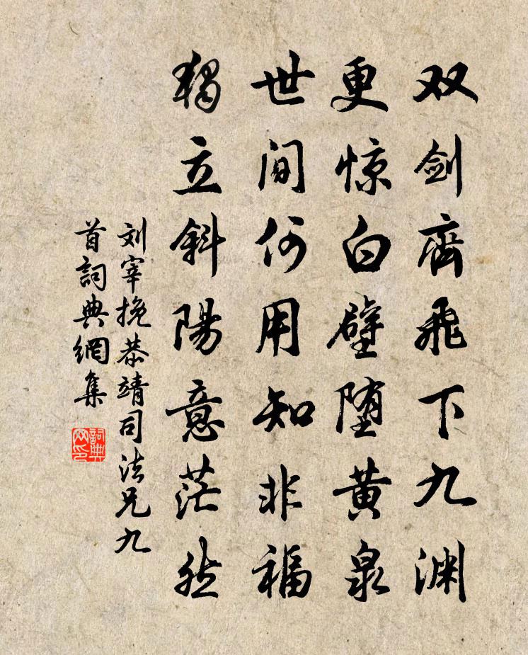 詩詞名句歷史字典書法欣賞書法字典國語詞典說文解字康熙字典古漢語字典標 題 作 者 詩 句 挽恭靖司法兄九首作者:劉宰 朝代:宋代挽恭靖司法兄九首原文雙劍齊飛下九淵,更驚白壁墮黃泉。世間何用知非福,獨立斜陽意茫然。詩詞問答問:挽恭靖司法兄九首的作者是誰?答:劉宰問:挽恭靖司法兄九首寫於哪個朝代?答:宋代劉宰挽恭靖司法兄九首書法欣賞挽恭靖司法兄九首書法作品詩詞推薦曉行聞竹雞二首楊萬里〔宋代〕一番行路一番愁,還自兒時到白頭。路不喚君君自去,為誰著急不歸休。偈頌九首釋玿〔宋代〕鵲既鳴鵲鵲,鴉則鳴鴉鴉。禾山四打鼓,趙州三吃茶。春來花處處,雲散月家家。達磨當年無板齒,祗應特地過流歸汝墳山莊留別盧象祖詠〔唐代〕淹留歲將晏,久廢南山期。舊業不見棄,還山從此辭。漚麻入南澗,刈麥向東菑。對酒雞黍熟,閉門風雪時。非君和文淑湓浦見寄王安石〔宋代〕多難漂零歲月賒,空餘文墨舊生涯。相看楚越常千里,不及朱陳似一家。發為感傷無翠葆,眼從瞻望有玄花。唯詩好事近(乘風亭作)趙彥端〔宋代〕君莫厭江鄉,也有茂林修竹。竹外有些亭榭,置酒尊棋局。棋神酒聖各成歡,歡長更燒燭。寄語故人鵬鷃,任傾金求佛哀佑釋印肅〔宋代〕母子相逢幾萬年,夕陽夢斷豈堪言。多時不隔如今見,趙州勘破老婆禪。早發吳浚〔宋代〕顥氣澄初曉,清江百丈秋。槳搖山勢動,船帶日光流。禽噪應知曙,魚沉若避鉤。閒身非復昔,征棹莫遲留。何氏悅亭詠柏黃庭堅〔宋代〕澗底長松風雨寒,岡頭老柏顏色悅。天生草木臭味同,同盛同衰見冰雪。君莫愛清江百尺船,刀鋸來謀歲寒節。千浣溪沙(黃沙嶺)辛棄疾〔宋代〕寸步人間百尺樓。孤城春水一沙鷗。天風吹樹幾時休。突兀趁人山石狠,朦朧避路野花羞。人家平水廟東頭。和傅山父小園十詠李曾伯〔宋代〕蠟英要占菊天破,玉樹須乘梅雨培。金粟如來還出世,清香不許別花開。鷓鴣天歐陽修〔宋代〕學畫宮眉細細長。芙蓉出水斗新妝。只知一笑能傾國,不信相看有斷腸。雙黃鵠,兩鴛鴦。迢迢雲水恨難忘。早知訪子威都事不遇黃清老〔元代〕清曉抱綠綺,來就夫君彈。夫君久已出,野水流花間。石澗度微雨,秋生湖上山。松陰坐永日,心與雲俱閒。人事玉樓春李邴〔宋代〕一年適盡蓮花漏,翠井屠蘇沈凍酒。盧北山元夕陳藻〔宋代〕社屋相忘鼓笛鳴,空村步月興堪乘。何須更要鰲山立,野燒天邊勝看燈。挽張郴州四首曾豐〔宋代〕鴻漸南中掾,鶯喬西外丞。華途於此奮,厄算乃吾乘。妙學家傳缽,殊科世續燈。茲其有以死,名死實何曾。水調歌頭(和馬觀復石頭渡寄韻)劉辰翁〔宋代〕明月隔千里,風動帳紋開。故人錦字如夢,夢轉雁初來。倚遍西山朝爽,行過石頭舊渡,久別忽經懷。不得與之語題槐翁承贊〔唐代〕雨中妝點望中黃,句引蟬聲送夕陽。憶昔當年隨計吏,馬蹄終日為君忙。暮春始聞雷陳普〔宋代〕倉庚杜宇已喧卑,出地奔空獨爾遲。六合中間皆起處,一更前後恰來時。吝蝸封閉俄驚破,迷蝶沈酣恐未知。菌蠢信題趙蕃〔宋代〕假日成愒日,朝酲還暮酲。余寒猶未去,破褐尚留情。野樹梅花落,空庭春草生。得閒聊信筆,不復強為名。項里觀楊梅陸游〔宋代〕山中戶戶作梅忙,火齊驪珠入帝鄉。細織筠籠相映發,華清虛說荔枝筐。名句推薦量入以為出戴聖《禮記·王制》 獨行潭底影,數息樹邊身。賈島《送無可上人》 客里相逢,籬角黃昏,無言自倚修竹。姜夔《暗香疏影》 貧而無諂,富而無驕孔子弟子《論語·學而篇》 清風明月苦相思,盪子從戎十載餘。王維《伊州歌》 萬里妾心愁更苦,十春和淚看嬋娟。華清淑《望江南·燕塞雪》 夕陽牛背無人臥,帶得寒鴉兩兩歸。張舜民《村居·水繞陂田竹繞籬》 淡淡梅花香欲染,絲絲柳帶露初乾。曹雪芹《香菱詠月·其二》 人心統耳目官骸,而於百體為君,必隨處見神明之宰王永彬《圍爐夜話·第十二則》 金樽清酒斗十千,玉盤珍羞直萬錢。李白《行路難·其一》