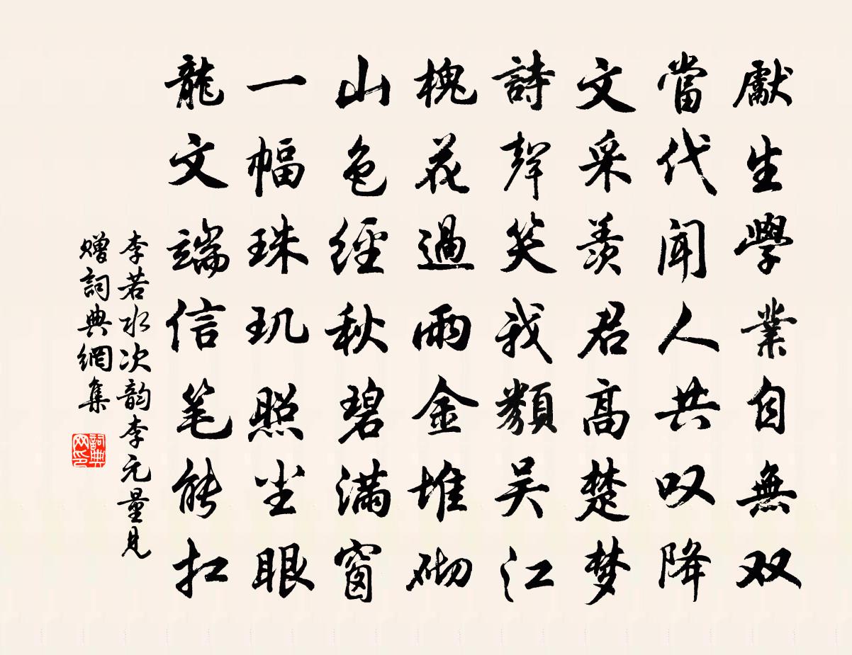 詩詞名句歷史字典書法欣賞書法字典國語詞典說文解字康熙字典古漢語字典標 題 作 者 詩 句 次韻李元量見贈作者:李若水 朝代:宋代次韻李元量見贈原文先生學業自無雙,當代聞人共嘆降。文采羨君高楚夢,詩聲笑我類吳江。槐花過雨金堆砌,山色經秋碧滿窗。一幅珠璣照塵眼,龍文端信筆能扛。詩詞問答問:次韻李元量見贈的作者是誰?答:李若水問:次韻李元量見贈寫於哪個朝代?答:宋代李若水次韻李元量見贈書法欣賞次韻李元量見贈書法作品詩詞推薦頌古十首釋師體〔宋代〕不見人斑見虎斑,算來莫願風隊斑。虎斑見後通迴避,唯有人斑近最難。酬盈祖中散韓維〔宋代〕勇脫塵冠尚壯年,高齋圖史日蕭然。不教歌舞家規在,善作文章世學傳。道舊每思傾濁酒,仰高徒覺愧華顛。相君題山石陳知柔〔宋代〕山花有空相,江月多清暉。野意寫不盡,微吟浩忘歸。再和昌言喜雪韓維〔宋代〕精禱潛通上下神,恍然佳氣一朝新。隆樓傑閣偏宜曉,杭木殘荄盡變大師傅。有客裁詩傳錦段,誰家度曲試朱唇。歲在癸丑年始七十年正旦日書事富弼〔宋代〕人生七十古來稀,今日愚年已及期。從此光陰猶不測,只應天道始相知。和謝吏部鐵字韻三十四首自敘三首鄧肅〔宋代〕萬物紛紛一馬耳,百川不同均一水。不將彼是作殊觀,坐使須彌納芥子。李白高視空無人,審言更作牙官嗔。可憐登湘陰北寺江亭孔武仲〔宋代〕古縣峨新剎,孤亭占上頭。野苔侵坐綠,江水帶天流。絲斷湘靈瑟,苹荒帝子洲。人寰真是夢,頃刻已千秋。慚愧晁說之〔宋代〕神邑凡才日抗塵,早年聞道晚因循。腦能充溢無華發,心得休閒不老身。種種已慚為客子,悠悠更愧作官人。吾言送刪定聞人丈歸嘉禾汪應辰〔宋代〕漫作中都士,柴門每自扃。遺經究終始,奇字講聲形。前輩今無幾,微言世莫聽。扁舟轉河貢,已見故山青。鵲橋仙(七夕和蘇堅韻)蘇軾〔宋代〕乘槎歸去,成都何在,萬里江沱漢漾。與君各賦一篇詩,留織女、鴛鴦機上。還將舊曲,重賡新韻,須信吾儕天放采芑詩陳舜俞〔宋代〕采采原上芑,盈襜不知多。惜共藜藿稱,命與羹糝和。值此行役間,遺餘雜蓁莪。京洛夸肥甘,掇擷繄誰何。休官賢者之孝二百四十首寇祖訓林同〔宋代〕必如寇祖訓,始不死其親。孟德空遺令,丕乎真罪人。減字木蘭花(九日)陳師道〔宋代〕清尊白髮。曾是登臨年少客。不似當年。人與黃花兩並妍。來愁去恨。十載相看情不盡。莫更思量。夢破春回枉斷南鄉子 水火互動既濟王吉昌〔元代〕坎內一陽停。本性澄清照物形。真火炎炎功足顯,叮嚀。既濟氤氳緝寶瓶。神用奮威靈。氣證升沈聚戊癸。日耀飛詩二首方回〔宋代〕一牝猶嫌將兩雄,趨新背舊片時中。陡忘前主能為叛,乍事他人更不忠。玉碗空亡無易馬,絳桃猶在未隨風。何須鶴警露陳季〔唐代〕南國商飆動,東皋野鶴鳴。溪松寒暫宿,露草滴還驚。欲有高飛意,空聞召侶情。風間傳藻質,月下引清聲。未假前村梅方蒙仲〔宋代〕何緣春信息,第一到田家。為甚笙歌院,重重繡幕遮。書詩隱何元仲詩卷廖行之〔宋代〕相馬玄黃牝牡,斲輪甘苦疾徐。元亮得琴中趣,彌明非世間書。送太平州張府判鈔庫官還任方回〔宋代〕判州垂闊步,筦庫忽斜飛。談笑胸無物,精神眼有威。將門生貴種,詩域悟玄機。捉月江頭路,吟鞍幾醉歸。答友人贈烏紗帽李白〔唐代〕領得烏紗帽,全勝白接蘺。山人不照鏡,稚子道相宜。名句推薦木葉紛紛下,東南日煙霜。劉昚虛《暮秋揚子江寄孟浩然》 仁也者,人也。合而言之,道也。孟子《孟子·盡心章句下·第十六節》 人之初,性本善。性相近,習相遠。王應麟《三字經·全文》 出其東門,有女如雲。佚名《出其東門》 已駕七香車,心心待曉霞。李商隱《壬申七夕》 那堪疏雨滴黃昏。更特地、憶王孫。歐陽修《少年游·欄乾十二獨憑春》 學者非必為仕,而仕者必如學。荀子《荀子·大略》 梓匠輪輿,能與人規矩,不能使人巧。孟子《孟子·盡心章句下·第五節》 四百年來成一夢,堪愁。王安石《南鄉子·自古帝王州》 心欲小而志欲大,智欲員而行欲方劉安及其門客《淮南子·主術訓》