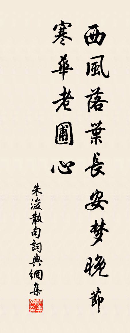 詩詞名句歷史字典書法欣賞書法字典國語詞典說文解字康熙字典古漢語字典標 題 作 者 詩 句 句作者:朱浚 朝代:宋代句原文西風落葉長安夢,晚節寒華老圃心。詩詞問答問:句的作者是誰?答:朱浚問:句寫於哪個朝代?答:宋代朱浚句書法欣賞句書法作品詩詞推薦滿庭芳 離苦海,贈張二官馬鈺〔元代〕人喜成人生兒,誰成人知替你,成人被他奪了成人精神。系伊心意,唯恐不成人。養大留心何處,惜妻男、忘了伊河傳·燕颺顧夐〔唐代〕燕颺,晴景。小窗屏暖,鴛鴦交頸。菱花掩卻翠鬟欹,慵整,海棠簾外影。繡幃香斷金鸂鶒,無訊息。心事空相憶次韻李判官見贈李石〔宋代〕須髯殘雪兀陳編,煬者何由更避煙。榮宦君方收晚歲,論交我亦得忘年。佐州相與營杯水,有路從今出瓮天。一日落花郝經〔元代〕彩雲紅雨暗長門,翡翠枝余萼綠痕。桃李東風蝴蝶夢,關山明月杜鵑魂。玉闌煙冷空千樹,金谷香銷漫一尊。狼籍夜宿郁木福地尚羊明月間遐想仙風得五十六字羅與之〔宋代〕騎氣乘雲事已灰,娟娟野月照蒼苔。自憐不及壇前古,曾遇仙翁躡屐來。浣溪沙趙必〔宋代〕只為相思怕上樓。離鶯一操恨悠悠。十二翠屏煙篆冷,曉窗秋。繡線未拈心已懶,花箋欲寄寫還羞。懊恨郎邊無個依韻和陳成伯著作長壽雪會邵雍〔宋代〕瓊苑群花一夜新,瑤台十二玉為塵。城中竹葉涌增價,坐上楊花盛學春。時會梁園皆墨客,誰思姑射有神人。餘糧南鄉子 壽何聰山劉敏中〔元代〕瑞雪夜來晴。和氣歡聲滿鳳城。雪裡梅花開更好,分明。要見和羹事業成。東閣此時晴。慶在春風瀲灩觥。陰德自虎號南山黃庭堅〔宋代〕一章虎號南山,北風雨雪。百夫莫為,其下流血。相彼 * ,幾何不虎。父子相戒,是將食汝。二章伊彼大吏,易句程敦厚〔宋代〕一色鮮猩血。伯父《送先人下第歸蜀》詩云︰人稀野店休安蘇軾〔宋代〕乞墦何足羨,負米可忘艱。莫為無車馬,含羞入劍關。馬郎婦贊釋惟一〔宋代〕雲開天竺,月照金沙。心心妙法,念念蓮華。示必將身許馬家。和昭文相公上巳宴歐陽修〔宋代〕一雨初消九陌塵,秉蘭修禊及芳辰。恩深始錫龍池宴,節正須知鳳歷新。紅琥珀傳杯瀲灩,碧琉璃瑩水奫淪。上林儒生陸游〔宋代〕儒生安義命,所遇委之天。用可重九鼎,窮寧直一錢?雖雲發種種,未害腹便便。高臥茅檐下,羹藜法不傳。隔浦蓮白居易〔唐代〕隔浦愛紅蓮,昨日看猶在。夜來風吹落,只得一回採。花開雖有明年期,復愁明年還暫時。讀晚唐詩有感王義山〔宋代〕學詩莫學晚唐詩,學得晚唐非盛時。願把鳧鷖和既醉,翻騰韻語作今詩。減字木蘭花(鄭尚書席上借前韻)林淳〔宋代〕嫣然笑粲。醉靨融滋春意爛。侍宴終宵。歡動簾幃酒易消。尊前狂客。驚見蕊仙新謫籍。珠閣深關。丹就同歸海上長思仙 贈眾女姑馬鈺〔元代〕女姑聽。女姑聽。學取 * 至淨清。依他妙善行。莫惺惺。莫惺惺。外做憨痴內自靈。功成赴玉京。次胡濟鼎同年三律曹涇〔宋代〕共是金明衣綠郎,梅仙風致壓仇香。人如紫鳳儀丹閣,誰則青蚨涴錦囊。洛社菜羹時不禁,雪堂斗酒夜宜良。至尊同李五夕次香山精舍訪憲上人錢起〔唐代〕彼岸聞山鍾,仙舟過苕水。松門入幽映,石徑趨迤邐。初月開草堂,遠公方覯止。忘言在閒夜,凝念得微理。泠泠名句推薦無人解,樹轉午陰涼舒頔《小重山·端午》 恨入空帷鸞影獨,淚凝雙臉渚蓮光,薄情年少悔思量。顧敻《浣溪沙·荷芰風輕簾幕香》 境難足於心,盡行放下,則未有不足矣。王永彬《圍爐夜話·第一一三則》 淒淒歲暮風,翳翳經日雪。陶淵明《癸卯歲十二月中作與從弟敬遠》 歌泣不成天已暮,悲風日夜起江生。魏禧《登雨花台》 奉君金卮之美酒,玳瑁玉匣之雕琴。鮑照《擬行路難·其一》 其餘七匹亦殊絕,迥若寒空動煙雪。杜甫《韋諷錄事宅觀曹將軍畫馬圖》 田舍清明日,家家出火遲。王建《寒食》 望斷金馬門,勞歌采樵路。孟浩然《田園作》 秦地羅敷女,採桑綠水邊。李白《子夜吳歌·春歌》