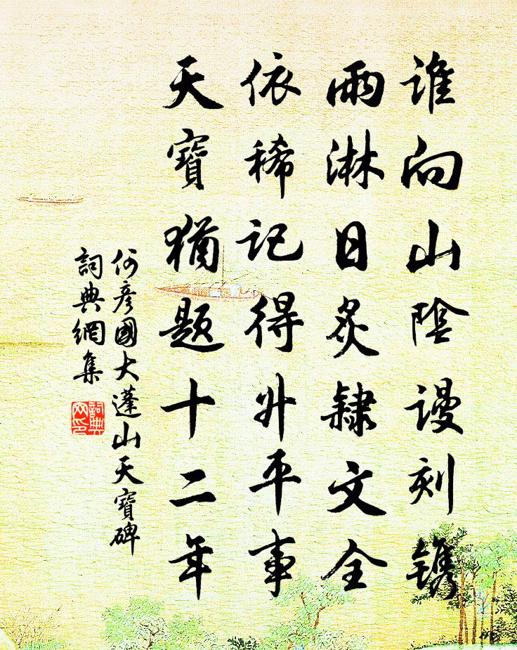 詩詞名句歷史字典書法欣賞書法字典國語詞典說文解字康熙字典古漢語字典標 題 作 者 詩 句 大蓬山天寶碑作者:何彥國 朝代:宋代大蓬山天寶碑原文誰向山陰謾刻鐫,雨淋日炙隸文全。依稀記得昇平事,天寶猶題十二年。詩詞問答問:大蓬山天寶碑的作者是誰?答:何彥國問:大蓬山天寶碑寫於哪個朝代?答:宋代何彥國大蓬山天寶碑書法欣賞大蓬山天寶碑書法作品詩詞推薦石佛釋了演〔宋代〕積念有年瞻石佛,今朝一見絕疑猜。都盧面目只如此,卻道三生鑿出來。渡江雲三犯·西湖清明吳文英〔宋代〕羞紅顰淺恨,晚風未落,片繡點重茵。舊堤分燕尾,桂棹輕鷗,寶勒倚殘雲。千絲怨碧,漸路入、仙塢迷津。腸漫溪閣呈陸太初方回〔宋代〕臨水看山日百遍,等閒收拾有詩才。老松於我幾年長,啼鳥無名何處來。病發漸應雕翠葆,衰蹤那復夢金台。鷫鸘嚴慶胄射策南歸迂途相訪六月二十有一日同游張栻〔宋代〕炎暑盛三伏,駕言得清游。城南才里所,便有山林幽。崇蓮炫平堤,修竹綠高丘。方茲閔雨辰,亦有清泉流。舉肉贈小鐵面王相士真德秀〔宋代〕君以鐵面名,自謂相人軟語。我亦鐵心人,不把窮通來問汝。獨有一事欲扣君,學海無底難窮尋。幾時鐵拳透鐵壁和洪與權王令〔宋代〕溝中老弱轉流屍,夫不容妻母棄兒。常得民愚猶是幸,不然死等更何為。布衣空有蒿萊淚,肉食方多妾馬思。君也臨江仙辛棄疾〔宋代〕冷雁寒雲渠有恨,春風自滿余懷。更教無日不花開。未須愁菊盡,相次有梅來。多病近來渾止酒,小槽空壓新醅。次韻子由書李伯時所藏韓乾馬蘇軾〔宋代〕潭潭花古屋雲幕花垂,省中文花如亂絲。忽見伯時畫天馬,朔風胡沙生落錐。天馬西來從西極,勢與落日爭分馳。江上望靈石李處權〔宋代〕似聞環佩雜簫笙,鼎立爭雄凜太清。不與古今爭變化,可能舒慘屬陰晴。花開玉井難求種,月下瑤台但有名。我亦擬古 其五陶淵明〔魏晉〕東方有一士,被服常不完;三旬九遇食,十年著一冠。辛勤無此比,常有好容顏。我欲觀其人,晨去越河關。青松贊歷代天師第十二代諱仲常字德潤白玉蟾〔宋代〕鶴書曾詔赴宸京,歸作分形化景人。昨日飲酣曾吐酒,醒來又薄瓮頭春。棄屣有感廖行之〔宋代〕蹈遍關山日幾西,周旋步武鎮相依。居貧原憲履長決,戰罷吳王屨不歸。已類憊靴無復召,空慙釋屩頓成非。塵勞論語絕句一百首張九成〔宋代〕行道嗟吾已矣夫,仲由從我去乘桴。果然子路聞之喜,好勇如由亦自無。白牡丹張明中〔宋代〕看詩醉眼便醒蘇,索句吟花一字無。虢國夫人呈素麵,滕家仙子削瓊膚。姚黃於後貪妖冶,魏紫逢君用夾扶。試問試毗陵周壽墨池樣筆楊萬里〔宋代〕舊來雞距說宣城,近來墨池說毗陵。不知阿誰喜柔懦,毛穎只今泥樣軟。筆頭政要挽千釣,渠自無力隨人轉。兔尖酬趙侍御王建〔唐代〕年少同為鄴下游,閒尋野寺醉登樓。別來衣馬從勝舊,爭向邊塵滿白頭。次韻王無競見寄姚孝錫〔宋代〕客懷重倚仲宣樓,白草黃雲塞上秋。山色不隨塵世改,水聲還抱故城流。隙中畏景那堪玩,鏡里衰顏只自羞。多愧思婦吟蘇拯〔唐代〕秋風雁又歸,邊信一何早。攬衣出門望,落葉滿長道。一從秉箕帚,十載孤懷抱。可堪日日醉寵榮,不說思君令人二十八日雪二十九日未已賦詩凡五首趙蕃〔宋代〕臘里逢三白,詩中得數書。書生真有癖,習氣果難除。更上高樓望,聊將遠目舒。天災如可弭,凍死未憂余。頌古釋道顏〔宋代〕三腳驢子忒{左日右煞}好,長放後園教喫草。等閒牽出向人前,踢倒湖南瞎長老。名句推薦瘦葉幾經雪,淡花應少春。於武陵《贈賣松人》 耕夫召募愛樓船,春草青青萬項田;張繼《閭門即事》 楚江湄,湘娥乍見,無言灑清淚周密《繡鸞鳳花犯·賦水仙》 欲寫彩箋書別怨。淚痕早已先書滿。晏幾道《蝶戀花· * 開時傷聚散》 分手脫相贈,平生一片心。孟浩然《送朱大入秦》 柏府樓台銜倒影,茅茨松竹瀉寒聲。王守仁《次韻陸僉憲元日春晴》 欲心難厭如溪壑,財物易盡若漏卮。程登吉《幼學瓊林·卷三·人事》 來如春夢幾多時?去似朝雲無覓處。白居易《花非花》 荷花嬌欲語,愁殺蕩舟人。李白《淥水曲》 一聲梧葉一聲秋,一點芭蕉一點愁,三更歸夢三更後。徐再思《水仙子·夜雨》