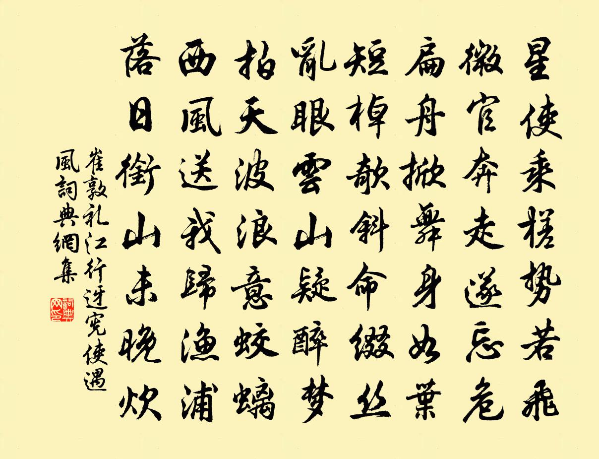 詩詞名句歷史字典書法欣賞書法字典國語詞典說文解字康熙字典古漢語字典標 題 作 者 詩 句 江行迓憲使遇風作者:崔敦禮 朝代:宋代江行迓憲使遇風原文星使乘槎勢若飛,微官奔走遂忘危。扁舟掀舞身如葉,短棹欹斜命綴絲。亂眼雲山疑醉夢,拍天波浪意蛟螭。西風送我歸漁浦,落日銜山未晚炊。詩詞問答問:江行迓憲使遇風的作者是誰?答:崔敦禮問:江行迓憲使遇風寫於哪個朝代?答:宋代崔敦禮江行迓憲使遇風書法欣賞江行迓憲使遇風書法作品詩詞推薦定風波張孝祥〔宋代〕鈴索聲乾夜未央。曲闌花影步淒涼。莫道嶺南冬更暖。君看。梅花如雪月如霜。見說牆西歌吹好,玉人扶坐勸飛觴淳熙四年二月既望靜江守臣張某奉詔勸農於郊張栻〔宋代〕嗟樂父老,其告其喻。爾之有生,君實覆汝。勸農和孟大監韻朱宗強〔宋代〕祥開龍角應三農,小隊旌旗獵獵風。秧馬趣行田陌外,檣烏飛送櫓聲中。穰翁預喜甌窶滿,饁婦毋憂杼軸空。觀稼城南王氏莊尋梅陸游〔宋代〕涸池積槁葉,茆屋圍疏籬。可憐庭中梅,開盡無人知。寂寞終自香,孤貞見幽姿。雪點滿綠苔,零落尚爾奇。我來大衍易吟四十首方回〔宋代〕謙卑六位得,豫樂四爻非。莊敬與安肆,冥冥禍福幾。賦秋鴻送劉衡州梅堯臣〔宋代〕秋鴻整羽翮,去就自因時。往春南方來,遂止天泉池。天泉水清泚,鴛鷺日追隨。蒲藻豈不樂,江湖信所宜。今朝潁陽別元丹丘之淮陽李白〔唐代〕吾將元夫子,異姓為天倫。本無軒裳契,素以煙霞親。嘗恨迫世網,銘意俱未伸。松柏雖寒苦,羞逐桃李春。悠悠送葉蒙赴舉貫休〔唐代〕年年屈復屈,惆悵曲江湄。自古身榮者,多非年少時。空囊投刺遠,大雪入關遲。來歲還公道,平人不用疑。含山店夢覺作韋莊〔唐代〕曾為流離慣別家,等閒揮袂客天涯。燈前一覺江南夢,惆悵起來山月斜。頌古一百則釋正覺〔宋代〕覿面來時作者知,可中石火電光遲。輸機謀主有深意,欺敵兵家無遠思。發必中,更謾誰。腦後見腮兮人難觸犯,賦得江邊草李中〔唐代〕岸春芳草合,幾處思 * 。向暮江蘺雨,初晴杜若煙。靜宜幽鷺立,遠稱碧波連。送別王孫處,萋萋南浦邊。歲晚次韻答李在明戴表元〔宋代〕墨鄉守墨不作惡,歲晚左就醉鄉公。何人吾伊驚夜半,大雪北窗歌國風。谷隱寺李廌〔宋代〕挈巢江湖去,端為山水癖。朅來谷隱游,契我賞心適。寒江渺平楚,復嶺轉層壁。誰與龍象筵,一掃狐兔跡。彩雲秋晚雜書三十首方回〔宋代〕昔聞有烈士,哀歌缺唾壺。衰暮心不已,徇名殆忘軀。我老詎復爾,一壑不願余。外物百無嗜,惟喜讀我書。空樽邑人張孝友親歿廬墓六年有五色鳥集墓隴邑大徐洪〔宋代〕孝友聞張仲,貽謀直到今。六年枯血淚,五色集祥禽。表此勵頹俗,來茲生孝心。移風名不忝,茂宰意良深。腳婆王炎〔宋代〕竹奴夏日涼,腳婆冬夜燠。二物不同時,皆堪伴幽獨。自吾失伉儷,一紀誰與宿。年高氣血衰,日短天地肅。魚眼送於中丞使北蕃雍陶〔唐代〕朔將引雙旌,山遙磧雪平。經年通國信,計日得蕃情。野次依泉宿,沙中望火行。遠雕秋有力,寒馬夜無聲。看獵海上春夕旅懷寄左偃李中〔唐代〕柳過清明絮亂飛,感時懷舊思淒淒。月生樓閣雲初散,家在汀洲夢去迷。發白每慚清鑒啟,酒醒長怯子規啼。北山贛守張子智舍人寄詩送酒,和韻謝之楊萬里〔宋代〕誰言天上張公子,飛下崆峒看曉晴。為愛東坡題八境,卻同嚴助厭承明。詩來風雨荒涼後,語帶江山紫翠橫。更遣【南呂】一枝花_題東湖纖雲任昱〔元代〕題東湖纖雲曳曉紅,遠樹團晴翠。好山如鳳凰,新水似琉璃,巧畫屏幃。壯觀蓬萊地,東湖景最奇。兩三行鷗鷺清名句推薦家童掃蘿徑,昨與故人期。錢起《谷口書齋寄楊補闕》 花氣襲人知驟暖,鵲聲穿樹喜新晴。陸游《村居書喜》 西城楊柳弄春柔。動離憂。淚難收。秦觀《江城子·西城楊柳弄春柔》 錦里開芳宴,蘭缸艷早年。盧照鄰《十五夜觀燈》 茶者,南方之嘉木也,一尺二尺,乃至數十尺。其巴山峽川有兩人合抱者,伐而掇之陸羽《茶經·一之源》 紫黯紅愁無緒,日暮春歸甚處?龔自珍《如夢令·紫黯紅愁無緒》 商女不知亡國恨,隔江猶唱後庭花。杜牧《泊秦淮》 事君數,斯辱矣;朋友數,斯疏矣。孔子弟子《論語·里仁篇》 小橋橫截,缺月初弓。辛棄疾《沁園春·靈山齋庵賦時築偃湖未成》 烏絲闌紙嬌紅篆,歷歷春星。納蘭性德《紅窗月·燕歸花謝》