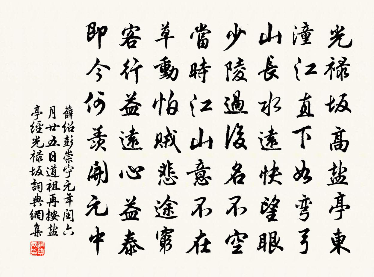 詩詞名句歷史字典書法欣賞書法字典國語詞典說文解字康熙字典古漢語字典標 題 作 者 詩 句 崇寧元年閏六月廿五日道祖再按鹽亭經光祿坂作者:薛紹彭 朝代:宋代原文光祿坂高鹽亭東,潼江直下如彎弓。山長水遠快望眼,少陵過後名不空。當時江山意不在,草動怕賊悲途窮。客行益遠心益泰,即今何羨開元中。詩詞問答問:《崇寧元年閏六月廿五日道祖再按鹽亭經光祿坂》的作者是誰?答:薛紹彭問:該詩寫於哪個朝代?答:宋代書法欣賞崇寧元年閏六月廿五日道祖再按鹽亭經光祿坂書法作品詩文賞析【原題】:崇寧元年閏六月廿五日道祖再按鹽亭經光祿坂留題頓軒詩詞推薦君莫惡行晁說之〔宋代〕寂寂山城已過春,黃鸝紫椹意相親。天公柰何不肯雨,小麥含秀安得吐。聞道天公大仁聖,風伯何能回雨令。恐是雪後過南坡虞儔〔宋代〕扶桑暖翅接金懷,鞲上飢鷹待一呼。懸滴梅梢珠璀璨,墮花檜頂粉模糊。明年翠浪麥須好,何處青簾酒可酤。萬里樵青歌 為黃仙裳作杜濬〔清代〕當時同學十數人,兩人引頸先朝露。一人萬里足重繭,一個入海隨煙霧。三人滅跡逃空門,四人牆東長閉戶。一人袷饗太廟佚名〔宋代〕瑟彼良玉,薦於明靈。宸襟蠲潔,郁鬯芬馨。牲牢在俎,金石在庭。莫重者裸,慈嘏來寧。晚步陸游〔宋代〕晚步清溪上,微陰忽快晴。鴉棲先小泊,魚暖已群行。藥餌扶垂老,耕桑樂太平。非關戀鄉社。久客倦遐征。壽倅生辰楊簡〔宋代〕方飲屠蘇慶歲元,五開歷草又生賢。沈檀鬭品來樽底,梅竹交光闖水邊。好把緋魚追舊事,肯同螃蟹話當年。聖賢諸瑩拜掃晚歸長汀樓鑰〔宋代〕雨意早垂垂,寒雲晚更低。空中時散點,道上不成泥。綠柳桃相映,黃花麥與齊。迂迴余百里,喜見舊松堤。燭影搖紅 警善惡王吉昌〔元代〕大道門開,正當甲子天元數。三清仙院列名科,精選須超度。此出幽人理悟。棄榮華、浮雲不顧。鑿開圓覺,打破秋霽(雲麓園長橋)吳文英〔宋代〕一水盈盈,漢影隔游塵,淨洗寒綠。秋沐平煙,日回西照,乍驚飲虹天北。彩闌翠馥。錦雲直下花成屋。試縱目。詠興五首。出府歸吾廬白居易〔唐代〕出府歸吾廬,靜然安且逸。更無客乾謁,時有僧問疾。家僮十餘人,櫪馬三四匹。慵發經旬臥,興來連日出。出遊巴江秋夕釋保暹〔宋代〕巴水寒聲去渺茫,半空雲樹落秋光。離人此夜和愁宿,不聽啼猿亦斷腸。放生慈濟法門釋遵式〔宋代〕我比丘某甲,今為傍生類。發佛大慈悲,懺彼六情根。無始業障海,眼根著諸色。耳界聞亂聲,鼻染一切香。舌生苦雨憶皇甫冉錢起〔唐代〕涼雨門巷深,窮居成習靜。獨吟愁霖雨,更使秋思永。疲痾苦昏墊,日夕開軒屏。草木森已悲,衾幬清且冷。如何融堂對月錢時〔宋代〕蠻觸封疆奈若何,天公老眼自驅磨。六窗洞徹無遮障,此夜融堂得月多。得僧書鮑溶〔唐代〕身歸紫霄嶺,書下白雲來。翦筍發寒字,燒花芳夜雷。想隨香馭至,不假定鍾催。鷓鴣天(和嚴倅二秦同集席上賦)丘崈〔宋代〕懷抱環奇懶叩閽。朝陽獨賦遠人村。即看飛下芝封詔,會見趣歸金馬門。今夕飲,拼濡裙。一時尊俎盡詩人。唯餘曾徽言運判出張生所畫馬陳與義〔宋代〕槃礴解衣處,胸中應不群。未呈千里足,空見五花文。良樂世難有,驥駑誰與分。高才喜能事,故遣畫蘭筋。予好把酒常以小戶為苦戲述陸游〔宋代〕我非惡旨酒,好飲而不能。方其臨觴時,直欲舉斗升。若有物制之,合龠已不勝。豈獨觀者笑,心亦甚自憎。正如黃注昆仲赴舉宋祁〔宋代〕君家日下有高名,驥子雙馳嗣世靈。滄海賦毫多灑白,南山書簡偏蒸青。縣歌酒釂催鳴鹿,學舍綀寒亂散螢。崑玉蝶戀花(送岳明州)丘崈〔宋代〕鼓吹東方天欲曉。打徹伊州,梅柳都開了。盡道鄞江春許早。使君未到春先到。號令只憑花信報。旗壘精明,家世名句推薦春風桃李花開日,秋雨梧桐葉落時。白居易《長恨歌》 知不知,尚矣;不知知,病也。聖人不病,以其病病。夫唯病病,是以不病。老子《老子·德經·第七十一章》 楊柳陰陰細雨晴,殘花落盡見流鶯。武元衡《春興》 聞道春還未相識,走傍寒梅訪訊息。李白《早春寄王漢陽》 舉物而暗,無務博聞。墨子《墨子·02章 修身》 遙看孟津河,楊柳郁婆娑。佚名《折楊柳歌辭五首》 懷春情不斷,猶帶相思舊子。吳文英《丁香結·夷則商秋日海棠》 游女昔解佩,傳聞於此山孟浩然《萬山潭作》 葉落風不起,山空花自紅。陳師道《妾薄命·為曾南豐作》 雖有天下易生之物也,一日暴之,十日寒之。未有能生者也。孟子《孟子·告子章句上·第九節》