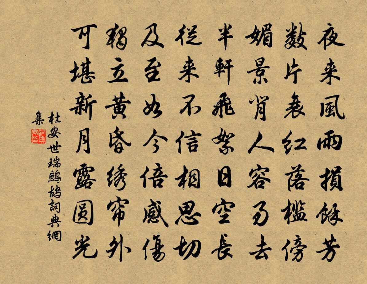 詩詞名句歷史字典書法欣賞書法字典國語詞典說文解字康熙字典古漢語字典標 題 作 者 詩 句 瑞鷓鴣作者:杜安世 朝代:宋代瑞鷓鴣原文夜來風雨損餘芳。數片衰紅落檻傍。媚景背人容易去,半軒飛絮日空長。從來不信相思切,及至如今倍感傷。獨立黃昏繡簾外,可堪新月露圓光。詩詞問答問:瑞鷓鴣的作者是誰?答:杜安世問:瑞鷓鴣寫於哪個朝代?答:宋代問:瑞鷓鴣是什麼體裁?答:詞杜安世瑞鷓鴣書法欣賞瑞鷓鴣書法作品詩詞推薦登鹹陽北寺樓(一作登感化寺樓)張籍〔唐代〕高秋原上寺,下馬一登臨。渭水西來直,秦山南向深。舊宮人不住,荒碣路難尋。日暮涼風起,蕭條多遠心。南秦雪白居易〔唐代〕往歲曾為西邑吏,慣從駱口到南秦。三時雲冷多飛雪,二月山寒少有春。我思舊事猶惆悵,君作初行定苦辛。任賴達奚侍郎夫人寇氏輓詞二首王維〔唐代〕束帶將朝日,鳴環映牖辰。能令諫明主,相勸識賢人。遺掛空留壁,回文日覆塵。金蠶將畫柳,何處更知春。女史夜聞賈常州崔湖州茶山境會想羨歡宴因寄此詩白居易〔唐代〕遙聞境會茶山夜,珠翠歌鐘俱繞身。盤下中分兩州界,燈前合作一家春。青娥遞舞應爭妙,紫筍齊嘗各斗新。自嘆輯陶句送胡仲方東歸四首項安世〔宋代〕淒淒風露交,落葉滿長陌。荊扉晝常閉,寂寂無行跡。東方有一士,素袍深可惜。時復墟曲中,載醪祛所惑。遙遙永同歡仲殊〔宋代〕繡簾卷,沉煙細。燕堂深,玳筵初啟。庭下芝蘭,勸金卮,有多少雍容和氣。孔明曾鞏〔宋代〕稱吳稱魏已紛紛,渭水西邊獨漢臣。平日將軍不三顧,尋常田裡帶經人。水調歌頭吳潛〔宋代〕皎月亦長有,今夜獨娟娟。浮雲萬里收盡,人在水晶奩。矯首銀河澄澈,搔首金風浩蕩,毛髮亦冷然。宇宙能空闊賜第登樓鄭清之〔宋代〕桃李漫山不是春,紛紛蜂蝶趁遊人。梅花已帶春歸了,分付垂楊浥露塵。陳文懿公輓詞樓鑰〔宋代〕宅相惟公久,伊余忝後塵。十年追桂籍,兩禁踵詞臣。接武參吾舅,承顏奉老親。幸成三學士,何意失斯人。奉使契丹二十八首其二十一李公麟陽關圖二絕蘇轍〔宋代〕百年摩詰陽關語,三疊嘉榮意外聲。誰遣伯時開縞素,蕭條邊思坐中生。採桑度民歌〔南北朝〕蠶生春三月,春桑正含綠。女兒采春桑,歌吹當春曲。冶遊採桑女,盡有芳春色。姿容應春媚,粉黛不加飾。系條最能行杜甫〔唐代〕峽中丈夫絕輕死,少在公門多在水。富豪有錢駕大舸,貧窮取給行艓子。小兒學問止論語,大兒結束隨商旅。欹帆與演侍者釋正覺〔宋代〕白鷗定怪盟事寒,杖藜投社不多難。葦風華雪秋著岸,船月蓬霜夜轉灘。丘壑身心徒役夢,江湖臭味賦游般。它時後後閣端午貼子詞五首真德秀〔宋代〕過端辰又是誕辰,天家風物鎮長新。六宮競獻長生縷,一縷應期一萬春。泰山汪元量〔宋代〕敕使聯鑣上翠岑,飛泉躍澗吼雷音。凌高一覽知天遠,迂曲千蹊覺洞深。龍蟄滄溟蛟舞壑,梟橫碧落鳳歸林。山靈句李沖元〔宋代〕窄逕隨溪轉,懸崖帶蘚斑。京路夜發詩謝朓〔南北朝〕擾擾整夜裝。肅肅戒徂兩。曉星正寥落。晨光復泱漭。猶沾余露團。稍見朝霞上。故鄉邈已敻。山川修且廣。文奏鵲橋仙劉辰翁〔宋代〕天香吹下,煙霏成路。颯颯神光暗度。橋邊猶記泛槎人,看赤岸、苔痕如古。長空皓月,小風斜露。寂寞江頭獨步送趙司馬赴蜀州宋之問〔唐代〕餞子西南望,煙綿劍道微。橋寒金雁落,林曙碧雞飛。職拜輿方遠,仙成履會歸。定知和氏璧,遙掩玉輪輝。名句推薦樂易者常壽長,憂險者常夭折。荀子《荀子·榮辱》 還與去年人,共藉西湖草。蘇軾《卜運算元·感舊》 書卷多情似故人,晨昏憂樂每相親。于謙《觀書》 同是天涯淪落人,相逢何必曾相識!白居易《琵琶行 / 琵琶引》 一道鵲橋橫渺渺,千聲玉佩過玲玲。徐凝《七夕》 月色入高樓,相思兩處愁。秋瑾《菩薩蠻·寄女伴》 戎衣不脫隨霜雪,汗馬驂單長被鐵。李昂《從軍行》 阿香秋夢起嬌啼,玉女傳幽素。吳文英《燭影搖紅·越上霖雨應禱》 君去滄江望澄碧,鯨鯢唐突留餘跡。李白《赤壁歌送別》 巧笑倩兮,美目盼兮,素以為絢兮。孔子弟子《論語·八佾篇》
