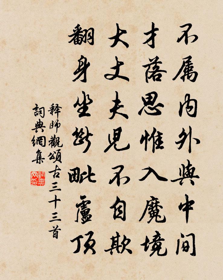 詩詞名句歷史字典書法欣賞書法字典國語詞典說文解字康熙字典古漢語字典標 題 作 者 詩 句 頌古三十三首作者:釋師觀 朝代:宋代頌古三十三首原文不屬內外與中間,才落思惟入魔境。大丈夫兒不自欺,翻身坐斷毗盧頂。詩詞問答問:頌古三十三首的作者是誰?答:釋師觀問:頌古三十三首寫於哪個朝代?答:宋代釋師觀頌古三十三首書法欣賞頌古三十三首書法作品詩詞推薦次韻表臣見遺喜歸李處權〔宋代〕溪南渾似輞川居,不啻當年臥草廬。從昔金聲蒙醬瓿,至今汗血困鹽車。端知將相真無種,更喜才華甚有餘。及此初離鄱陽喻良能〔宋代〕三年勞簿領,今日進歸程。意與長途遠,身兼薄縠輕。板輿頻送喜,山驛屢逢晴。道上人爭指,霜髭彩戲榮。送魏山韋處士一作送田處士西遊於鄴〔唐代〕陰陰亭際間,相顧慘離顏。一片雲飛去,嵯峨空魏山。訴鍾情顧敻〔唐代〕永夜拋人何處去?絕來音。香閣掩,眉斂、月將沉。爭忍不相尋?怨孤衾。換我心、為你心。始知相憶深。舟中夢覺黃載〔宋代〕夢覺三通鼓,連檣聞欠呵。世間半夜後,枕上醒人多。思想從天落,悲嘆奈曉何。南柯莫輕笑,未易到南柯。沁園春戴復古〔宋代〕一曲狂歌,有百餘言,說盡一生。費十年燈火,讀書讀史,四方奔走,求利求名。蹭蹬歸來,閉門獨坐,贏得窮吟龍邱山陳舉愷〔宋代〕九峰濕翠秋光凝,亭亭出水芙蓉淨。崔巍怪石距若虎,合沓奇峰馳八駿。山若古寺隔紅塵,時有天風度幽磬。豈惟寄陳悅秀才釋重顯〔宋代〕水中得火旨何深,握草由來不是金。莫道莊生解齊物,幾人窮極到無心。瑞香楊萬里〔宋代〕買斷春光與曉晴,幽香逸艷獨婷婷。齊開忽作欒枝錦,未圻猶疑紫素馨。絕愛小花和月露,折將一朵篸銀瓶。今年句劉鏜〔宋代〕孔曾有道官天下,韓柳無文世子孫。寄興化黃主簿杞賀鑄〔宋代〕何準第五不足稱,黃童無雙非自名。卑棲鸞鳳安初仕,葆練龍虎希長生。明月高吟紫芝曲,紅塵先老白雲兄。莫辭任伯顯昨寄日柹不至續以膽瓶為貺劉子翬〔宋代〕石瀨分攜常慘慘,尺書沓至中彌感。槁柹不呈嫫母面,圓壺俄落雄兒膽。南窗吾伊俱不勤。汲泉養化聊任真。枝頭曹參王安石〔宋代〕束髮河山百戰功,白頭富貴亦成空。華堂不著新歌舞,卻要區區一老翁。謁金門劉仲尹〔元代〕簾半。四座綠圍紅簇。歌盡玉台連夜燭。歡緣仍恨促。休唱蓮舟新曲。煙水畫船搖綠。腸斷鴛鴦三十六。紫蒲相出塞作武元衡〔唐代〕夙駕逾人境,長驅出塞垣。邊風引去騎,胡沙拂征轅。奏笳山月白,結陣瘴雲昏。雖雲風景異華夏,亦喜地理通樓南浦·春水王沂孫〔宋代〕柳下碧粼粼,認麴塵乍生,色嫩如染。清溜滿銀塘,東風細、參差縠紋初遍。別君南浦,翠眉曾照波痕淺。再來漲送紫陽王山長俊甫如武林五首方回〔宋代〕錢塘湖上試經過,便似幫淮玉樹歌。突兀棲台新佛剎,依稀燈火舊沙河。士皆戎服駢鞍馬,女尚宮妝拂黛蛾。我欲苔蘚山歌顧況〔唐代〕野人夜夢江南山,江南山深松桂閒。野人覺後長嘆息,帖蘚粘苔作山色。閉門無事任盈虛,終日欹眠觀四如。一如阮郎歸蔡伸〔宋代〕煙籠寒水暝禽棲。滿庭紅葉飛。蘭堂寂寂畫簾垂。霜濃更漏遲。鴛被冷,麝香微。強敧單枕時。西窗看盡月痕移。念奴嬌(戲和仲殊已未四月二十七日)吳潛〔宋代〕午飆褪暑,向綠陰深處,引杯孤酌。啼鳥一聲庭院悄,日影偷移朱箔。杏落金丸,荷抽碧筒,景物挨排卻。虛檐長名句推薦蠻姜豆蔻相思味。算卻在、春風舌底。吳文英《杏花天·詠湯》 南風知我意,吹夢到西洲。佚名《西洲曲》 金玉滿堂,莫之能守。富貴而驕,自遺其咎。功成身退,天之道。老子《老子·道經·第九章》 寂寥西窗久坐,故人慳會遇,同翦燈語。吳文英《齊天樂·與馮深居登禹陵》 更深月色半人家,北斗闌乾南斗斜。劉方平《月夜》 雁啼紅葉天,人醉黃花地,芭蕉雨聲秋夢裡。張可久《清江引·秋懷》 落日無人松徑里,鬼火高低明滅。薩都剌《念奴嬌·登石頭城次東坡韻》 明月照高樓,流光正徘徊。曹植《七哀》 煢煢孑立,形影相弔。西晉·李密《陳情表》 燕草如碧絲,秦桑低綠枝。李白《春思》