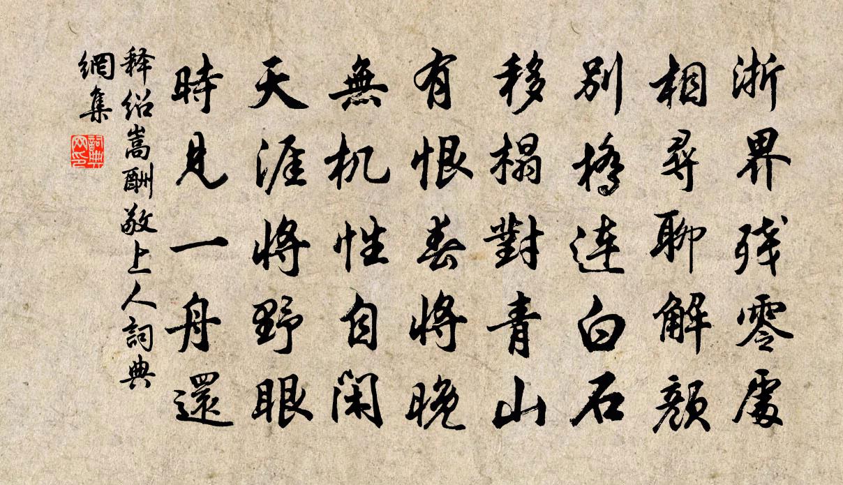 詩詞名句歷史字典書法欣賞書法字典國語詞典說文解字康熙字典古漢語字典標 題 作 者 詩 句 酬敬上人作者:釋紹嵩 朝代:宋代酬敬上人原文浙界殘零處,相尋聊解顏。別橋連白石,移榻對青山。有恨春將晚,無機性自閒。天涯將野眼,時見一舟還。詩詞問答問:酬敬上人的作者是誰?答:釋紹嵩問:酬敬上人寫於哪個朝代?答:宋代釋紹嵩酬敬上人書法欣賞酬敬上人書法作品詩詞推薦梅花 其四王冕〔元代〕故人江海去,相隔萬重雲。歲晚思無已,梅花可寄君。寄題梅王冕〔元代〕山中昨夜雪三尺,窗前梅花參差開。臥看枝上月初滿,夢到江南春已回。可笑阿嬌佇金屋,卻憐姑射下瑤台。故人句劉鏜〔宋代〕孔曾有道官天下,韓柳無文世子孫。游羅漢院途中口占李處權〔宋代〕休論至後日相催,乘興籃輿到嶺隈。風竹盡搖花玉玦,雲山渾作爛銀堆。須知此日逢僧話,不減當年訪戴回。更喜贈商洛龐主簿王禹偁〔宋代〕織女溪前貧主簿,仙娥峰下舊詞臣。久棲枳棘方思替,謾帶貂蟬不是真。六里青山雲簇簇,一條丹水石嶙嶙。秋來撥不斷馬致遠〔元代〕酒杯深,故人心,相逢且莫推辭飲。君若歌時我慢斟,屈原清死由他恁。醉和醒爭甚?秋信黃庚〔宋代〕豆雨初晴浣溽埃,報涼梧葉墮階苔。一聲新雁南樓外,早送西風信息來。哭南流人項斯〔唐代〕遙見南來使,江頭哭問君。臨終時有雪,旅葬處無雲。官庫空收劍,蠻僧共起墳。知名人尚少,誰為錄遺文。頌一百則釋重顯〔宋代〕盡機不成瞎,按牛頭吃草。四七二三諸祖師,寶器持來成過咎。過咎深,無處尋,天上人間同陸深。禱富沙華岳〔宋代〕十年蹤跡淖泥沙,為炷靈香禱富沙。萬里無由詣霜闕,一書聊欲為星槎。解驂許我來齊晏,釋縛從君問左車。他日宿石帆山下陸游〔宋代〕繫船禹廟醉如泥,投宿漁家月向低。濕翠撲人濃可掬,始知身在石帆西。古別離五首盤莊黃檢院白玉蟾〔宋代〕溶溶空中雲,膚雨能滂沱。旦暮依神龍,所至蒙恩多。歸來太山阿,已罷 * 志。溘然登崑崙,猿鶴為噓欷。四和二首劉克莊〔宋代〕夢魂久不到清朝,縱遣巫鹹未易招。塞北今惟一韋叡,江南前此幾陳喬。扶顛個個無長策,徘悶時時引大瓢。它日一葉落白居易〔唐代〕煩暑郁未退,涼飆潛已起。寒溫與盛衰,遞相為表里。蕭蕭秋林下,一葉忽先委。勿言微搖落,搖落從此始。壽州十詠式燕亭宋祁〔宋代〕使君班春還,於焉街吾屬。四阿住翬棘,聊以便涼燠。棟表飛雲逝,題端邀月宿。無德與斯人,式宴良自恧。引見前一夕,寓宿徐元達小樓,元達招符君俞楊萬里〔宋代〕主賓呼酒卷滄溟,我亦何人與德星。高閣連雲壓潮白,前山倒影入杯青。細喔秀句清無底,匹似疏梅寒更馨。不惜端午帖子詞二十首皇帝合六首歐陽修〔宋代〕天清槐露浥,歲熟麥風涼。五日標嘉節,千齡獻壽觴。斅顏魯公送挺贇歸翠微寺盧綸〔唐代〕挺贇惠學該儒釋,袖有顏徐真草跡。一齋三請紀行詩,誚我垂鞭弄鳴鏑。寺懸金榜半山隅,石路荒涼松樹枯。虎跡次韻恩平郡王丹桂史浩〔宋代〕銀潢滾滾碧流長,洗出清秋百種芳。著蕊半殷生桂子,離群獨立有天香。仙人肅啄遙相過,野老婆娑日在傍。正喜有酒歌李新〔宋代〕晴晹斥沈陰,散漫浮空雲。手提竹豀醪,疾聲呼細君。且滌牛頭樽,我欲有所云。仰看東南天,始見昭回文。星星名句推薦把酒看花想諸弟,杜陵寒食草青青。韋應物《寒食寄京師諸弟》 歸裝漸理君知否?笑指廬山古澗藤。陸游《自詠示客》 強欲登高去,無人送酒來。岑參《行軍九日思長安故園》 驚風飄白日,忽然歸西山曹植《贈徐幹詩》 戍客望邊邑,思歸多苦顏。李白《關山月》 鶯鶯燕燕分飛後,粉淡梨花瘦。元好問《虞美人·槐陰別院宜清晝》 暝色入高樓,有人樓上愁。李白《菩薩蠻·平林漠漠煙如織》 軍氣橫大荒,戰酣日將入。王昌齡《從軍行二首》 一棹碧濤春水路。過盡曉鶯啼處。晏幾道《清平樂·留人不住》 水榭風微玉枕涼。牙床角簟藕花香。蘇庠《浣溪沙·書虞元翁書》