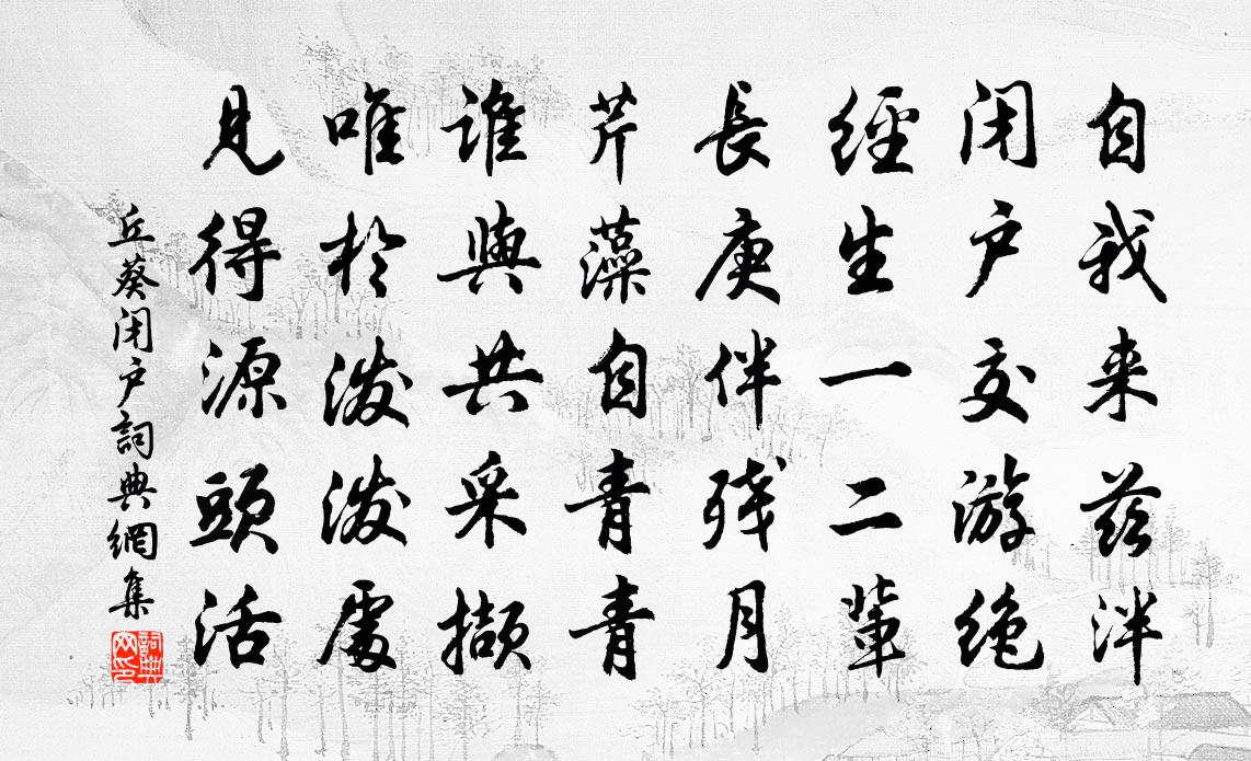 詩詞名句歷史字典書法欣賞書法字典國語詞典說文解字康熙字典古漢語字典標 題 作 者 詩 句 閉戶作者:丘葵 朝代:宋代閉戶原文自我來茲泮,閉戶交遊絕。經生一二輩,長庚伴殘月。芹藻自青青,誰與共採擷。唯於潑潑處,見得源頭活。詩詞問答問:閉戶的作者是誰?答:丘葵問:閉戶寫於哪個朝代?答:宋代丘葵閉戶書法欣賞閉戶書法作品詩詞推薦頌古一百則釋正覺〔宋代〕玉人夢破一聲雞,轉盼生涯色色齊。有信風雷催出蟄,無言桃李自成蹊。及時節,力耕犁,誰怕春疇沒脛泥。湘夫人詠元好問〔金代〕木蘭芙蓉滿芳洲,白雲飛來北渚游。千秋萬歲帝鄉遠,雲來雲去空悠悠。秋風秋月沅江渡,波上寒煙引輕素。九疑再贈一首劉克莊〔宋代〕藥囊價重百車渠,肯受村翁折簡呼。失喜迎君瞻紫氣,必能為我索玄珠。晨興舐鼎嘗殘藥,夕暝吹燈據槁梧。乞取無夢令 贈謝散人馬鈺〔元代〕此個散人姓謝。富貴榮華不藉。猛烈入玄門。修葺洞天台榭。台榭。台榭。自有花開不謝。和元亨出示山扉詩姜特立〔宋代〕手自葺柴荊,山扉亦自扃。莫辭蓬篳陋,要護草堂靈。忙為幽人啟,閒無俗士經。不妨老赤腳,應戶代奴星。杭州故人信至齊安蘇軾〔宋代〕昨夜風月清,夢到西湖上。朝來聞好語,扣戶得吳餉。輕圓白曬荔,脆釅紅螺醬。更將西庵茶,勸我洗江瘴。故人和吳龍圖韻五首明堂肆赦不得預觀感而成詩文同〔宋代〕季秋陽館事嚴禋,能饗洪惟上至仁。游廟衣冠參帝坐,侍祠簪佩儼星辰。歡聲被宇和於律,協氣流天藹若春。即見韶華仇遠〔宋代〕韶華已如此,冉冉積芳塵。石潤先知雨,山濃渾是春。釣魚臨積水,隔柳見行人。應有忘歸者,扁舟采白苹。汎錦池霞川呈張以道二首張鎡〔宋代〕戲選嬋娟結伴來,畫橋低處側鸞釵。媧簧靜試醒忪響,魯酒聊傾曠盪懷。萬事亦須從使便,百年無過任天排。憐君哭張籍賈島〔唐代〕精靈歸恍惚,石磬韻曾聞。即日是前古,誰人耕此墳。舊遊孤棹遠,故域九江分。本欲蓬瀛去,餐芝御白雲。陳淮水孫元晏〔唐代〕文物衣冠盡入秦,六朝繁盛忽埃塵。自從淮水乾枯後,不見王家更有人。辱綿州於中丞書信李群玉〔唐代〕一緘垂露到雲林,中有孫陽念驥心。萬木自凋山不動,百川皆旱海長深。風標想見瑤台鶴,詩韻如聞淥水琴。他日雜曲歌辭。妾薄命三首李端〔唐代〕憶妾初嫁君,花鬟如綠雲。回燈入綺帳,對面脫羅裙。折步教人學,偷香與客熏。容顏南國重,名字北方聞。一從自永康還連日又告旱懇祈勤恪初四五日再得甘程公許〔宋代〕去年西浙颶風高,瞬息三州汩海濤。欲倚人謀銷咎證,扶持那可欠英豪。水龍吟汪莘〔宋代〕當年翦彩垂髫,超然便欲為仙去。世間俗狀,人心狡計,不堪同住。每坐空山,獨臨古澗,神閒意寓。想瀛洲雞犬柳梢青(黃梅)黃人傑〔宋代〕恰則年時。風前雪底,初見南枝。可?匆匆,花才清瘦,子已紅肥。安排酒盞相隨。看金彈、累累四垂。渴後情懷山中袁燮〔宋代〕古松奇石水潺潺,小小茅庵一兩間。野性自知難適俗,山林僻處且偷閒。和楊石溪璚花詩韻王柏〔宋代〕點檢春光綠打圍,未應造化委鞠蘼。雖無紅紫呈新面,尚有瓊瑤戀舊枝。后土歸根辭帝寵,番易名圃少人知。長篇以新米作撈飯有感虞儔〔宋代〕老矣何妨受一廛,笑渠楊惲強歌田。驚心赤地三年旱,慰眼黃雲八月天。他日江船來白粲,暫時水碓搗紅鮮。軟炊鄂州頭陀寺上方李頻〔唐代〕高寺上方無不見,天涯行客思迢迢。西江帆掛東風急,夏口城銜楚塞遙。沙渚漁歸多濕網,桑林蠶後盡空條。感時名句推薦積土成山,風雨興焉;荀子《勸學》 粉色全無飢色加,豈知人世有榮華。杜荀鶴《蠶婦》 是以知天欲人相愛相利,而不欲人相惡相賊。墨子《墨子·04章 法儀》 春風依舊。著意隨堤柳。趙令畤《清平樂·春風依舊》 袨服華妝著處逢,六街燈火鬧兒童。元好問《京都元夕》 智不逾奸,伐之莫勝;知不至大,奸者難拒。來俊臣《羅織經·察奸卷第八》 又有牆頭千葉桃,風動落花紅蔌蔌。元稹《連昌宮詞》 落葉他鄉樹,寒燈獨夜人。馬戴《灞上秋居》 焦首朝朝還暮暮,煎心日日復年年。曹雪芹《紅樓夢·第二十二回》 立業無論大小,總要此身做得來。王永彬《圍爐夜話·第三九則》