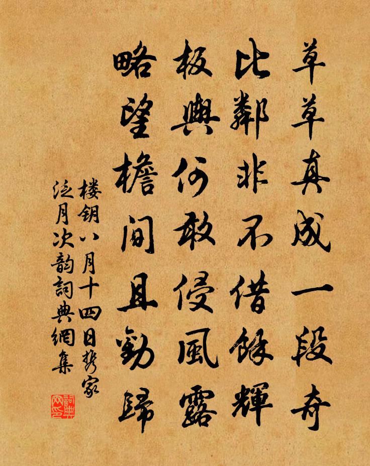 詩詞名句歷史字典書法欣賞書法字典國語詞典說文解字康熙字典古漢語字典標 題 作 者 詩 句 八月十四日攜家泛月次韻作者:樓鑰 朝代:宋代八月十四日攜家泛月次韻原文草草真成一段奇,比鄰非不借餘輝。板輿何敢侵風露,略望檐間且勸歸。詩詞問答問:八月十四日攜家泛月次韻的作者是誰?答:樓鑰問:八月十四日攜家泛月次韻寫於哪個朝代?答:宋代樓鑰八月十四日攜家泛月次韻書法欣賞八月十四日攜家泛月次韻書法作品詩詞推薦八月八日發潭州後得絕句四十首趙蕃〔宋代〕昌江直下水能平,卻愛瀧流激激聲。頻歲水災何自拯,政由疏鑿欠流行。讀浮休詩有感廖行之〔宋代〕二十年間兒女諠,糟糠勤苦不堪論。如今八載君身後,兒已登科又長孫。和奉符知縣馬寺丞永伯捕蝗回有作石介〔宋代〕天道不可詰,吾當責爾螟。方今絕才惹,何故播膻腥。野草離離盡,秋禾穗穗零。知君恤民意,鬢減數莖青。江湖偉觀黃庚〔宋代〕環峙山川秀氣鍾,人煙樓閣郁重重。潮生潮落東西浙,雲去雲來南北峰。海曙扶桑紅影濕,堤春楊柳綠陰濃。子胥皇甫岳雲溪雜題五首·蓮花塢王維〔唐代〕日日採蓮去,洲長多暮歸。弄篙莫濺水,畏濕紅蓮衣。登龜山上方寺宋庠〔宋代〕雙樹遺真宇,青鴛切紫氛。路盤千嶺出,鍾逼九天聞。林影隨崖斷,泉聲遇石分。曉風先得日,春崦易藏雲。佛果台城雜詩七首曹勛〔宋代〕老境光陰怯雨霜,怕寒窒隙似猜防。養生飽悟風中燭,卜宅閒尋肘後方。明世漁樵終混跡,故山猿鶴怨循牆。天台立冬聞雷蘇轍〔宋代〕陽淫不收斂,半歲苦常燠。禾黍飼蝗螟,粳稻委平陸。民飢強扶耒,秋晚麥當宿。閔然候一雨,霜落水泉縮。薈蔚蝶戀花 清和即事劉敏中〔元代〕池館清和風色軟。筍綠梅黃,細雨忙新燕。榴萼尚含紅一半。荷錢亂疊青猶淺。心緒未ψ腸已斷。病損形骸,自是晚晴又賦方回〔宋代〕疾風吹怒雨,天地閉青春。眼忽驚晴色,心如見故人。遷鶯元未老,戰馬漸無塵。黃鶴樓前路,輕帆好問津。鷓鴣天(紹興壬戌中秋前數夕與楊謹仲,魯子明,劉曼容及駒兄弟待月新橋)向子諲〔宋代〕駕月新成碧玉梁。青天萬里瀉銀潢。廣寒宮裡無雙樹,無熱池邊不盡香。承露液,釀秋光。直須一舉累千觴。不知喜朝天(清暑堂贈蔡君謨·林鐘商)張先〔宋代〕曉雲開。睨仙館陵虛,步入蓬萊。玉宇瓊甃,對青林近,歸鳥徘徊。風月頓消清暑,野色對、江山助詩才。瀟鼓宴江令石齊己〔唐代〕思量江令意,愛石甚悠悠。貪向深宮去,死同亡國休。兩株荒草里,千古暮江頭。若似黃金貴,隋軍也不留。滿庭芳馬鈺〔元代〕妙行宮真人,重宮陽師父,宮遇師呂祖玄通。十年了道,歸去得乘風。一紀三番下界,宮正直、凡事依公。天上現傷歌行四首黃庭堅〔宋代〕孟氏至誠通竹筍,姜詩純孝感淵魚。古人常欲養志意,君子不唯全髮膚。有妹言歸奉箕帚,仰誰出力助葭莩。等閒故宮陳允平〔宋代〕瓊台玉館照青紅,夢斷思陵檜柏風。三十二門金鎖合,年年春到掃梧桐。惜別釋文珦〔宋代〕風濤晚未止,鼓枻欲何之。穉齒便相識,摹上成別離。水香浮浦樹,月露滿江蘺。明日空凝佇,茫茫無處期。華山西岡游贈隱玄叟顧況〔唐代〕群峰郁初霽,潑黛若鬟沐。失風鼓唅呀,搖撼千灌木。木葉微墮黃,石泉淨停綠。危磴蘿薜牽,迥步入幽谷。我心宿齋太一宮即事五首宋庠〔宋代〕碧篠珍叢北戶陰,時時天籟著風琴。體中痴黠何須判,一夜甘為洛客吟。中牟縣旅王禹偁〔宋代〕古縣日初沉,軺車忽見尋。不將遷客累,方認故人心。無酒銷寒漏,挑燈聽遠砧。郟郊重里路,並轡未妨吟。名句推薦盡做舊愁都忘卻,新愁何處著王庭筠《謁金門·雙喜鵲》 山無陵,江水為竭。佚名《上邪》 別裁偽體親風雅,轉益多師是汝師。杜甫《戲為六絕句》 春去秋來也,愁心似醉醺。歐陽炯《巫山一段雲·春去秋來也》 春花秋月何時了?往事知多少。李煜《虞美人·春花秋月何時了》 薄倖郎君何日到,想自當初,莫要相逢好。施耐庵《蝶戀花·一別家山音信杳》 一日不作,百日不食。司馬遷《史記·三十世家·趙世家》 窣地春袍,嫩色宜相照。梅堯臣《蘇幕遮·草》 去年相送,餘杭門外,飛雪似楊花。蘇軾《少年游·潤州作》 藥醫不死病,死病無藥醫。張南莊《何典·第三回》