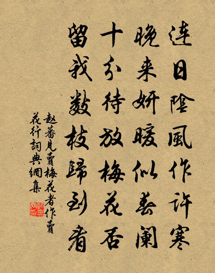 詩詞名句歷史字典書法欣賞書法字典國語詞典說文解字康熙字典古漢語字典標 題 作 者 詩 句 見賣梅花者作賣花行作者:趙蕃 朝代:宋代見賣梅花者作賣花行原文連日陰風作許寒,晚來妍暖似春闌。十分待放梅花否,留我數枝歸到看。詩詞問答問:見賣梅花者作賣花行的作者是誰?答:趙蕃問:見賣梅花者作賣花行寫於哪個朝代?答:宋代趙蕃見賣梅花者作賣花行書法欣賞見賣梅花者作賣花行書法作品詩詞推薦陽羨雜詠十九首。松嶺陸希聲〔唐代〕嶺上青鬆手自栽,已能蒼翠映莓苔。歲寒本是君家事,好送清風月下來。依韻奉和司徒侍中春陰席上強至〔宋代〕未消殘雪在牆陰,晝景昏昏似日沈。土凍轉愁花信遠,天寒唯仗酒分深。笑談四座相歡色,富貴三朝不動心。詩句江邊四十韻(此後並江陵時作)元稹〔唐代〕官借江邊宅,天生地勢坳。欹危饒壞構,迢遞接長郊。怪鵩頻棲息,跳蛙頗混淆。總無籬繳繞,尤怕虎咆哮。停潦高潔堂來見因次前韻三首陳著〔宋代〕詩屋中閒借隙光,老來猶苦未知方。羨君句法源頭活,此意曾參紫紫陽。稽山道中陸游〔宋代〕禹陵草木初沾露,謝墅人家已閉門。八十年間幾來往,痴頑不料至今存。偈頌一百四十一首釋師範〔宋代〕拄杖子,難摸索。有時喜,有時惡。攪動滄溟,沖開碧落,何如普化搖鈴鐸。李白墳金君卿〔宋代〕謝公山下見孤墳,下闞平江萬頃雲。盡日艤舟空悵望,謫仙風骨在遺文。贈柯山道士鄭雲谷來住灃之洞辰二首李曾伯〔宋代〕本是住山人,來作開山計。雲出元無心,有心為雲累。執柯與紉蘭,如幻亦如寄。神遊有昆蓬,御風歸歟是。題陳相別業張宗永〔宋代〕喬松翠竹絕纖埃,門對南山盡日開。應是主人貪報國,功成名遂不歸來。宮詞三十三首曹勛〔宋代〕東風拂拂到行朝,剪彩膺時下絳霄。不但劍歌隨騎曲,行須儀鳳舞雲韶。絕命詞方孝孺〔明代〕天降亂離兮,孰知其由? 奸臣得計兮,謀國用猶。 忠臣發憤兮,血淚交流。 以此殉君兮,抑又何求! 嗚呼示詹深父趙蕃〔宋代〕濁涇清渭本源分,寂寞安能亂糾紛。世黠只知錢使鬼,我痴但識潁呼君。乘時大駔千金射,望歲良農赤地耘。富貴禁中瑞竹同本異莖梅堯臣〔宋代〕孤竹二君子,聖人知獨清。但將奇節並,何用首陽名。寄題上虞蘇簿凝虛館石延年〔宋代〕越基擅岩壑,虛館擇其憂。丹甍煜孤飛,靈景邈四周。山高晴若陰,洞寒夏如秋。錦幄檻花發,玉環渠水流。閒臥秋日遣懷十六韻寄道侶陸龜蒙〔唐代〕盡日臨風坐,雄詞妙略兼。共知時世薄,寧恨歲華淹。且把靈方試,休憑吉夢占。夜然燒汞火,朝煉洗金鹽。有路綠頭鴨(同前)曹勛〔宋代〕喜雨薰泛景,翠雲低柳。正涼生殿閣,梅潤曉天,暑風時候。應乘乾、彩虹流渚,驚電繞、璇霄樞斗。大業輝光,樂遊園望月楊憑〔唐代〕炎靈全盛地,明月半秋時。今古人同望,盈虧節暗移。彩凝雙月迥,輪度八川遲。共惜鳴珂去,金波送酒卮。黃筌畫金盆鴿孟蜀屏風者也一首蘇籀〔宋代〕孟氏觀闕嘗鮮新,虯虯栱桷翔青冥。可憐當年百事足,鬼眼未遽窺高明。鋪首倉琅百樓聳,寶簾珠帶關銀屏。風台寄鄭信卿參政程鉅夫〔元代〕闕下相看未忍分,過門誰料不逢君。竟參華省江南去,定有新聲天上聞。夜靜每勞瞻紫氣,春深幾欲和《停雲》。家書送白額因賦虞儔〔宋代〕虎踞南山孰敢樵,盜渠名字卻深逃。誰能雪裡窮三窟,縛送尊前慰老饕。試喚玉纖揎碧袖,笑看霜片落金刀。族庖名句推薦風水人間不可無,也須陰騭兩相扶。馮夢龍《醒世恆言·卷一》 暮雨忽來鴻雁杳,莽關山、一派秋聲里。龔自珍《金縷曲·癸酉秋出都述懷有賦》 柳葉雙眉久不描,殘妝和淚污紅綃。江采萍《謝賜珍珠》 世事浮云何足問,不如高臥且加餐。王維《酌酒與裴迪》 枉直隨形而不在影,屈申任物而不在我列子及其弟子《列子·說符》 別有世間曾未見,一行一步一花新。吳承恩《西遊記·第三十八回》 已訝衾枕冷,復見窗戶明。白居易《夜雪》 花時同醉破春愁,醉折花枝作酒籌。白居易《同李十一醉憶元九》 無求到處人情好,不飲任他酒價高。佚名《增廣賢文·上集》 蕃甲鎖蛇鱗,馬嘶青冢白。李賀《塞下曲》