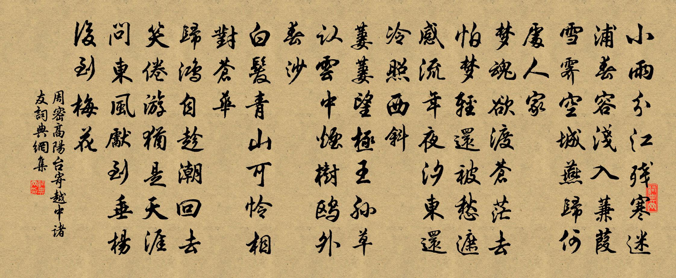 上闋起首三句描寫作者所住的地方。“小雨分江,殘寒迷浦,春容淺入蒹葭”,初春的小雨分流於錢塘江中,江邊還瀰漫著殘冬的寒氣只有初生的蘆葦透露出一點淺淺的春意。起二句對偶,工整自然,第三句“淺入”二字刻意雕琢,頗為生動。接下去兩句接著描寫周圍環境。“雪霽空城,燕歸何處人家”,雨雪已經停止,天空已經放晴,本應到春回大地萬物復甦的時候,但經過戰爭之後,城裡十室九空,居民屋子受到破壞,燕子雖然歸來,但是它們到哪一家去做窩棲息呢?寫城市蕭條,只用一“空”字,且用燕子無處棲息來渲染形象而凝重。此情此景,使作者想起了朋友。“夢魂欲渡蒼茫去,怕夢輕、還被愁遮”,轉而寫對友人的思念。蒼茫,指錢塘江,夢中要到越中訪友,夢魂要渡過“蒼茫”的江水。但是,夢輕愁重,怕被愁遮住,以致於在夢中也去不了啊。夢與愁有輕重之分,構思極為新奇;且意思上以退為進,也頗有力。“感流年,夜汐東還,冷照西斜”,又回到自己,感慨光陰易逝。寫光陰,也只用三個字輕點,有年華流駛之感,接著便描寫兩種景象:夜裡的潮水向東退走清冷的月亮向西斜去。這兩種景象一天天重複出現,光陰便在不知不覺中消逝了,時間就這樣日復一日地流失了,可是我與友人仍懸於兩地,隔於江水,不能相見。