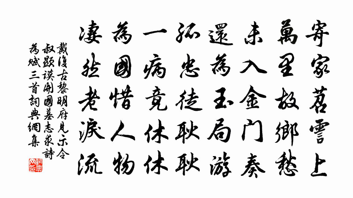 詩詞名句歷史字典書法欣賞書法字典國語詞典說文解字康熙字典古漢語字典標 題 作 者 詩 句 黎明府見示令叔顯謨開國墓誌求詩為賦三首作者:戴復古 朝代:宋代原文寄家苕霅上,萬里故鄉愁。未入金門奏,還為玉局游。孤忠徒耿耿,一病竟休休。為國惜人物,悽然老淚流。詩詞問答問:《黎明府見示令叔顯謨開國墓誌求詩為賦三首》的作者是誰?答:戴復古問:該詩寫於哪個朝代?答:宋代問:戴復古的名句有哪些?答:戴復古名句大全書法欣賞黎明府見示令叔顯謨開國墓誌求詩為賦三首書法作品詩詞推薦游洞霄何處厚〔宋代〕洞天宮中清無塵,紛紛霏霏翔五雲。光浮閬風藹無垠,中有神仙相輩倫。服曳雲章玉佩珣,時聞金鐘催朝真。仙班明堂觀禮雜詠十三首回龍橋望駕王同祖〔宋代〕兩行衛士錦宮袍,成歲聲長徹九皋。過盡羽旄風細細,彩雲不動御爐高。失調名(贈妓)阮郎中〔宋代〕東風捻就,腰兒纖細。系的粉裙兒不起。近來只慣掌中看,忍教在、燭花影里。更闌應是,酒紅微褪。暗蹙損、眉秀野亭范端臣〔宋代〕不敢尋詩怕雨催,須知挈榼為春來。天公未放陽烏出,坐客何妨笑臉開。寒食花光猶照眼,亂山雲氣欲侵罍。黃昏重寄金山寺僧方乾〔唐代〕風濤匝山寺,磬韻達漁船。此處別師久,遠懷無信傳。月華妨靜燭,鳥語答幽禪。已見如如理,灰心應不然。題潮出海門圖曾豐〔宋代〕海漲為潮在在均,浙江別有主潮神。聲搖地脈雷霆怒,風擘崖根贔屭嗔。鮫鱷乘風噴立雪,虹蜺挾雨涌橫銀。吾詩點絳唇呂渭老〔宋代〕俊眼犀心,尊前如有乘鸞便。過愁傳怨。只許燈光見。見了重休,河漢明遮斷。深深院。亂風飄霰。揉了雙羅燕。野井陸龜蒙〔唐代〕朱閣前頭露井多,碧梧桐下美人過。寒泉未必能如此,奈有銀瓶素綆何。觀風堂觀叢刻王邁〔宋代〕古碑真贗遞相承,俗刻紛紛滿笥滕。最是可憐越山石,不應只吊剡溪藤。太常引許楨〔元代〕淡妝素服更纖濃。清致不須紅。佇目畫橋東。一掃盡、人間冶容。 * 何在,嫦娥昨夜,飛出廣寒宮。天亦為詩翁西台詩二十四韻司馬光〔宋代〕翰苑昔陪侍,天光辱顧瞻。寵雖承渙汗,功不立毫織。山鹿纓頻頓,鉛刀礪不銛。拭花眸子缺,撚雪頷髭添。跼影花舞史浩〔宋代〕仙客之名從此有。多謝風流,飛馭陪尊酒。持此一卮同勸後。願花長在人長壽。熙寧蜡祭十三首佚名〔宋代〕英英禮文,既備而全。嚴嚴四郊,屹屹紫壇。百末旨酒,基敷若蘭,何以畏民,既壽而安。春早四首劉克莊〔宋代〕去冬玉塞靜無埃,春雪雖遲亦壓災。大士送歸天竺去,相公宣入浙江來。吁嗟篇曹植〔魏晉〕吁嗟此轉蓬。居世何獨然。長去本根逝。宿夜無休閒。東西經七陌。南北越九阡。卒遇迴風起。吹我入雲間。自謂卜運算元馬鈺〔元代〕人識山侗字。誰曉山侗意。大貌山侗人倚山,故作山侗謎。財色山侗棄。玄妙山侗秘。一日侗樂道成,永占山侗位光武二首陳造〔宋代〕濟業何關赤伏符,王梁不拜未雲疏。君王幸卻東封請,底事終身溺讖書。伯成先生席上賦贈韓修齡(韓,關中人,聖秋舍人小阮,流浪東吳,善說平話。)陳維崧〔清代〕月上梨花午。恰重逢、江潭舊識,喁喁爾汝。絳燭兩行渾不夜,添上三通畫鼓。說不盡、殘唐西楚。話到英雄兒女憶漢月歐陽修〔宋代〕紅艷幾枝輕裊。新被東風開了。倚煙啼露為誰嬌,故惹蝶憐蜂惱。多情游賞處,留戀向、綠叢千繞。酒闌歡罷不成送元衛弟赴長亭鹽場樓鑰〔宋代〕阿連生而秀,二親所甚愛。仲兄勤拊養,遇事輒如誨。幹蠱靜而辦,胸次無卑隘。今焉職牢盆,官宇臨渤澥。毋謂名句推薦商葉墮乾雨,秋衣臥單雲。孟郊《秋懷十五首》 自恨枝無葉,莫怨太陽偏。佚名《增廣賢文·上集》 楊柳散和風,青山澹吾慮。韋應物《東郊》 秋來相顧尚飄蓬,未就丹砂愧葛洪。杜甫《贈李白》 君歌楊叛兒,妾勸新豐酒。李白《楊叛兒》 城上春雲覆苑牆,江亭晚色靜年芳。杜甫《曲江對雨》 酒闌更喜團茶苦,夢斷偏宜瑞腦香。李清照《鷓鴣天·寒日蕭蕭上瑣窗》 功蓋三分國,名成八陣圖。杜甫《八陣圖》 鞭撲之子,不從父之教劉向《說苑·雜言》 從來幽怨應無數?鐵馬金戈,青冢黃昏路。納蘭性德《蝶戀花·出塞》