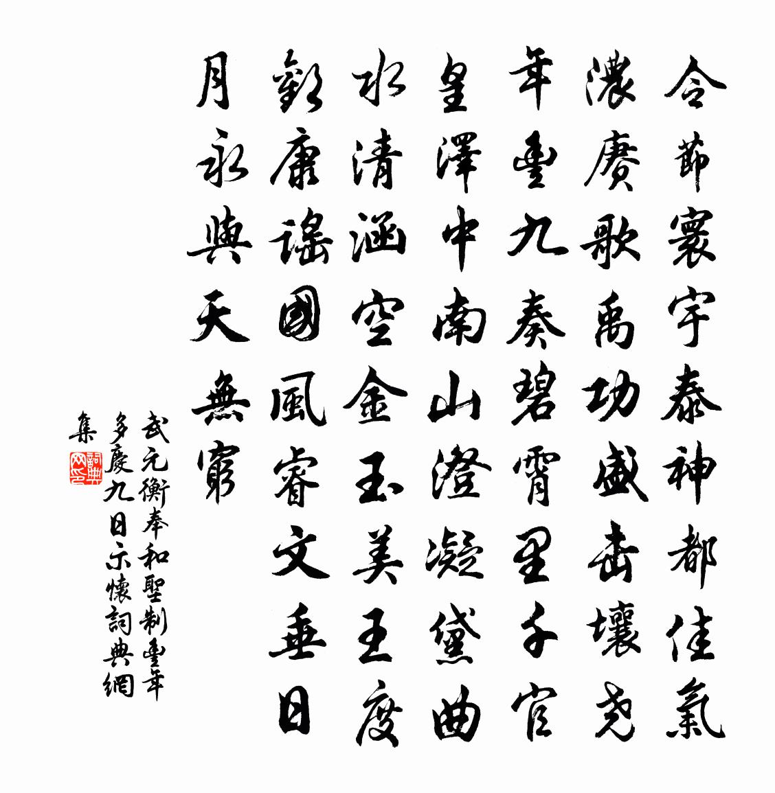 詩詞名句歷史字典書法欣賞書法字典國語詞典說文解字康熙字典古漢語字典標 題 作 者 詩 句 奉和聖制豐年多慶九日示懷作者:武元衡 朝代:唐代奉和聖制豐年多慶九日示懷原文令節寰宇泰,神都佳氣濃。賡歌禹功盛,擊壤堯年豐。九奏碧霄里,千官皇澤中。南山澄凝黛,曲水清涵空。金玉美王度,歡康謠國風。睿文垂日月,永與天無窮。詩詞問答問:奉和聖制豐年多慶九日示懷的作者是誰?答:武元衡問:奉和聖制豐年多慶九日示懷寫於哪個朝代?答:唐代問:奉和聖制豐年多慶九日示懷是什麼體裁?答:五排武元衡奉和聖制豐年多慶九日示懷書法欣賞奉和聖制豐年多慶九日示懷書法作品注釋全唐詩:卷317-20詩詞推薦清江勸駕送舉人二首王炎〔宋代〕黃堂暫虛位,勸駕屬守丞。金石方遏密,不敢歌鹿鳴。吉蠲置觴豆,少洽賓主情。西風吹桂枝,馬首將東行。春官欒家瀨王維〔唐代〕颯颯秋雨中,淺淺石榴瀉。跳波自相濺,白鷺驚復下。過陰陵張祜〔唐代〕壯士悽惶到山下,行人惆悵上山頭。生前此路已迷失,寂寞孤魂何處游。赴任嘉州初登棧道寄題姜潛至之讀易堂石介〔宋代〕我不從官君下第,其間險易兩何如。連雲棧外四千里,讀易堂中一帙書。慈母含飴垂禿髮,先生懷道按茅廬。莫將以天壇靈壽杖送莘老黃庭堅〔宋代〕王屋千霜老紫藤,扶公休沐對親朋。異時駟馬安車去,拄到天壇願力能。祥興第三十九文天祥〔宋代〕南嶽配朱鳥,地軸為之翻。皇綱未為絕,雲台誰再論。活人歌釋印肅〔宋代〕大聖靈驗普庵圓,廣施含靈遇有緣。信心清淨通靈感,萬病俱銷釋業愆。文殊體,用普賢,活人歌裹現金仙。藥王鵲橋仙呂渭老〔宋代〕西風不落,薄衾孤枕,記起花時些個。宿愁新恨兩關心,說道理、分疏不可。別愁如絮,佳期何在,古屋蕭蕭燈火歲晚幽興陸游〔宋代〕短鬢元知不久青,況開九帙數余齡。全家共保一忍字,累世相傳三住銘。時泛孤舟過梅市,卻穿雙屩上蘭亭。擁爐婆羅坪范成大〔宋代〕仙聖飛行此是家,路逢真境但驚呀。神農嘗外盡靈藥,天女散余多異花。嵐雨逼衣寒似鐵,冰泉炊米硬於沙。峰頭京中晚望羅隱〔唐代〕心如野鹿跡如萍,謾向人間性一靈。往事不知多少夢,夜來和酒一時醒。月午楊萬里〔宋代〕揭竿借日自烘衣,背立睛暄片子時。雪後春生人未覺,弄絲蟢子獨先知。丞相張公築室湘江之上若欲遠人間事盡心於山李彌遜〔宋代〕蕙櫋蘭橑濕青紅,衡岳湘江一望通。曉日雲煙隨几杖,春風花草近房櫳。赤松未結忘機伴,綠野聊從避俗翁。更欲新開小室陸游〔宋代〕並檐開小室,僅可容一幾。東為讀書窗,初日滿窗紙。衰眸頓清澈,不畏字如螘。琅然弦誦聲,和答有稚子。餘年秋日登郡樓二首蔡襄〔宋代〕落葉隨飛鳥,疏砧答暮蟬。悠悠戍樓角,悽切萬家傳。偈頌二百零五首釋正覺〔宋代〕尋常撞搕,當面諱卻。可憐傅大師,處處失樓閣。送方楷劉克莊〔宋代〕才子囊書入帝京,鷃}飛安敢料鵬程。赴南宮緩功夫久,攜北碑多嗜好清。玉鏡台邊無別淚,金花箋上有芳名。可年逾弱冠又多錦瑟之一弦身墮塵樊未徹玉霄白玉蟾〔宋代〕夜涼莫聽野猿哀,覺我枯腸轉九回。淅淅秋風吹性水,淹淹暮雨滴心灰。自憐孤影青燈下,曾作神霄故吏來。若待酴醾程敦厚〔宋代〕獨憐朱臉花容俗,全學瑤台玉女妝。素月共成中夜色,好風分散四鄰香。春晴史衛卿〔宋代〕平明晴可愛,眼界一湖春。不見水中鷺,惟多堤上人。梅花已白盡,柳色正青新。日暮無歌舞,清幽屬野身。名句推薦東船西舫悄無言,唯見江心秋月白。白居易《琵琶行 / 琵琶引》 天門中斷楚江開,碧水東流至此回。李白《望天門山》 矜高倨傲,無非客氣降伏得,客氣下而後正氣伸洪應明《菜根譚·概論》 柳葉雙眉久不描,殘妝和淚污紅綃。江采萍《謝賜珍珠》 形相雖惡而心術善,無害為君子也。荀子《荀子·非相》 畫虎畫皮難畫骨,知人知面不知心。佚名《增廣賢文·上集》 雪雲散盡,放曉晴池院。楊柳於人便青眼。李元膺《洞仙歌·雪雲散盡》 今夕不登樓,一年空過秋。高觀國《菩薩蠻·何須急管吹雲暝》 嵩雲秦樹久離居,雙鯉迢迢一紙書。李商隱《寄令狐郎中》 靜夜沉沉,浮光靄靄,冷浸溶溶月。丘處機《無俗念·靈虛宮梨花詞》