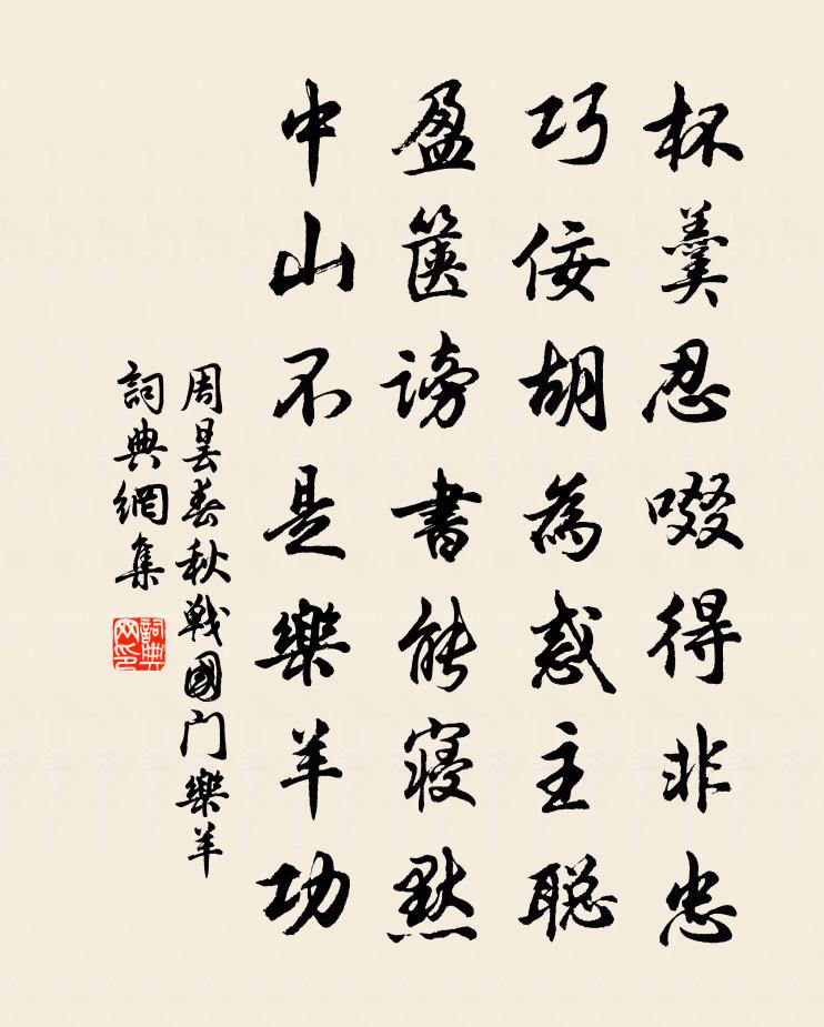 詩詞名句歷史字典書法欣賞書法字典國語詞典說文解字康熙字典古漢語字典標 題 作 者 詩 句 春秋戰國門樂羊作者:周曇 朝代:唐代春秋戰國門樂羊原文杯羹忍啜得非忠,巧佞胡為惑主聰。盈篋謗書能寢默,中山不是樂羊功。詩詞問答問:春秋戰國門樂羊的作者是誰?答:周曇問:春秋戰國門樂羊寫於哪個朝代?答:唐代周曇春秋戰國門樂羊書法欣賞春秋戰國門樂羊書法作品注釋全唐詩:卷728-48詩詞推薦題趙別駕委齋詩五邁〔宋代〕別駕來訪別,徵我委齋詩。敢問委之說,別駕自發揮。萬事悉委分,吾何容心為。抱槧游文屋,去取委所司。一戰法駕導引(壽治中)劉辰翁〔宋代〕蟠桃熟,蟠桃熟,一熟一千年。比似相公正年少,朱顏綠鬢錦蟬連。肉色更光鮮。西江好,西江好,春雨碧黏天。重建海道都漕運萬戶府詩楊維楨〔元代〕朔方聖人啟中天,天府之國宅幽燕。帝車迴旋統幅員,南海北海無中邊。海陵餫餉至領顓,龍驤萬斛誰開先。神人山居雜詩九十首曹勛〔宋代〕憶君遠亦去,泉響塹每度。一笑成真樂,此樂固難屢。村閒桑柘秋,川闊牛羊暮。歸顧紫領巾,愧我方學圃。北渚亭曾鞏〔宋代〕四楹虛徹地無鄰,斷送孤高與使君。午夜坐臨滄海日,半天吟泰山雲。青徐氣接川原秀,常碣風連草本薰。莫笑一九日在邇索居無聊取滿城風雨近重陽為韻賦七戴表元〔宋代〕山雞鮮羽毛,野鶻健爪吻。秋高草木空,屏處亦可隱。一為嗜欲牽,遂與籠檻近。作書報孔鵠,出入宜少謹。崇山郡裴夷直〔唐代〕地盡炎荒瘴海頭,聖朝今又放驩兜。交州已在南天外,更過交州四五州。自蘇台至望亭驛人家盡空春物增思悵然有作因寄從弟紓李嘉祐〔唐代〕南浦菰蔣覆白蘋,東吳黎庶逐黃巾。野棠自發空臨水,江燕初歸不見人。遠岫依依如送客,平田渺渺獨傷春。那堪憶王孫(秋詞)李重元〔宋代〕颼颼風冷荻花秋。明月斜侵獨倚樓。十二珠簾不上鉤。黯凝眸。一點漁燈古渡頭。示永慶院秀老王安石〔宋代〕禪房借枕得重欹,陳跡翛然尚有詩。嗟我與公皆老矣,拂天松柏見栽時。和新市雜詠趙希逢〔宋代〕相逢逆旅若為親,一醉難酬一笑開。夜靜酒闌清不奈,好風吹月入樽來。杜鵑花得紅字真山民〔宋代〕愁鎖色雲往事空,只將遺恨寄芳叢。歸心千古終難白,啼血萬山多是紅。枝帶翠煙深夜月,魂飛錦水舊東風。至今梅花劉子翬〔宋代〕玉骨綃裳韻太孤,天教飛雪伴清癯,林寒疏蕊半開落,野迥暗香疑有無。庾嶺風光仍似舊,漢宮鉛粉莫相污。驚心答盧鄴良乂〔唐代〕風泉只向夢中聞,身外無餘可寄君。當戶一輪惟曉月,掛檐數片是秋雲。偈頌一百二十三首釋普度〔宋代〕布袋頭一結,百城訊息絕。蠟人冰不冰,萬里一條鐵。珊瑚枝枝撐著月。高座寺曾極〔宋代〕石子岡前高座寺,犢車曾向此徘徊。清談未解傾人國,更引番僧度海來。送徐璣赴永州掾趙師秀〔宋代〕二水鴻飛外,君今問去程。家貧難擇宦,身遠易成名。入署梅花落,過汀蕙草生。莫因饒楚思,詞體失和平。卜運算元王哲〔元代〕靜青黃燭。滅煙消,白黑紅光旭。轉靈丹令沐浴。口長生,五彩從前簇。宗評法。寫金書,拯救災回福。及歸依賀新郎葛長庚〔宋代〕靜看春容瘦。未清明、荼避席,薔薇出晝。花里流鶯罵桃李,似與東風管句。怕虛度、蘭亭時候。我也別來天上夕送履正赴省舒邦佐〔宋代〕萬里雲衢著腳初,臨行尚肯過吾廬。風雲得助子方快,冰玉相依我不如。驛路響鈴看報捷,殿門放鑰待傳臚。逾科名句推薦日落謝家池館,柳絲金縷斷。韋莊《歸國遙·春欲晚》 蠟淚惱東風,舊壘眠新燕。納蘭性德《生查子·鞭影落春堤》 丞相祠堂何處尋,錦官城外柏森森。杜甫《蜀相》 但願人長久,千里共嬋娟。蘇軾《水調歌頭·丙辰中秋》 古之為政,愛人為大戴聖《禮記·哀公問》 龍噓氣成雲,雲固弗靈於龍也。韓愈《雜說一·龍說》 窮則變,變則通,通則久。佚名《易傳·繫辭傳下·第二章》 與朋友交,言而有信。孔子弟子《論語·學而篇》 青林翠竹,四時俱備。陶弘景《答謝中書書》 野曠天清無戰聲,四萬義軍同日死。杜甫《悲陳陶》