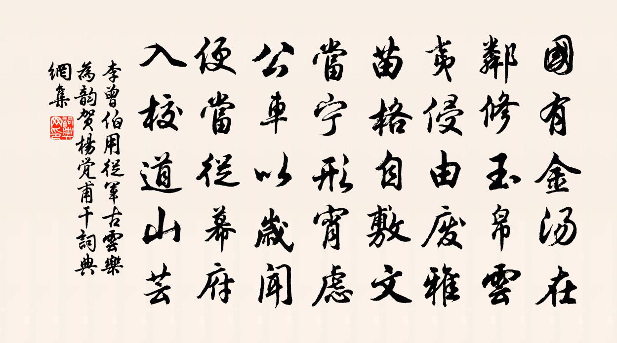 詩詞名句歷史字典書法欣賞書法字典國語詞典說文解字康熙字典古漢語字典標 題 作 者 詩 句 用從軍古雲樂為韻賀楊覺甫乾作者:李曾伯 朝代:宋代原文國有金湯在,鄰修玉帛雲。夷侵由廢雅,苗格自敷文。當寧形宵慮,公車以歲聞。便當從幕府,入校道山芸。詩詞問答問:《用從軍古雲樂為韻賀楊覺甫乾》的作者是誰?答:李曾伯問:該詩寫於哪個朝代?答:宋代書法欣賞用從軍古雲樂為韻賀楊覺甫乾書法作品詩詞推薦望江南戴復古〔宋代〕壺山好,膽氣不妨粗。手奮空拳成活計,眼穿故紙下功夫。處世未全疏。生涯事,近日果何如。背錦奚奴能檢典,旅泊李群玉〔唐代〕搖落江天裡,飄零倚客舟。短篇才遣悶,小釀不供愁。沙雨潮痕細,林風月影稠。書空閒度日,深擁破貂裘。同安撫趙子直餞朱晦菴於懷安二首得重字林亦之〔宋代〕祖帳寒梅白未空,已看新葉綠重重。八州斧鉞送行客,十里旌旗繞暮峰。北斗獨高韓吏部,南州爭慕郭林宗。一時覽孟東野集邵謁〔唐代〕蚌死留夜光,劍折留鋒鋩。哲人歸大夜,千古傳珪璋。珪璋遍四海,人倫多變改。題花花已無,玩月月猶在。不知朝中措趙彥端〔宋代〕燒燈已過禁菸前。春信遞相傳。柳暗乍迷津路,花暄欲照江天。天涯賓主,相逢老矣,一笑歡然。晚歲許同廬社,思歸二首蘇轍〔宋代〕汝南百日留,走遍三男子。思歸非吾計,聊亦為爾耳。行裝理肩輿,客舍卷床笫。兒言世情惡,平地風波起。舟行生查子程垓〔宋代〕溪光曲曲村,花影重重樹。風物小桃源,春事還如許。情知送客來,又作尋芳去。可惜一春詩,總為閒愁賦。聲苦文天祥〔宋代〕萬死奔波落一生,飄零淮海命何輕。近來學得趙清獻,叫苦時時數十聲。次韻公紹賀崇靜之賜金紫朱長文〔唐代〕久脫朝衣襲野裳,親逢盛旦日重光。耕田鑿井堯民事,垂組懷黃漢服章。諸老相歡陶聖治,兩宮遙祝與天長。謫仙紹興釋奠武成王七首佚名〔宋代〕祀率舊典,禮崇駿功。齊明衷正,肸鄉豈融。量幣肅錄,周旋鞠躬。神其昭受,幽贊無窮。答胡叔賢周必大〔宋代〕朱顏青綬憶秦淮,白鷺洲疑鰲駕來。側畔交遊欣作者,中間賡和負康哉。新春漸覺風光好,陳跡時將日記開。惟有驀山溪沈蔚〔宋代〕想伊不住。船在藍橋路。別語未甘聽,更擬問、而今是去。門前楊柳,幾日轉西風,將行色,欲留心,忽忽城頭鼓梅陸游〔宋代〕俗事常妨把一杯,等閒開過小園梅。自傷惟有尋春夢,百舌無情又喚回。絕句黃載〔宋代〕社寒比臘更清嚴,花蕊蕭疏半欲緘。過手重裘猶得力,莫將晴煗信春衫。赤壁圖吳師道〔元代〕沉沙戟折怒濤秋,殘壘蒼蒼戰門休。風火吉年消伯氣,江山一幅掛清愁。丈夫不學曹孟德,生子當如孫仲謀。機會代秋胡歌詩 其五嵇康〔兩漢〕絕智棄學。游心於玄默。絕智棄學。游心於玄默。遇過而悔。當不自得。垂釣一壑。所樂一國。被發行歌。和氣四送徐鼎夫用廬陵通守博士戴文韻劉克莊〔宋代〕一春風雨郡齋寒,荒了 * 老子壇。吏抱文書排闥至,客攜詩卷退衙看。愁來鏡里絲難梁,老去胸中錦已殘。若棹那佚名〔先秦〕猗與那與!置我鞉鼓。奏鼓簡簡,衎我烈祖。湯孫奏假,綏我思成。鞉鼓淵淵,嘒嘒管聲。既和且平,依我磬聲。新涼陸游〔宋代〕盡道新涼好,無如晝漏長。奇文窺楚屈,妙理玩蒙莊。靜臥貧猶樂,高歌醒亦狂。翩翩雙蝶子,也似惜年光。芷溪園侯畐〔宋代〕行吟溪上園,幽思與詩便。藤附多年樹,苔生廢井泉。瘦梅鋤月種,蔓菊就籬編。更有三間屋,重茅蓋竹椽。名句推薦衝波突出人齊譀,躍浪爭先鳥退飛。盧肇《競渡詩 / 及第後江寧觀競渡寄袁州剌史成應元》 床空委清塵,室虛來悲風。潘安《悼亡詩三首》 綠池落盡紅蕖卻,荷葉猶開最小錢。楊萬里《秋涼晚步》 有生之樂,無死之心劉向《戰國策·齊六·田單將攻狄》 江上晚來堪畫處,釣魚人一蓑歸去。馬致遠《壽陽曲·江天暮雪》 行盡江南,不與離人遇。晏幾道《蝶戀花·夢入江南煙水路》 若要人不知,除非己莫為。佚名《增廣賢文·上集》 長袖善舞,多錢善賈。韓非及後人《韓非子·五蠹》 酒已都醒,如何消夜永!周邦彥《關河令·秋陰時晴漸向暝》 對茲佳品酬佳節,桂拂清風菊帶霜。曹雪芹《螃蟹詠》