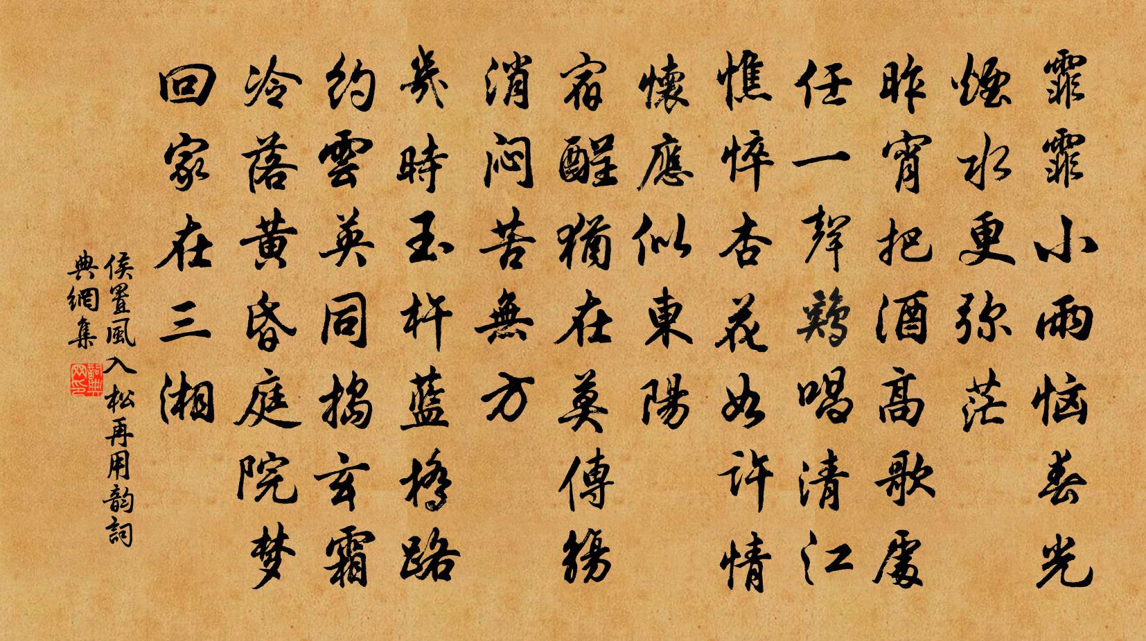 詩詞名句歷史字典書法欣賞書法字典國語詞典說文解字康熙字典古漢語字典標 題 作 者 詩 句 風入松(再用韻)作者:侯置 朝代:宋代風入松(再用韻)原文霏霏小雨惱春光。煙水更彌茫。昨宵把酒高歌處,任一聲、雞唱清江。憔悴杏花如許,情懷應似東陽。宿酲猶在莫傳觴。消悶苦無方。幾時玉杵藍橋路,約雲英、同搗玄霜。冷落黃昏庭院,夢回家在三湘。詩詞問答問:風入松(再用韻)的作者是誰?答:侯置問:風入松(再用韻)寫於哪個朝代?答:宋代問:風入松(再用韻)是什麼體裁?答:詞侯置風入松(再用韻)書法欣賞風入松(再用韻)書法作品詩詞推薦次顏長道韻送傅倅蘇軾〔宋代〕兩見黃花掃落英,南山山寺遍題名。宗成不獨依岑范,魯衛終當似弟兄。去歲雲濤浮汴泗,與君泥土滿衣纓。如今休日城上三首楊萬里〔宋代〕休日呼兒上古城,胡床何處不隨行。莫嫌一陣東風惡,分外教他數日晴。滿庭芳蘇軾〔宋代〕香靉雕盤,寒生冰箸,畫堂別是風光。主人情重,開宴出紅妝。膩玉圓搓素頸,藕絲嫩、新織仙裳。雙歌罷,虛檐宿雲際寺溫庭筠〔唐代〕白蓋微雲一徑深,東峰弟子遠相尋。蒼苔路熟僧歸寺,紅葉聲乾鹿在林。高閣清香生靜境,夜堂疏磬發禪心。自從青原祖燈監寺屢問予久不入山寫真戲題周必大〔宋代〕欲作青原掛搭僧,傳聞米價逐時增。繞腰三篾非難事,空腹何能念葛藤。饋春茶天制司屬官袁說友〔宋代〕戊午新芽上蜀江,表情未有敢先嘗。幾年爭鬭無雙品,萬里書來第一綱。水截龍章浮碾玉,爐煎蟹眼試憑湯。知君講筵侍立三首魏了翁〔宋代〕須臾講殿報斑齊,拜罷東升一半西。兩序公卿皆賜坐,史臣講讀中階隮。送道者朝見後歸山殷文圭〔唐代〕暫隨蒲帛謁金鑾,蕭灑風儀傲漢官。天馬難將朱索絆,海鰲寧覺碧濤寬。松壇月作尊前伴,竹篋書為教外歡。神鼎三月二十日東山雲蜿蜒而上眾指日龍也已而大晁公溯〔宋代〕東山龍起風雨來,勢雖暴甚天無雷。蜿蜒氣上黑雲合,喧豗浪打蒼崖回。千林通體有膏澤,四郊畫時無塵埃。舊聞李戶曹小妓天得善擊越器以成曲章方乾〔唐代〕越器敲來曲調成,腕頭勻滑自輕清。隨風搖曳有餘韻,測水淺深多泛聲。晝漏丁當相續滴,寒蟬計會一時鳴。若教望江南張繼先〔宋代〕西源好,還向觀庭西。扌棄晚菊明方丈外,傍寒梅放六花飛。三鶴會同時。清淨宇,處一貴無為。戴月夜中仍是別登北苑焙呈高計使謝庾使趙汝騰〔宋代〕蜀浙當年貢亦勞,至今惟重建溪毛。地靈丹鳳銜萱草,水聖蒼虯幻雪濤。笑指茶星志小范,愁傷民力嘆袁高。皇華鶴鳴古洞趙瞻〔宋代〕山勢嵯峨接遠峰,九皋鶴唳徹長空。清音仿佛蒼松外,疏影依稀皓月中。石洞雲封仙去俊,桑田世換水流同。登臨督糧宿鹽州東李復〔宋代〕怒風吹雪急鞭馬,匪兕匪虎率曠野。護糧將軍夜不來,敦然獨宿在車下。夏人驕狃敢予侮,王師問罪在一舉。半歲贈節推學士楊萬里〔宋代〕癸篇驚倒漢廷臣,一眼元無四海人。天下無雙聊小卻,洛陽年少是前身。雲鵬飛上偏嫌早,霧豹深藏更幾春。寬作追感晁說之〔宋代〕潁水箕山已卜休,忽逢新政悞恩收。白頭不識為郎嘆,黃帽難供作客愁。何事京師書信斷,謾從澤國稻粱謀。和親池上歸道間即事二首王邁〔宋代〕寒食清明近,知春不久歸。眼驚紅作陣,心愛綠成圍。宿鷺立晴漱,棲鴉掀夕暉。狂游付年少,我已省前非。偈頌一百二十三首釋祖欽〔宋代〕有權有實,有照有用。匆匆夏影將殘,颯颯涼飈又動。四時代謝,日月如流,萬法乘除,有無似夢。獨有老趙州,扈蹕建康道中值雪二首曹勛〔宋代〕雷動天旋從六龍,更催時雪下雲空。師行銀色光中地,鳥過瓊瑤草木中。和正仲君子泉舒岳祥〔宋代〕脈來層嶂遠,影到片天清。洗硯雲根起,歸瓢乳味盈。岩花蒙潤澤,水草見分明。已遂投簪志,何須起濯纓。名句推薦新竹高於舊竹枝,全憑老乾為扶持。鄭燮《新竹》 玉屏風冷愁人。醉爛漫、梅花翠雲。吳文英《柳梢青·與龜翁登研意觀雪懷癸卯歲臘朝斷橋並馬之游》 習俗移志,安久移質。荀子《荀子·儒效》 器乏雕梁器,材非構廈材。趙彥昭《奉和元日賜群臣柏葉應制》 以近知遠,以一知萬,以微知明。荀子《荀子·非相》 如來不應以具足諸相見。鳩摩羅什譯《金剛經·離色離相》 誠者,不勉而中不思而得:從容中道,聖人也。子思《中庸·第二十章》 新啼痕壓舊啼痕,斷腸人憶斷腸人。王實甫《十二月過堯民歌·別情》 爐火照天地,紅星亂紫煙。李白《秋浦歌十七首》 見楊柳飛綿滾滾,對桃花醉臉醺醺。王實甫《十二月過堯民歌·別情》