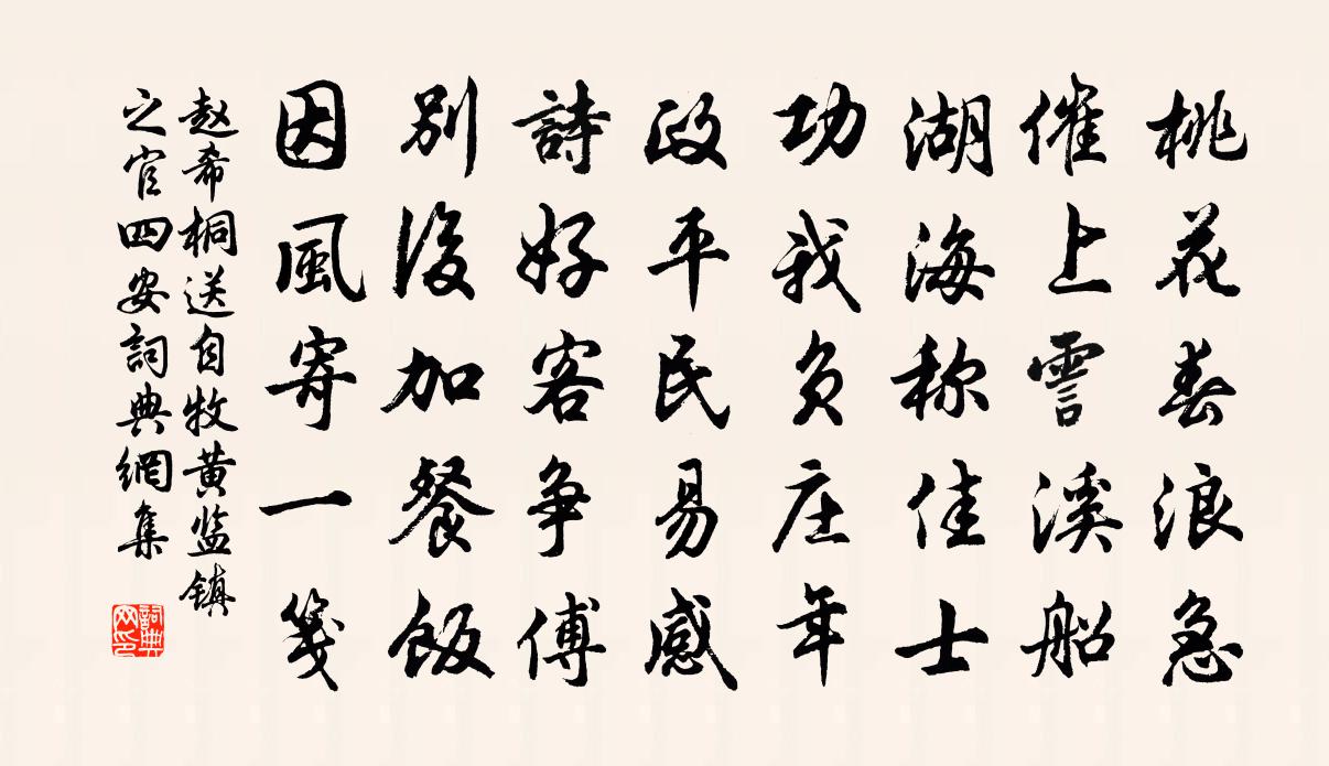 詩詞名句歷史字典書法欣賞書法字典國語詞典說文解字康熙字典古漢語字典標 題 作 者 詩 句 送自牧黃監鎮之官四安作者:趙希桐 朝代:宋代送自牧黃監鎮之官四安原文桃花春浪急,催上霅溪船。湖海稱佳士,功我負莊年。政平民易感,詩好客爭傅。別後加餐飯,因風寄一箋。詩詞問答問:送自牧黃監鎮之官四安的作者是誰?答:趙希桐問:送自牧黃監鎮之官四安寫於哪個朝代?答:宋代趙希桐送自牧黃監鎮之官四安書法欣賞送自牧黃監鎮之官四安書法作品詩詞推薦玉屏峰汪士鋐〔清代〕玉屏峙霄漢,鳥道度松門。昨日登臨處,諸峰屐底存。雲生甘在下,嶂出爾何尊。極目無窮盡,空青抹一痕。上陳招使劉煒叔〔宋代〕天戈一指迅雷轟,涌雪公應記洗兵。伊洛風煙想如舊,江淮草木轉知名。爭先識面今裴度,孰與論心昔孔明。文水白龜許及之〔宋代〕物有為身累,龜靈卻受鑽。毛公今放汝,珍重保身安。過疏山題一覽亭梁溪公所書也二首胡寅〔宋代〕林梢斜月墮金盆,接影蒼茫日霧翻。欲倚小欄收遁景,試憑長嘯卷遐昏。寒山濯濯空堆皺,野水瀰瀰不待源。莫道華州祗役往馮翊留別楚正叔司馬光〔宋代〕芳菲不得駐,會取余春不。欲知回首處,渭曲蒼茫間。鹿鳴宴貢士程公許〔宋代〕蜀莊故里好揚鄰,不盡斯文萬古存。漢詔十行銜彩鳳,禹門 * 躍潛鱗。傾心射策恩方渥,努力催堅語忌陳。一第疇依王柏〔宋代〕巍乎大哉,堯之為君。其仁如天,其知如神。鑿井耕田,出作入息。擊壤而歌,不知帝力。以讀書破萬卷下筆如有神為韻賦十詩送趙然然方回〔宋代〕朱先之桑梓,如我二人者。趙子於吟詩,一字不妄下。虛叟明八十,硉矹老病馬。年齡已衰頹,文字亦苟且。瞿唐峽陽枋〔宋代〕壁絕書昏明,猿 * 佛音。不關天宇窄,自是峽流深。既曉遲朝日,未西還夕陽。扁中舟涉險,憑取有孚心。和人見贈蘇軾〔宋代〕只寫東坡不著名,此身已是一長亭。壯心無復春流起,衰鬢從教病葉零。知有雪兒供筆硯,應嗤灶婦洗盆瓶。回來送李溟秀才西行許渾〔唐代〕萬里不辭勞,寒裝疊縕袍。停車山店雨,掛席海門濤。鷹勢暮偏急,鶴聲秋更高。知君北邙路,留劍泣黃蒿。謁金門 採石花朝梁寅〔元代〕春正美。處處艷桃*李。記省花晨今日是,柰何辭帝里。採石蘭橈暫倚。且與舟人同醉。心已到家身尚未。客中聊五言戲贈呂神童行嚴煥〔宋代〕自我諏人物,天涯實眇然。晚觀童子意,早拍病夫肩。凜凜神鋒異,琅琅腹笥傳。晴溫武林道,光怪呂家船。奉使契丹二十八首其五絕句二首之一蘇轍〔宋代〕亂山環合疑無路,小徑縈迴長傍溪。仿佛夢中尋蜀道,興州東谷鳳州西。出居庸關汪元量〔宋代〕平生愛讀書,反被讀書誤。今辰出長城,未知死何處。下馬古戰場,荊榛莽回互。群狐正從橫,野梟號古樹。黑雲李邦直見邀終日對臥南城亭上二首蘇轍〔宋代〕一徑坡陀草木間,孤亭勝絕俯川原。青天圖畫四山合,白晝雷霆百步喧。煙柳蕭條漁市遠,汀洲蒼莽白鷗翻。客舟再得崇道觀寄王左史項安世〔宋代〕藥鼎無時手自煎,萬囊長在枕頭邊。罪今脫矣從頭白,病已安之用涕漣。始悟舊詩成卦影,只消崇道了天年。故人將之荊州南與張伯剛馬惣鍾陵夜別楊衡〔唐代〕荊台別路長,密緒分離狀。莫訴杯來促,更籌屢已倡。燭花侵霧暗,瑟調寒風亮。誰念曉帆開,默睇參差浪。詠史上田橫陳普〔宋代〕宗族幾為孔子焚,為秦未幾又為塵。田橫更欲橫河嶽,不把英雄讓與人。秋日對酒武元衡〔唐代〕行年過始衰,秋至獨先悲。事往憐神魄,感深滋涕洟。百憂紛在慮,一醉兀無思。寶瑟拂塵匣,徽音凝朱絲。幽圃名句推薦內省不疚,夫何憂何懼!孔子弟子《論語·顏淵篇》 記取江湖泊船處,臥聞新雁落寒汀。陸游《夜泊水村》 此夜星繁河正白,人傳織女牽牛客。沈佺期《七夕曝衣篇》 衰蘭送客鹹陽道,天若有情天亦老。李賀《金銅仙人辭漢歌》 讀書須用意,一字值千金。佚名《增廣賢文·上集》 夜闌臥聽風吹雨,鐵馬冰河入夢來。陸游《十一月四日風雨大作》 年年端午風兼雨,似為屈原陳昔冤。趙蕃《端午三首》 美人結長想,對此心悽然。李白《折楊柳》 天秋日正中,水碧無塵埃。柳宗元《湘口館瀟湘二水所會》 有理言自壯,負屈聲必高。馮夢龍《警世通言·卷十五》