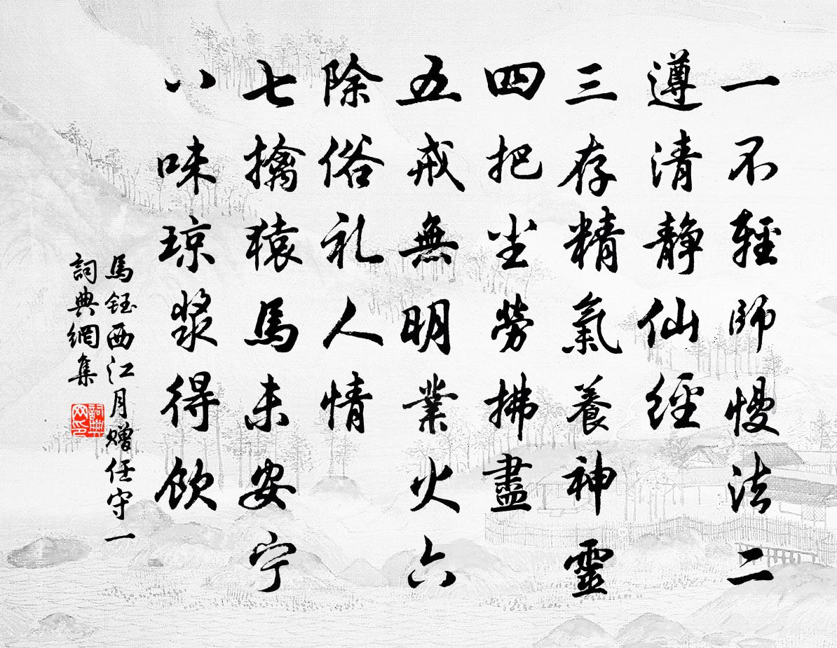 詩詞名句歷史字典書法欣賞書法字典國語詞典說文解字康熙字典古漢語字典標 題 作 者 詩 句 西江月 贈任守一作者:馬鈺 朝代:元代西江月 贈任守一原文一不輕師慢法,二遵清靜仙經。三存精氣養神靈。四把塵勞拂盡。五戒無明業火,六除俗禮人情。七擒猿馬未安寧。八味瓊漿得飲。詩詞問答問:西江月 贈任守一的作者是誰?答:馬鈺問:西江月 贈任守一寫於哪個朝代?答:元代問:西江月 贈任守一是什麼體裁?答:詞馬鈺西江月 贈任守一書法欣賞西江月 贈任守一書法作品詩詞推薦偈頌七十一首釋了惠〔宋代〕的的此事,真不可說。不可說中真可說,真可說,無可說。齒臨部臨,急急敕攝。秋夕病中作李中〔唐代〕臥病當秋夕,悠悠枕上情。不堪拋月色,無計避蟲聲。煎藥惟憂澀,停燈又怕明。曉臨清鑒里,應有白髭生。送行和楊廷秀韻楊時〔宋代〕學粗知方始為人,敢崇文貌獨真誠。意雖阿世非忘世,志不謀身豈誤身。逐遇寬恩猶得祿,歸沖臘雪自生春。君詩觀書有感胡宏〔宋代〕一點銀蟾在碧空,千載堞廓夜玲瓏。回首昔日遨遊處,覺得分明是管中。代陳均輔贈馬則賢黃樞〔宋代〕江南星渚山水奇,馬家桂子昌於醫。此心契天雄傑者,滿軒種杏仁間馳。身雖如蟬蛻濁世,活人遠志傳孫枝。偶同郊居與八弟無斁讀書晁補之〔宋代〕坐狂得世捐,作官故不了。十年未弛負,半世不黔灶。居然顏玉雪,及是鬢蓬葆。碧山已焚魚,白水初種稻。瓜區歸塗觀劉寺新疊石山楊萬里〔宋代〕風月肝脾水雪胸,道人妙手鑿虛空。斫翻諸嶺雲煙骨,幻出山岩紫翠峰。細看分明非飣餖,如何雕得許玲瓏。為誰偈頌十五首釋法薰〔宋代〕飛來峰高攀不上,冷泉水深飲不竭。衲僧到此擬奚為,盡力神疲好休歇。洞仙歌吳潛〔宋代〕□□□□,□□□□瘦。□□□□□□酒。□□深,碎蕊殘萼都收,歸簟枕,誰道梔橐敢就。月邊偏愛惜,冰玉肌袁州人謔彭伉佚名〔宋代〕湛賁及第,彭伉落驢。周仁甫輓詩王炎〔宋代〕人物今難得,如君孰比肩。干將鋒立斷,神駿氣無前。官不過為縣,天胡嗇與年。空聞精爽在,廟食桂江邊。和張洵蒙亭詩韻尚用之〔宋代〕江亭勝概冠三湘,仁智所樂皆其旁。翠岫俯映青羅光,上有喬木摩穹蒼。亭下川遐覆銀塘,水面風來笑語香。騷人野店沈說〔宋代〕幽人逢野客,相約過雲莊。去路稻梁熟,入山松柏香。試霜寒尚薄,落葉夜初長。對坐煨茅栗,瓶中取酒嘗。偈頌七十八首釋正覺〔宋代〕山雲冉冉,江水茫茫。正不居位,偏不涉傍。顯而不露,隱而彌彰。猿啼古木音聲急,鶴宿枯松夢寐長。朔風作寒紅羅襖陳允平〔宋代〕別來書漸少,家遠夢徒歸。念去燕來鴻,愁隨秋到,舊盟新約,心與天知。楚江上、木落林稀。西風尚隔心期。水包家山看桃花胡仲弓〔宋代〕春風吹到小桃根,便覺仙凡有路分。紫氣直衝文德殿,彩霞隔斷武陵源。錦官城向山頭出,玉蹕聲從天上聞。一見再和項安世〔宋代〕廣文已荒茆屋,彭澤浪恥虛罍。二頃平生幽願,一梨歸處深推。送略禪者歸南嶽齊己〔唐代〕林下鍾殘又拂衣,錫聲還獨向南飛。千峰冷截冥鴻處,一徑險通禪客歸。青石上行苔片片,古杉邊宿雨霏霏。勞生虞美人·曲闌乾外天如水晏幾道〔宋代〕曲闌乾外天如水,昨夜還曾倚。初將明月比佳期,長向月圓時候、望人歸。羅衣著破前香在,舊意誰教改。—春離殘句:陳師道〔宋代〕早晚望夫能化石,盡分人世作支機。名句推薦登車宿遷北,萬頃鋪瓊田。陸文圭《宿遷道中遇雪》 失意還獨語,多愁只自知。張籍《薊北旅思 / 送遠人》 蓮朝開而暮合,至不能合,則將落矣王永彬《圍爐夜話·第六九則》 漢月垂鄉淚,胡沙費馬蹄。岑參《磧西頭送李判官入京》 正是天山雪下時,送君走馬歸京師。岑參《天山雪歌送蕭治歸京》 河橋送人處,涼夜何其。周邦彥《夜飛鵲·河橋送人處》 但見淚痕濕,不知心恨誰。李白《怨情》 凡兵有四機:一曰氣機,二曰地機,三曰事機,四曰力機。吳起《吳子·論將》 樓台處處迷芳草,風雨年年怨落花。曾棨《維揚懷古》 綠淨春深好染衣。際柴扉。賀鑄《釣船歸·綠淨春深好染衣》