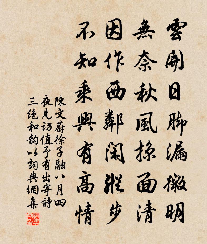 詩詞名句歷史字典書法欣賞書法字典國語詞典說文解字康熙字典古漢語字典標 題 作 者 詩 句 徐子融八月四夜見訪值予有出寄詩三絕和韻以作者:陳文蔚 朝代:宋代原文雲開日腳漏微明,無奈秋風掠面清。因作西鄰閒縱步,不知乘興有高情。詩詞問答問:《徐子融八月四夜見訪值予有出寄詩三絕和韻以》的作者是誰?答:陳文蔚問:該詩寫於哪個朝代?答:宋代書法欣賞徐子融八月四夜見訪值予有出寄詩三絕和韻以書法作品詩文賞析【原題】:徐子融八月四夜見訪值予有出寄詩三絕和韻以謝詩詞推薦爇心香 贈華亭張大悟馬鈺〔元代〕大悟之人,能放心閒。棄利名、愛海恩山。食無求飽,居不求安。更不狂思,不下忽,不高攀。協氣橫橫,苦霞珊景祐親享太廟二首真宗〔宋代〕於穆真皇,宅心道粹。和武偃革,煥乎文治。操操拜圖,封天祀地。盛德為示,函賞萬世。和子瞻次韻陶淵明勸農詩蘇轍〔宋代〕我遷海康,實編於民。少而躬耕,老復其真。乘流得坎,不問所因。願以所知,施及斯人。錦堂春 此下原有神光燦修行之士一首未注名佚名〔宋代〕睡魔王。百般作害為殃。白日間、猶教可,夜更深、無處潛藏。惱得人、昏如痴醉,懷修行、輕送無常。眼若膠粘句毛德如〔宋代〕城頭松柏鎖愁煙。和李少卿見貽之什李新〔宋代〕碧 * 嶂冷翻光,水鏡冰壺照座涼。舜日有時琴自動,鱸魚何處鱠飛香。竹開細尾攙先出,雀引新雛底事忙。老去有感姜特立〔宋代〕六年歸老掩柴扉,今日天涯有所思。山阻雪深無去路,淒涼只詠四愁詩。題友人書齋新壁文同〔宋代〕彩梔縱橫設,雕廚次第開。須防何法盛,直入此中來。鷺鷥鄭獬〔宋代〕小屏飛鷺雪褵褷,窗影初搖晚竹枝。獨倚枕函無一事,無何鄉里覺來時。羊角田劉榘〔宋代〕羊角仙人在何許,江南杳靄蒼煙暮。空餘拳石在人間,至今指作神仙處。當年館宇幻玲瓏,只今阻絕那能逢。市上連句多暇贈陸三山人耿湋〔唐代〕一生為墨客,幾世作茶仙。 ——耿湋喜是攀闌者,慚非負鼎賢。 ——陸羽禁門聞曙漏,顧渚入晨煙。 ——耿夷門汪遵〔唐代〕晉鄙兵回為重難,秦師收旆亦西還。今來不是無朱亥,誰降軒車問抱關。送張員外出牧岳州錢起〔唐代〕鳳凰銜詔與何人,喜政多才寵寇恂。台上鴛鸞爭送遠,岳陽雲樹待行春。自憐黃閣知音在,不厭彤幨出守頻。應笑宿石門山居雍陶〔唐代〕窗燈欲滅夜愁生,螢火飛來促織鳴。宿客幾回眠又起,一溪秋水枕邊聲。北苑十詠出東門向北苑路蔡襄〔宋代〕曉行東城隅,光華著諸物。溪漲浪花生,山晴鳥聲出。稍稍見人煙,川原正蒼鬱。春寒二首張耒〔宋代〕漠漠陰還合,迢迢日自長。雲容將雨露,山意自風霜。欄甲青辭土,園枝笑倚牆。薄寒能幾許,春雨滿池塘。摸魚子 賦白蓮 至元二十二年乙酉九月重九王惲〔元代〕淡亭亭、影搖溪水,芳心知為誰吐。玉華寶供年年事,消得一天消露。私自語。君不見仙家,玉井無今古。淡妝誰送姚杭州賈島〔唐代〕白雲峰下城,日夕白雲生。人老江波釣,田侵海樹耕。吳山鍾入越,蓮葉吹搖旌。詩異石門思,濤來向越迎。臨江仙(與同官飲于海棠花下,燒燭照花即席賦)魏了翁〔宋代〕自有天然真富貴,本來不為人妍。謹將醉眼著繁邊。更擎高燭照,驚攪夜深眠。花不能言還自笑,何須有許多般。擬寒山拾得二十首王安石〔宋代〕莫嫌張三惡,莫愛李四好。既往侂即晚,未來思又早。見之亦何有,欻然如電掃。惡既是磨滅,好亦難長保。若令名句推薦嶺外音書斷,經冬復歷春。宋之問《渡漢江》 飄風不終朝,驟雨不終日。老子《老子·道經·第二十三章》 江漢思歸客,乾坤一腐儒。杜甫《江漢》 野梅燒不盡,時見兩三花劉基《古戍》 明月如霜,好風如水,清景無限。蘇軾《永遇樂·彭城夜宿燕子樓》 春已歸來,看美人頭上,裊裊春幡。辛棄疾《漢宮春·立春日》 袨服華妝著處逢,六街燈火鬧兒童。元好問《京都元夕》 昭昭若日月之明,離離如星辰之行劉勰《文心雕龍·宗經》 民之無良,相怨一方,受爵不讓,至於己斯亡。荀子《荀子·儒效》 不可同日而語畢沅《續資治通鑑·宋紀·宋紀七十三》