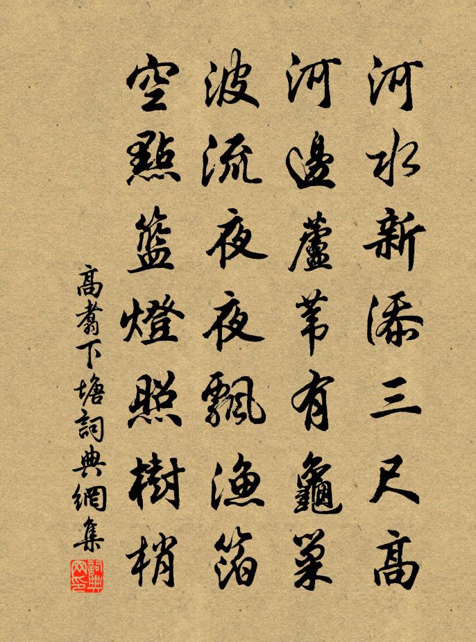 詩詞名句歷史字典書法欣賞書法字典國語詞典說文解字康熙字典古漢語字典標 題 作 者 詩 句 下塘作者:高翥 朝代:宋代下塘原文河水新添三尺高,河邊蘆葦有龜巢。波流夜夜飄漁箔,空點籃燈照樹梢。詩詞問答問:下塘的作者是誰?答:高翥問:下塘寫於哪個朝代?答:宋代高翥下塘書法欣賞下塘書法作品詩詞推薦隆興書堂自警三十五首陳淳〔宋代〕心藏隱奧中,乘間亦易動。須於動之微,堅持勿使縱。挽宜人李氏曾豐〔宋代〕僧戒阿誰受,法儀何處迎。兩回經夢境,三嘆悟人生。食已難為強,衣猶不憚更。得非禪力重,去住目由情。憶舊遊(過故園有感)張炎〔宋代〕記凝妝倚扇,笑眼窺簾,曾款芳尊。步屧交枝徑,引生香不斷,流水中分。忘了牡丹名字,和露撥花根。甚杜牧重歸途葉茵〔宋代〕春來天氣半陰晴,那更賓士一月程。又恐花時成草草,還家插柳佐清明。清心鏡 京兆全真庵馬鈺〔元代〕皮張仙,修造主。一身兩役,兼為化主。修庵舍、獨辦一間,禱長安施主。論修行,分賓主。悟取氣神,與身為主青玉案黎廷瑞〔宋代〕巨舟雙櫓鳴鵝鸛。千萬頃、玻璃面。宇宙浮萍堪永嘆。黃唐開闢,秦隋爭戰。不把江山換。蘆花新雪秋撩亂。何處雜曲歌辭。東飛伯勞歌李暇〔唐代〕秦王龍劍燕後琴,珊瑚寶匣鏤雙心。誰家女兒抱香枕,開衾滅燭願侍寢。瓊窗半上金縷幬,輕羅隱面不障羞。青綺嘉禾百詠南塢張堯同〔宋代〕岸回波曲曲,城轉草層層。忽見桃花落,還知到武陵。風入松(癸已壽須溪)尹濟翁〔宋代〕曾聞幾度說京華。愁壓帽檐斜。朝衣熨貼天香在,如今但、彈指蘭闍。不是柴桑心遠,等閒過了元嘉。長生休說棗楚宮詞二首薛奇童〔唐代〕禁苑春風起,流鶯繞合歡。玉窗通日氣,珠箔卷輕寒。楊葉垂陰砌,梨花入井欄。君王好長袖,新作舞衣寬。日晚挽寧宗皇帝章六首王邁〔宋代〕帝業親耆定,皇圖日靖嘉。憂民比仁祖,在位邁重華。謨烈詒千載,車書混一家。最悲行蹕地,哀些咽簫笳。清曉湖上三首楊萬里〔宋代〕山腰輕束一綃雲,湖面初顰半蹙痕。未說湖山佳處在,清晨小出涌金門。墨菊圖唐寅〔明代〕綠雲架上草龍蟠,馬乳含秋露下乾。昨日文園愁肺渴,幾丸嚼破蔗漿寒。淳熙二年發太上皇帝太上皇后冊寶十一首佚名〔宋代〕蚴蟉青龍,婉嬗象興。其載伊何,煌煌金書。乃由端門,乃行康術。於以榮親,振古所無。詠史詩漢中胡曾〔唐代〕荊棘蒼蒼漢水湄,將壇菸草覆余基。適來投石空江上,猶似龍顏納諫時。雪十首楊公遠〔宋代〕只應王母宴瑤池,宴罷群仙趁醉歸。駕鳳鞭鸞仍馭鶴,滿空風卷羽毛飛。偈傾一百三十三首釋法薰〔宋代〕高峰方丈,內外皆空。垂鉤四海,只釣獰龍。雨歇劉子翬〔宋代〕雨歇長虹淡欲收,疏疏寒靄暮依樓。西風滿院催搖落,已覺梧桐不耐秋。北歸回首謝庾嶺曾豐〔宋代〕五羊一住閱三冬,諳盡人情與土風。醫拙市空多藥物,肉平官又少庖工。大寒氣候國中伏,稚子顏容七十翁。天下旅店早起薛嵎〔宋代〕半醒夢猶在,擁衾無限情。曉窗燈影淡,山路雪吟清。歲暮羨歸客,囊空兼去程。故書多廢理,驚愧動驚旌。名句推薦靄芳陰未解,乍天氣、過元宵。周端臣《木蘭花慢·送人之官九華》 秋風吹地百草乾,華容碧影生晚寒。李賀《開愁歌》 物舍其所長,之其所短,堯亦有所不及矣劉向《戰國策·齊三·孟嘗君有舍人而弗悅》 胡風吹代馬,北擁魯陽關。李白《豫章行》 萬里無人收白骨,家家城下招魂葬。張籍《征婦怨》 年年越溪女,相憶采芙蓉。杜荀鶴《 * 怨》 生無一日之歡,死有萬世之名。列子及其弟子《列子·楊朱》 人有不及,可以情恕。房玄齡《晉書·列傳·第六章》 止戈為武。左丘明《左傳·宣公·宣公十二年》 美人如花隔雲端。李白《長相思三首》