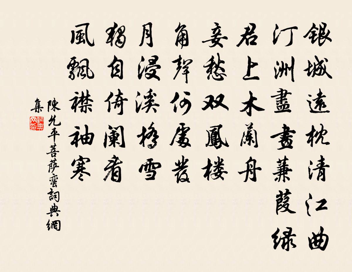 詩詞名句歷史字典書法欣賞書法字典國語詞典說文解字康熙字典古漢語字典標 題 作 者 詩 句 菩薩蠻作者:陳允平 朝代:宋代菩薩蠻原文銀城遠枕清江曲。汀洲盡畫蒹葭綠。君上木蘭舟。妾愁雙鳳樓。角聲何處發。月浸溪橋雪。獨自倚闌看。風飄襟袖寒。詩詞問答問:菩薩蠻的作者是誰?答:陳允平問:菩薩蠻寫於哪個朝代?答:宋代問:菩薩蠻是什麼體裁?答:詞陳允平菩薩蠻書法欣賞菩薩蠻書法作品詩詞推薦紹興祀岳鎮海瀆四十三首佚名〔宋代〕禮樂既成,肅容有常。奄留消搖,申畢重觴。仰臚所求,降福滂洋。師象山則,以況皇帝。古勸學行蘇籀〔宋代〕昔歲原伯魯,前日棘子成。所謂悉常事,野哉亦苟生。豈知負孔聖,義理如何行。善飯斯為福,食肉其堪盲。六籍代呼延信夫以筍乞貓於韓子云章甫〔宋代〕官居城一隅,屋漏如野處。辛勤補綠蘿,僅可待風雨。移家幸亡恙,所苦多碩鼠。齧衣費紉縫,盜肉恣含咀。引子定風波王哲〔元代〕里閒人戶外閒。方遊歷白雲間。射日臨光景媚,*前明朗見崑山。得怡然諸爭略。,中珍寶好躋攀。里金花開馥馥夢覺釋文珦〔宋代〕岝崿東邊舊草堂,久拋日日費思量。夢中分曉曾歸去,覺後身仍在異鄉。既為誼夫賦墳廬詩乃蒙和韻再成十首為謝兼簡郭印〔宋代〕伏羲畫卦後,文字積丘山。誰知聖人意,要妙唯一言。念奴嬌(夏日避暑)仲殊〔宋代〕故園避暑,愛繁陰翳日,流霞供酌。竹影篩金泉漱玉,紅映微花簾箔。素質生風,香肌無汗,繡扇長閒卻。雙鸞棲挽處士吳德載二首陳棣〔宋代〕憶昔知公日,東嘉逆旅中。游從三月久,談笑一樽同。卻暑瓜盤綠,亨鮮膾箸紅。傷心棲止地,萬事轉頭空。孝宗皇帝輓詞五首陳傅良〔宋代〕藝祖開皇極,何心畀後昆。天將翊堯運,世復見湯孫。武接規模在,仁追典則存。煌煌宋宗社,永永配乾坤。錢道人不飲酒食肉囊中不畜一錢所須飯及草屨陸游〔宋代〕誤辱君王賜鏡湖,身隨鷗鷺寄菰蒲。行年八十猶強健,欲伴先生去得無?放言五首劉克莊〔宋代〕鏡悲鸞獨舞,射感雉雙飛。早認色空是,晚知婚宦非。奉和九月九日登慈恩寺浮圖應制王景〔唐代〕玉輦移中禁,珠梯覽四禪。重階清漢接,飛竇紫霄懸。綴葉披天藻,吹花散御筵。無因鑾蹕暇,俱舞鶴林前。丁未南徐燈夕南徐燈夕黃彥平〔宋代〕王正三五漫佳節,濁酒寒燈且眼前。無復鼓歌祠太一,真成烽火照甘泉。疏梅欹雪遙相憶,淡月籠雲也自圓。北極依韻和持國新植西軒梅堯臣〔宋代〕開地臨廣衢,崇崇十餘畝。新軒稍偏北,治圃亦西酉。盎中植菡萏,水不過升斗。小桂未得地,驗活徒掐朽。上乏樂府雜曲鼓吹曲辭巫山高二首沈佺期〔唐代〕巫山峰十二,環合隱昭回。俯眺琵琶峽,平看雲雨台。古槎天外倚,瀑水日邊來。何忽啼猿夜,荊王枕席開。神女樓上會友述懷王珪〔唐代〕煙城疏雨隔斜陽,一上危樓睇大荒。原憲自貧非苦病,次公未飲已多狂。江帆來往年光度,驛堠東西客意長。最愛寄龍井辯才法師三絕蘇轍〔宋代〕我兄教我過東吳,遺墨山間無處無。忽報冬潮催出堰,俗緣深重道心粗。久疾灼艾小愈晚出門外陸游〔宋代〕老境侵凌病滿軀,火攻下策得枝梧。沽來村酒初判醉,叱去山童不遣扶。霜重木凋鴉可數,溪清魚見鸛相呼。興闌畫堂春趙彥端〔宋代〕滿城風雨近重陽。夾衫清潤生香。好辭賡盡楚天長。喚得花黃。客勝不知門陋,酒新如趁春狂。故人相見等相忘。橫山劉倓〔宋代〕一溪徑險僕夫劬,三酌油油醉筍輿。隔岸火焱三四點,不知誰照夜灘魚。名句推薦功遂身退,天之道老子《老子·道經·第九章》 中秋誰與共孤光。把盞悽然北望。蘇軾《西江月·世事一場大夢》 江南春盡離腸斷,苹滿汀洲人未歸。寇準《江南春·波渺渺》 能近取譬,可謂仁之方也已。孔子弟子《論語·雍也篇》 少年聽雨歌樓上。紅燭昏羅帳。蔣捷《虞美人·聽雨》 平明尋白羽,沒在石棱中。盧綸《和張僕射塞下曲六首》 葡萄美酒夜光杯,欲飲琵琶馬上催。王翰《涼州詞二首·其一》 春水迷天,桃花浪、幾番風惡。張元乾《滿江紅·自豫章阻風吳城山作》 天之生此民也,使先知覺後知,使先覺覺後覺也。孟子《孟子·萬章章句上·第七節》 酒賤常愁客少,月明多被雲妨。蘇軾《西江月·世事一場大夢》