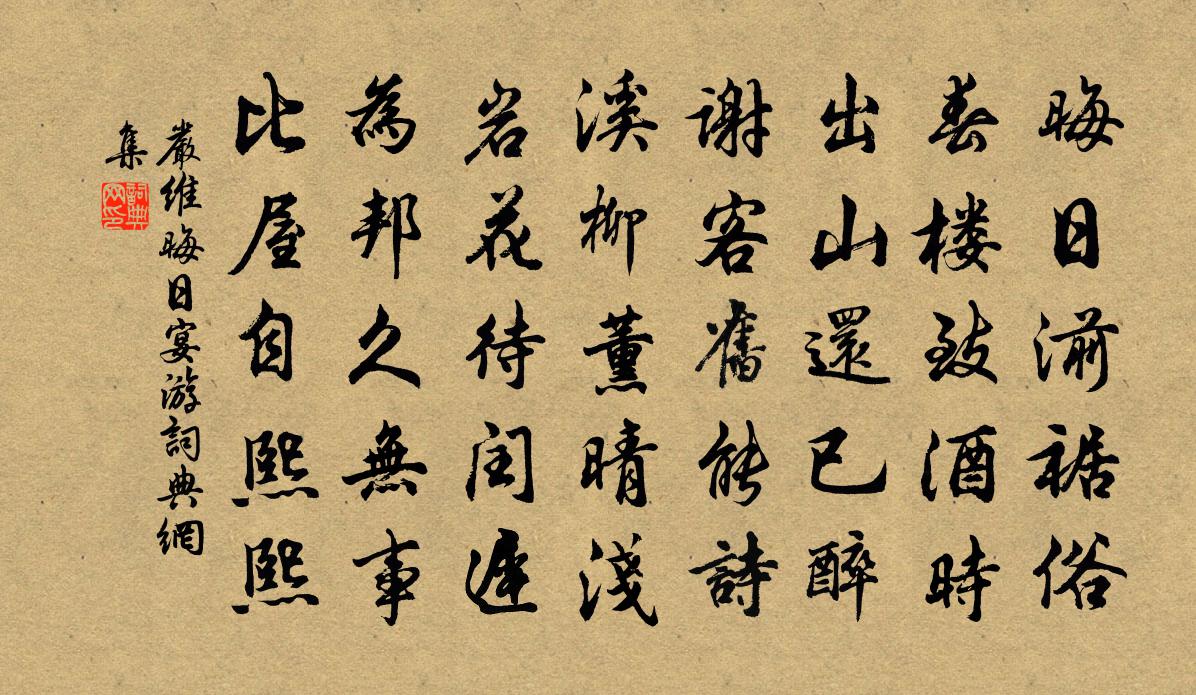 詩詞名句歷史字典書法欣賞書法字典國語詞典說文解字康熙字典古漢語字典標 題 作 者 詩 句 晦日宴遊作者:嚴維 朝代:唐代晦日宴遊原文晦日湔裾俗,春樓致酒時。出山還已醉,謝客舊能詩。溪柳薰晴淺,岩花待閏遲。為邦久無事,比屋自熙熙。詩詞問答問:晦日宴遊的作者是誰?答:嚴維問:晦日宴遊寫於哪個朝代?答:唐代問:晦日宴遊是什麼體裁?答:五律嚴維晦日宴遊書法欣賞晦日宴遊書法作品注釋全唐詩:卷263_43詩詞推薦贈陳宗之葉紹翁〔宋代〕十載京塵染布衣,西湖煙雨與心違。隨車尚有書千卷,擬向君家賣卻歸。述志詩洪秀全〔清代〕手握乾坤殺伐權,斬邪留正解民懸。眼通西北江山外,聲振東南日月邊。展爪似嫌雲路小,騰身何怕漢程偏。風雷題阮步兵祠二首宋祁〔宋代〕濟世非無策,迷邦詎可求。昏酣酒壚臥,蕭散竹林游。俗眼嗟人廢,窮途逐涕流。何公真禮法,甯免疾如讎。【雙調】沉醉東風_釣台貂裘敝張可久〔元代〕釣台貂裘敝誰憐倦客,錦箋寒難寫秋懷。野水邊,閒雲外,盡教他鷗鷺驚猜。溪上良田得數頃來,也敢上嚴陵釣台覽從兄鹹劍池編宋祁〔宋代〕競爽吾宗屬俊翹,凌雲辭氣剩飄飄,十年締思輕傖賦,一骨評風壓楚謠。從玩書窗迷野馬,長吟秋社續寒蜩。次韻無為使君尊兄見寄之什張栻〔宋代〕江山接境相望近,風雨一春音問疎。安得從公苕霅上,幅巾一葉臥看書。和劉右司淳于送牡丹病中賦呂行中〔宋代〕天姿國艷燦芳柯,相亞紅黃詫綺羅。高擬營邱名冠絕,未饒伊洛品敏多。敢邀使座開青眼,為嘆英華墜綠莎。亭館南軒陳師道〔宋代〕少日書林頗著勛,暮年貪佛替論文。銅爐瓦枕芒鞋裡,此外惟須對此君。滕王閣黃復之〔宋代〕飛閣岧嶢倚天半,千里秋毫掌中看,城下江聲鐵馬行,梁間日影金蛇竄。詞客寂寥光景閒,秀色不改惟西山。朝來好事近周紫芝〔宋代〕雨後欲斜陽,紅滿井梧風葉。還是夜來時候,共小軒明月。不關縴手與調冰,消除這些熱。自是月娥肌骨,似玉壺含雲寺書事六絕句楊時〔宋代〕蝶夢輕揚一室空,夢回誰識此身同。窗前月冷松陰碎,一枕溪聲半夜風。白帝樓杜甫〔唐代〕漠漠虛無里,連連睥睨侵。樓光去日遠,峽影入江深。臘破思端綺,春歸待一金。去年梅柳意,還欲攪邊心。王廷憑臻知廬州舒城縣楊億〔宋代〕潁水生賢自古奇,西遊聲價滿京師。梁園獻賦天將雪,潘縣臨民鬢未絲。南浦銷魂分袂處,北堂獻壽捧觴時。到官送遷客二首於鵠〔唐代〕得罪誰人送,來時不到家。白頭無侍子,多病向天涯。莽蒼凌江水,黃昏見塞花。如今賈誼賦,不漫說長沙。流人昨於發運馬御史求海味馬已歸闕吳正仲忽分餉梅堯臣〔宋代〕前欲淮南求海物,緘書未發報還台。陸機黃耳何時至,罌品分傳事按杯。偈傾一百六十九首釋智朋〔宋代〕西天此土,十萬餘程。胡言易會,漢語難明。聞鶴徐集孫〔宋代〕千年華表竟何榮,曾結孤山夙世盟。午夜露零和月冷,一聲風靜仰天鳴。既歸蕙帳情何怨,不上揚州韻更清。未必舉酒吟邵雍〔宋代〕閒與賓朋飲酒杯,杯中長似有花開。清談才向口中出,和氣已從心上來。物外意非由象得,坐間春不自天回。施之訪孟令不遇毛滂〔宋代〕扶病尋君君未歸,添香應惹踏門衣。東風未破桃花萼,雪壓余英蝶亂飛。鷓鴣天陳三聘〔宋代〕酒暈從教上臉丹。春愁何事點眉山。都將別後深深意,且向尊前細細看。多少恨,說應難。粉巾空染淚斕斑。爐猊名句推薦春日宴,綠酒一杯歌一遍。馮延巳《長命女·春日宴》 白鳥一雙臨水立,見人驚起入蘆花。戴復古《江村晚眺》 花影不離身左右,鳥聲只在耳東西。曹雪芹《紅樓夢·第二十八回》 白髮悲花落,青雲羨鳥飛。岑參《寄左省杜拾遺》 微暈嬌花濕欲流,簟紋燈影一生愁。納蘭性德《浣溪沙·詠五更和湘真韻》 會桃花之芳園,序天倫之樂事李白《春夜宴桃李園序/春夜宴從弟桃花園序》 上言加餐食,下言長相憶。佚名《飲馬長城窟行》 只願君心似我心,定不負相思意。李之儀《卜運算元·我住長江頭》 況是青春日將暮,桃花亂落如紅雨。李賀《將進酒》 帶長劍兮挾秦弓,首身離兮心不懲。屈原《國殤》