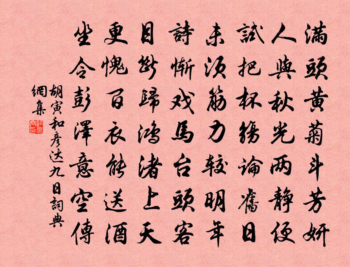 詩詞名句歷史字典書法欣賞書法字典國語詞典說文解字康熙字典古漢語字典標 題 作 者 詩 句 和彥達九日作者:胡寅 朝代:宋代和彥達九日原文滿頭黃1/1菊斗芳妍,人與秋光兩靜便。試把杯觴論舊日,未須筋力較明年。詩慚戲馬台頭客,目斷歸鴻渚上天。更愧百衣能送酒,坐令彭澤意空傳。詩詞問答問:和彥達九日的作者是誰?答:胡寅問:和彥達九日寫於哪個朝代?答:宋代胡寅和彥達九日書法欣賞和彥達九日書法作品詩詞推薦游張公祠二首李曾伯〔宋代〕十年重過石橋行,松下清流載濯纓。洞隔煙霞知地遠,壇連仙佛信天成。人如雲意俱閒適,山帶霜容似瘦生。步出詠痴吳人〔唐代〕榆兒復榆婦,造屋兼造車。十七 * 夜,還書復借書。送周仲材罷官還婺女侍旁趙蕃〔宋代〕天風索索鳴枯桑,天寒自茲繁雪霜。故人別我向何許,蘭溪水深葦可杭。憶初識君上君堂,論交許參鴻雁行。三年贈薛東湖牟巘五〔宋代〕悠哉東湖水,不迎亦不隨。相對澹無談,可以樂我飢。秋晚溪上宋祁〔宋代〕積水增波潤,蒼霞變露餘。斷煙隨鳥遠,寒葉向人疏。萍老猶迎日,蓮衰尚戲魚。臨川方病涉,誰借鄭卿輿。金陵白楊十字巷李白〔唐代〕白楊十字巷,北夾湖溝道。不見吳時人,空生唐年草。天地有反覆,宮城盡傾倒。六帝餘古丘,樵蘇泣遺老。立春方岳〔宋代〕適禁樂令春啞,先辦秋治社聾。銀勝鬢毛班白,瓊絲菜縷青紅。細雨陳與義〔宋代〕避寇煩三老,那知是勝游。平湖受細雨,遠岸送輕舟。天地悲深阻,山川慰久留。參差發鄰舫,未覺壯心休。初夏雜興陸游〔宋代〕巾脫冠欹八尺床,竹陰槐影有餘涼。隨風花墮殘棋上,引睡書拋倦枕傍。水長沙鷗向人熟,雨余巢燕哺雛忙。尚嫌聞戴敬夫由越入閩邢昉〔清代〕湖縣忽離群,兵車諒未聞。揭竿真草草,暴骨竟紛紛。秋隔苕花岸,心悲建業雲。遙思於役意,不為武夷君。菩薩頂康熙〔清代〕四十餘年禮世伽,本來面目是天家。清涼無物何所有,葉斗峰橫問法華。宿黃花館楊發〔唐代〕孤館蕭條槐葉稀,暮蟬聲隔水聲微。年年為客路無盡,日日送人身未歸。何處離鴻迷浦月,誰家愁婦擣霜衣。夜深南還湘水言懷張九齡〔唐代〕拙宦今何有,勞歌念不成。十年乖夙志,一別悔前行。歸去田園老,倘來軒冕輕。江間稻正熟,林里桂初榮。魚意米囊花郭震〔唐代〕開花空道勝於草,結實何曾濟得民。卻笑野田禾與黍,不聞弦管過青春。初夏遊楞伽精舍皮日休〔唐代〕越舼輕似萍,漾漾出煙郭。人聲漸疏曠,天氣忽寥廓。伊予愜斯志,有似劀□瘼。遇勝即夷猶,逢幽且淹泊。俄然雪晴二首白玉蟾〔宋代〕早上新鶯語尚蠻,花無氣力倚雕欄。幸蒙殘雪回頭早,又遣東風薄倖寒。送弟赴和州幕梅堯臣〔宋代〕夾河為郡不如古,江北江南作冗官。須記長傳一經訓,雖貧莫改飲瓢歡。歷陽況與吾廬近,春谷休言問膳難。此日寄別江茂德赴麻城丞二首王之道〔宋代〕此行何處有淹留,新得中郎萬斛舟。會見馬群空冀野,還同鶴駕到揚州。鱸魚出網紅翻錦,江水浮山綠潑油。回首古調笑令 暮春邵亨貞〔元代〕雙燕。雙燕。飛過柳梢不見。舊時王謝堂前。回首斜陽暮煙。暮煙暮煙煙暮。芳*落花滿路。近清明二首張耒〔宋代〕冉冉春向老,昏昏日復斜。鮮歡常止酒,不睡更烹茶。幡起煙中剎,雞鳴林外家。陳王鬥雞道,風柳不勝斜。名句推薦軍合力不齊,躊躇而雁行。曹操《蒿里行》 一曲危弦斷客腸。津橋捩柂轉牙檣。嚴仁《鷓鴣天·惜別》 雙星良夜,耕慵織懶,應被群仙相妒。范成大《鵲橋仙·七夕》 用舍由時,行藏在我,袖手何妨閒處看。蘇軾《沁園春·孤館燈青》 安得五彩虹,駕天作長橋。李白《焦山望寥山》 東風裊裊泛崇光,香霧空濛月轉廊。蘇軾《海棠·東風裊裊泛崇光》 君子和而不同,小人同而不和。孔子弟子《論語·子路篇》 多欲則貪,尚私則枉,其罪遂生。來俊臣《羅織經·閱人卷第一》 仁遠乎哉?我欲仁,斯仁至矣。孔子弟子《論語·述而篇》 商人重利輕別離,前月浮梁買茶去。白居易《琵琶行 / 琵琶引》
