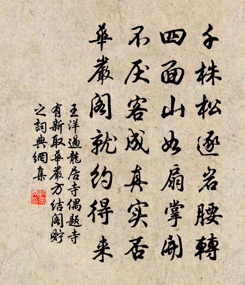 詩詞名句歷史字典書法欣賞書法字典國語詞典說文解字康熙字典古漢語字典標 題 作 者 詩 句 過龍居寺偶題寺有新取華嚴方結閣貯之作者:王洋 朝代:宋代原文千株松逐岩腰轉,四面山如扇掌開。不厭客成真實否,華嚴閣就約得來。詩詞問答問:《過龍居寺偶題寺有新取華嚴方結閣貯之》的作者是誰?答:王洋問:該詩寫於哪個朝代?答:宋代書法欣賞過龍居寺偶題寺有新取華嚴方結閣貯之書法作品詩詞推薦病起荊江亭即事十首黃庭堅〔宋代〕文章韓杜無遺恨,草詔陸贄傾諸公。玉堂端要真學士,須得儋州禿鬢翁。建隆郊祀八首竇儼〔宋代〕謂天蓋高,其聽孔委。聞樂歆德,介以福禧。出遊郊外七絕王炎〔宋代〕孤煙近見數椽屋,急水時行獨木橋。入眼異鄉風景別,修眉一抹暮山遙。夢回趙汝鐩〔宋代〕春意已深寒未了,夢回斗帳房櫳悄。五更五點殘月銷,山鳥一聲先破曉。發丈亭陸游〔宋代〕玄雲垂天暗如漆,櫓聲嘔軋知船行。南風忽起捲雲去,江月已作金盆傾。花石詩十一章鄧肅〔宋代〕守令講求爭效忠,誓將花石掃地空。那知臣子力可盡,報上之德要難窮。送侍御帥夔府喻良能〔宋代〕西風動行色,詩景繞征鞍。赤甲懸危壁,黃牛瀉急湍。猿聲雲背落,山勢馬頭盤。天險須人守,毋辭蜀道難。行香子張翥〔元代〕水遠天低。雪意垂垂。火爐頭、煨芋燃萁。 * 穩坐,紙帳低圍。且放些慵,補些拙,學些痴。休惹群兒。唱起銅答客宋祁〔宋代〕承明年老厭文書,尺奏朝通暮剖符。數領近藩君莫笑,猶勝長被鬼揶揄。同孝叔游蕭灑亭張伯玉〔宋代〕昔日賢侯多興詠,為鄰蕭灑復潺湲。一橋飛處橫牛渚,二水泉來見浙源。雨漲瀑泉添岳面,晚晴春草帶潮痕。好風宰餘姚道詠上虞山水二首趙子潚〔宋代〕重華遺澤在東州,景物留奇聚勝游。翠濕金罍山獨秀,碧環玉帶水交流。史館陳太丞知壽州楊億〔宋代〕忽佩魚符下玉京,長安廄吏駕車迎。淮王舊地餘風物,太史新書見姓名。弩矢前驅殊覺貴,河梁執別豈勝情。小山相和歌辭婕妤怨劉方平〔唐代〕夕殿別君王,宮深月似霜。人幽在長信,螢出向昭陽。露浥紅蘭濕,秋凋碧樹傷。惟當合歡扇,從此篋中藏。小飲公瑾舟中蘇軾〔宋代〕青泥赤日午相烘,走訪船窗柳影中。輟我東坡無限睡,賞君南浦不貲風。坐觀邸報談迂叟,閒說滁山憶醉翁。此去紹興二十八年祀圜丘學士院〔宋代〕至哉坤厚,隤然止靜。柔載動植,資始成性。玉光幣色,璨若其映。式恭神祀,有邦之慶。秋夜將曉出籬門迎涼有感陸游〔宋代〕三萬里河東入海,五千仞岳上摩天。遺民淚盡胡塵里,南望王師又一年!漁隱為周仲明賦黃庚〔宋代〕一笠戴春雨,扁舟寄此情。世間塵網密,江上釣絲輕,不羨魚暇利,惟尋鷗鷺盟。狂奴台下水,猶作漢時清。句無機老農〔宋代〕名利有危機,老於農圃宜。竹里梅劉言史〔唐代〕竹里梅花相併枝,梅花正發竹枝垂。風吹總向竹枝上,直似王家雪下時。城頭曉步二首楊萬里〔宋代〕城東行遍卻城西,欲問梅花乞一枝,雪糝久團霜後朵,嗔人頻看故開遲。名句推薦願得一心人,白頭不相離。卓文君《白頭吟》 一葉度春風,芳芳自相接。蕭衍《芳樹》 女兒年幾十五六,窈窕無雙顏如玉。蕭衍《東飛伯勞歌》 春水滿四澤,夏雲多奇峰。陶淵明《四時》 驕奢淫逸,所自邪也。左丘明《左傳·隱公·隱公三年》 聖人之為國也,觀俗立法則治,察國事本則宜。商鞅《商君書·算地》 桃花落,閒池閣。山盟雖在,錦書難托。陸游《釵頭鳳·紅酥手》 事不三思終有悔,人能百忍自無憂。馮夢龍《醒世恆言·卷三十四》 人歸落雁後,思發在花前。薛道衡《人日思歸》 雨暗殘燈棋散後,酒醒孤枕雁來初。杜牧《齊安郡晚秋》
