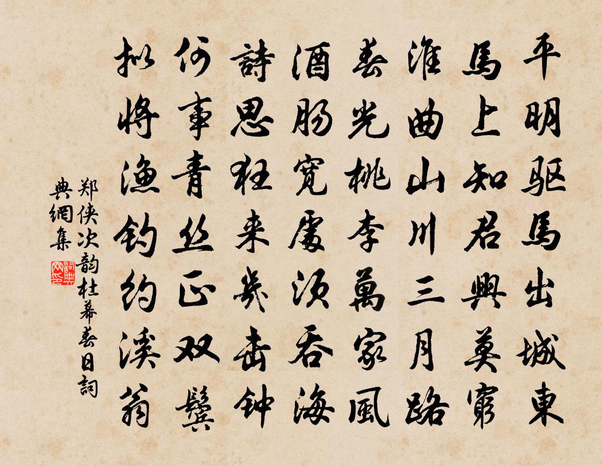 詩詞名句歷史字典書法欣賞書法字典國語詞典說文解字康熙字典古漢語字典標 題 作 者 詩 句 次韻杜幕春日作者:鄭俠 朝代:宋代次韻杜幕春日原文平明驅馬出城東,馬上知君興莫窮。淮曲山川三月路,春光桃李萬家風。酒腸寬處須吞海,詩思狂來幾擊鐘。何事青絲正雙鬢,擬將漁釣約溪翁。詩詞問答問:次韻杜幕春日的作者是誰?答:鄭俠問:次韻杜幕春日寫於哪個朝代?答:宋代鄭俠次韻杜幕春日書法欣賞次韻杜幕春日書法作品詩詞推薦和仲固春日村居即事十二絕胡寅〔宋代〕似聞寂寂帶經鋤,老圃何知莫問渠。況是漢陰機事息,豈憂芳草翳嘉蔬。山齋早起鄧深〔宋代〕推枕凌晨起,添衣奈冷何。新霜浮瓦薄,缺月掛檐多。野燒猶殘焰,鄰雞尚凍歌。撥灰添宿火,一快爇松柯。和錢處和扇車曹勛〔宋代〕君家世德胄,富貴出謙受。泠然禦寇車,為君駐戶牖。初訝鼓清薰,與客破宿酒。又疑建溪風,碾聲出兩肘。細視念奴嬌(再和)劉克莊〔宋代〕夢中忘卻,已閒退、諫草猶藏懷袖。文不會、鋪張粉飾,武又安能戰守。禿似葫蘆,辣於薑桂,衰颯同蒲柳。沒安題齋壁陸游〔宋代〕二十餘年此結茆,園公溪父日論交。風翻半浦亂荷背,雨放一林新筍梢。隔葉晚鶯啼谷口,唼花雛鴨聚塘坳。出門賢者之孝二百四十首元凱林同〔宋代〕當知元與凱,不出孝而忠。能舉十六相,斯為舜大功。減字木蘭花朱敦儒〔宋代〕斫魚作鮓。酒面打開香可醡。相喚同來。草草杯盤飲幾杯。人生虛假。昨日梅花今日謝。不醉何為。從古英雄總是大漠行佚名〔唐代〕單于犯薊壖,虜騎略蕭邊。南山木葉飛下地,北海蓬根亂上天。科斗連營太原道,魚麗合陣武威川。三軍遙倚伏,雲溪雜詠郭印〔宋代〕小橋藏曲折,幽徑一溪分。旭日篩金影,春流展縠文。周遭無限玉,參錯幾重雲。覿面融真意,相知只此君。頌古九十八首釋印肅〔宋代〕古人投子續宗枝,相逢作者便呈機。含光知有庵中主,提起油瓶應不疑。三月二十五日喜雨梅堯臣〔宋代〕初為委吏承命書,是夜旱雨深一尺。乃知窮困同草萊,隔歲焦枝有時滌。向聞乖龍池底藏,驅逐肯行須霹靂。今無和微之詩二十三首。和晨霞(此後在上都作)白居易〔唐代〕君歌仙氏真,我歌慈氏真。慈氏發真念,念此閻浮人。左命大迦葉,右召桓提因。千萬化菩薩,百億諸鬼神。上自贈歐陽建曹攄〔魏晉〕嗟我良友。惟彥之選。弱冠參戎。既立南面。或踴而升。蔚煥其變。豈徒虛聲。考績畿甸。約政理繁。事省功辯。春雪李建勛〔唐代〕隨風竟日勢漫漫,特地繁於故歲看。幽榭凍黏花屋重,短檐斜濕燕巢寒。閒聽不寐詩魂爽,淨吃無厭酒肺乾。莫道送張觀歸袁州李嘉祐〔唐代〕羨爾湘東去,煙花尚可親。綠芳深映鳥,遠岫遞迎人。飢狖啼初日,殘鶯惜暮春。遙憐謝客興,佳句又應新。郡圃觀白蓮王同祖〔宋代〕翠蓋亭亭映玉裳,臨風{棹左換彳}彴暗飄香。六郎正被繁華困,不愛濃妝愛淡妝。閒眠白居易〔唐代〕暖床斜臥日曛腰,一覺閒眠百病銷。盡日一飧茶兩碗,更無所要到明朝。秋雨歡虞儔〔宋代〕少昊欲行秋,驕陽猶跋扈。炎蒸不易滌,頗費天人雨。浸淫三日霖,雲氣政旁午。所慮早禾傷,佳實臥場圃。翻思僧正倚大師庵居曾鞏〔宋代〕蘭裓方袍振錫回,結茅蕭寺遠塵埃。五峰日破朝雲出,三谷花浮澗水來。風散異香禪榻靜,鳥窺清唄法筵開。因過游小圃宋祁〔宋代〕初陽未爇樹陰輕,中圃留連底有情。春草抽心終不死,夏禽反舌已無聲。轆轤半上畦泉逗,襫襏初休隴雨晴。紫蓼名句推薦天下大勢,分久必合,合久必分。羅貫中《三國演義·第一回》 南浦淒淒別,西風裊裊秋。白居易《南浦別》 牆外行人,牆裡佳人笑。蘇軾《蝶戀花·春景》 轅門菊酒生豪興,雁塞風雲愜壯遊。王瓊《九日登花馬池城》 想雁空、北落冬深,澹墨晚天雲闊。吳文英《暗香疏影·夾鍾宮賦墨梅》 騮馬新跨白玉鞍,戰罷沙場月色寒。王昌齡《出塞二首》 啼鶯舞燕,小橋流水飛紅。白樸《天淨沙·春》 強龍不壓地頭蛇。吳承恩《西遊記·第四十五回》 剛待不思量,吹一片、簫聲過牆。項鴻祚《太常引·客中聞歌》 遊子乍聞征袖濕,佳人才唱翠眉低。鄭谷《鷓鴣》