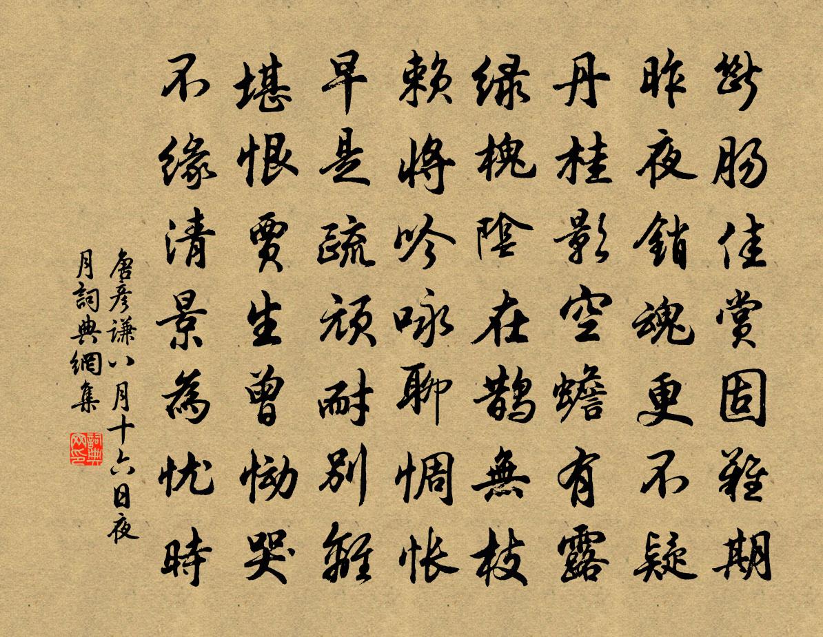 詩詞名句歷史字典書法欣賞書法字典國語詞典說文解字康熙字典古漢語字典標 題 作 者 詩 句 八月十六日夜月作者:唐彥謙 朝代:唐代八月十六日夜月原文斷腸佳賞固難期,昨夜銷魂更不疑。丹桂影空蟾有露,綠槐陰在鵲無枝。賴將吟詠聊惆悵,早是疏頑耐別離。堪恨賈生曾慟哭,不緣清景為憂時。詩詞問答問:八月十六日夜月的作者是誰?答:唐彥謙問:八月十六日夜月寫於哪個朝代?答:唐代問:八月十六日夜月是什麼體裁?答:七律唐彥謙八月十六日夜月書法欣賞八月十六日夜月書法作品注釋全唐詩:卷672-63詩詞推薦題烏程簿廳浮玉亭七首袁說友〔宋代〕一日溪流萬櫓聲,簿書叢里眼偏明。青衫不怕籠朱墨,直下滄浪便濯纓。水龍吟楊無咎〔宋代〕夜來六出飛花,又催寂寞袁門閉。幽齋無寐,寒欺衾布,明吞窗紙。起步閒庭,月華交映,長空如水。便乘風欲去竹湖李內翰哀詩二首劉克莊〔宋代〕鰲頂綸言古,蠅頭諫草忠。予環猶昨日,賜扇忽秋風。貌肅深衣叟,官同禿鬢翁。百年會有別,不料許匆匆。春日郊行釋紹嵩〔宋代〕高竹重林接翠微,夕陽分手柘岡西。莫憂世事兼身事,且逐東風進杖藜。和顏長官百詠農桑朱繼芳〔宋代〕編茅為屋荻為簾,老小團欒苦樂兼。樂歲輸丁猶未了,飢年家口更堪添。郊廟朝會歌辭建隆乾德朝會樂章二十八首佚名〔宋代〕盛德好生,網開三面。明視標奇,昌奇乃見。育質雪園,淪精月殿。著于樂章,色含江練。送齊學士公知荊南司馬光〔宋代〕漢家太守治才高,楚國山種氣象豪。旗旆逶迤蟠夢澤,樓船贔屭壓江濤。雄名誰復知宣武,遺愛猶應禮叔敖。何必送舍弟頻赴齊州三首杜甫〔唐代〕岷嶺南蠻北,徐關東海西。此行何日到,送汝萬行啼。絕域惟高枕,清風獨杖藜。危時暫相見,衰白意都迷。風塵溪上翁劉黻〔宋代〕問年知近百,傴僂合龜形,不理兒孫事,惟占水旱星。慣醫閒施草,貰酒自攜瓶。勸世行方便,何消念佛經。悼離贈妹詩二首 一左思〔魏晉〕鬱郁岱青。海瀆所經。 * 神靈。為祥為禎。峨峨令妹。應期挺生。如蘭之秀。如芝之榮。總角岐嶷。齠齔夙成。秋夜苦吟杜荀鶴〔唐代〕吟盡三更未著題,竹風松雨花淒淒。此時若有人來聽,始覺巴猿不解啼。寄秋江許端甫顧逢〔宋代〕妙年親雅道,諸老日從游。師法林和靖,家聲許郢州。江湖千里志,風月一襟秋。好句人傳志,詩名不待求。后土廟陳允平〔宋代〕塵擁妝檯翡翠翹,瓊花開盡玉魂銷。崑崙山上天風落,二十四橋吹洞簫。送馮尊師王禹偁〔宋代〕前日訪潘閬,下馬入窮巷。忽見雙筍石,臥向青苔上。雲是馮尊師,秋來留在茲。今說東南行,問我堅乞詩。又見僑居一首蘇籀〔宋代〕匆匆五十化,已往固莫及。祠官閴中隱,歉歲屍糝粒。毀方非瓦合,知白無伊鬱。世悅鄒駱駝,我賢揚執戟。浮雲北榭蘇籀〔宋代〕坐消床刃肘生胝,寓目危亭汗漫期。奄靄煙嵐客愁絕,高明茨葦屋雲誰。治城廛肆吁吾有,近市塵囂懶汝移。金剎清思堂曉雪初霽望飛來山張伯玉〔宋代〕密雪曉初霽,朝陽靄融融。隱几高堂上,坐對飛來峰。梵塔倚天半,樓台出煙中。岧然金銀闕,瑰碧交玲瓏。漸轉讀去非有行集趙蕃〔宋代〕山嵯峨,江洶湧,舟疾如飛得無恐。忽來何處有竹編,勢與江山欲爭勇。回思往日曾倡酬,我詩島嶼縈微流。鶴鳧八聲甘州何夢桂〔宋代〕對千峰未曉,聽西風、吹角下譙樓。擁貔貅千騎,旌十里,送客芳洲。曾是燈棋月柝,贊畫坐清油。折盡長亭柳水龍吟(前題)王沂孫〔宋代〕翠雲遙擁環妃,夜深按徹霓裳舞。鉛華淨洗,涓涓出浴,盈盈解語。太液荒寒,海山依約,斷魂何許。甚人間、別名句推薦泉眼無聲惜細流,樹陰照水愛晴柔楊萬里《小池》 窣地春袍,嫩色宜相照。梅堯臣《蘇幕遮·草》 君馬黃,我馬白。李白《君馬黃》 持斧伐遠揚,荷鋤覘泉脈。王維《春中田園作》 至若救渴,飲之以漿;蠲憂忿,飲之以酒;盪昏寐,飲之以茶。陸羽《茶經·六之飲》 河西幕中多故人,故人別來三五春。岑參《涼州館中與諸判官夜集》 愚而好自用,賤而好自專。生乎今之世,反古之道。如此者災及其身者也。子思《中庸·第二十八章》 蔡女菱歌移錦纜,燕姬春望上瓊鉤。上官儀《詠畫障》 故不登高山,不知天之高也;不臨深溪,不知地之厚也;荀子《勸學》 美不美,鄉中水;親不親,故鄉人。佚名《增廣賢文·上集》