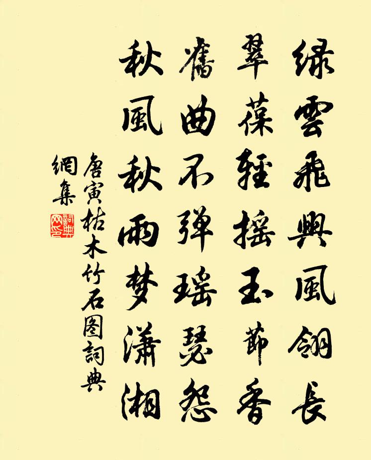 詩詞名句歷史字典書法欣賞書法字典國語詞典說文解字康熙字典古漢語字典標 題 作 者 詩 句 枯木竹石圖作者:唐寅 朝代:明代枯木竹石圖原文綠雲飛興風翎長,翠葆輕搖玉節香。舊曲不彈瑤瑟怨,秋風秋雨夢瀟湘。詩詞問答問:枯木竹石圖的作者是誰?答:唐寅問:枯木竹石圖寫於哪個朝代?答:明代問:唐寅的名句有哪些?答:唐寅名句大全唐寅枯木竹石圖書法欣賞枯木竹石圖書法作品詩詞推薦郊廟歌辭。梁太廟樂舞辭。登歌佚名〔唐代〕於赫我皇,建中立極。動以武功,靜以文德。昭事上帝,歡心萬國。大報嚴禋,四海述職。冬夜不寐朱淑真〔宋代〕推枕鴛幃不耐寒,起來霜月轉欄乾。悶懷脈脈與誰說,淚滴羅衣不忍看。貧居即事陸游〔宋代〕地偏人罕到,秋晚日猶長。病去筇枝贅,家貧菜粥香。流泉通藥壟,積雨潤書囊。欲譜幽居事,疏慵久未遑。次陸放翁韻蘇泂〔宋代〕登高望遠不可無,不可一日不讀書。予方自委下濕地,君乃獨占高明居。楊雲儻許客載酒,杜陵安得錢買驢。徐行歷陽十詠之七采石磯賀鑄〔宋代〕東西采石磯,山水兩清絕。漁舠與商舶,今古幾沿越。飄颻翰林主,長笑弄明月。難訪物外游,飛雲眇天末。賀運使學士分散傜人余靖〔宋代〕狂傜數載擾湘東,多謝招降息戰攻。千里山川還漢界,萬人戈甲卷秋風。牛羊野放狼心伏,鷹犬閒眠兔穴空。不獨雜興宋祁〔宋代〕殘暑辭遙夕,初涼澹蕭辰。燕索西飛伴,雁作南來賓。霽巒靜矗矗,遠水清鱗鱗。由來搖落恨,先付長年人。冬夜書懷王維〔唐代〕冬宵寒且永。夜漏宮中發。草白靄繁霜。木衰澄清月。麗服映頹顏。朱燈照華發。漢家方尚少。顧影慚朝謁。重陽領客以老杜舊日重陽日詩分韻凡賓主十八魏了翁〔宋代〕天根斂秋陽,雨畢水歸藪。胡為爽常度,白晝變昏黝。農功將納場,余秉尚棲畝。昨朝告方社,捲去日中蔀。羲和鄰女劉駕〔唐代〕君嫌鄰女丑,取婦他鄉縣。料嫁與君人,亦為鄰所賤。菖蒲花可貴,只為人難見。楊柳塘寄徐照趙師秀〔宋代〕因貧為遠別,已是十三程。盡日行山色,逢人問地名。近書無便寄,新句與誰評。想爾寒宵雨,思予亦夢成。謝阮評事蔡襄〔宋代〕手授新書荷至情,何時仙訣得真精。高年轉覺面顏少,細字全由眼力明。藥籙謾勞分上下,丹爐終費修虧盈。爭如挽東萊先生孟行古〔宋代〕道學方勤績,亨途漸致身。蒼天傾我淚,今日喪斯人。弟子群經富,先生一語真。發揮餘事業,何處不書紳。奉使淮南李涉〔唐代〕漢使徵兵詔未休,兩行旌旆接揚州。試上高樓望春色,一年風景盡堪愁。聽彈沈湘雍裕之〔唐代〕賈誼投文吊屈平,瑤琴能寫此時情。秋風一奏沈湘曲,流水千年作恨聲。莫愁村張適正〔宋代〕紛紛花雨暗江頭,隔岸煙村喚莫愁。艇子只今誰是主,方知身世是虛舟。皇后閣端午帖子夏竦〔宋代〕中閏正肅鳴環節,吉日爰逢采術時。億載繁禧同聖壽,百男鴻慶茂仙枝。句張釜〔宋代〕西湖天下勝。桂水五千里四首楊維楨〔元代〕桂水五千里,春來波浪深。地消青青瘴,花髮乳蕉林。桂水五千里,瀟湘雨氣空。衡山七十二,望見女英峰。桂水七夕曝衣篇沈佺期〔唐代〕君不見昔日宜春太液邊,披香畫閣與天連。燈火灼爍九微映,香氣氛氳百和然。此夜星繁河正白,人傳織女牽牛客名句推薦江東子弟多才俊,捲土重來未可知。杜牧《題烏江亭》 日暮秋煙起,蕭蕭楓樹林。戴叔倫《過三閭廟》 念寒蛩殘夢,歸鴻心事,那聽江村夜笛。吳文英《瑞鶴仙·秋感》 氣軟來風易,枝繁度鳥遲。李爽《芳樹》 來時父母知隔生,重著衣裳如送死。王建《渡遼水》 香霧雲鬟濕,清輝玉臂寒。杜甫《月夜》 野竹分青靄,飛泉掛碧峰。李白《訪戴天山道士不遇》 驪山四顧,阿房一炬,當時奢侈今何處?張養浩《山坡羊·驪山懷古》 愔愔坊陌人家,定巢燕子,歸來舊處。周邦彥《瑞龍吟·大石春景》 龜言此地之寒,鶴訝今年之雪。庾信《小園賦》