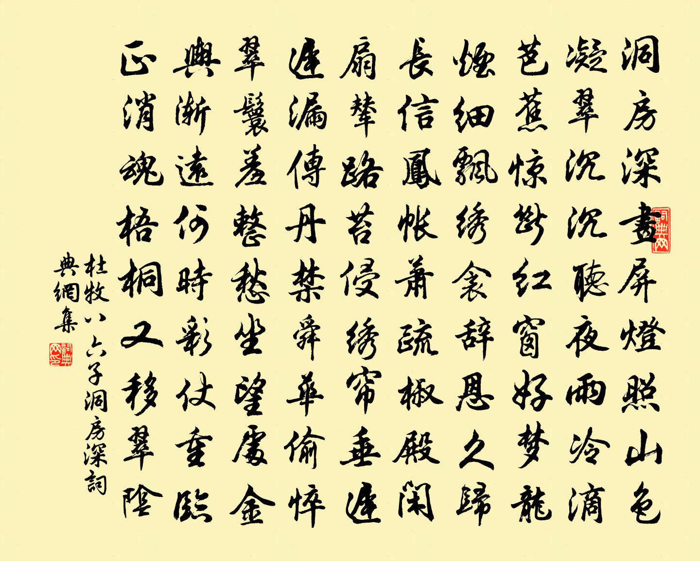 “洞房深,畫屏燈照,山色凝翠沉沉。”起拍三句,寫居室所在庭院深深,室內陳設華麗、氣氛淒清。“燈照”,點明此處所寫為夜間景況;畫屏,指屏風,在燈光映照之下,上面所畫山水色調顯得凝重沉著。“深”、“凝”、“沉沉”四字,渲染了夜中女主人公居室氛圍的典雅凝重的特徵。