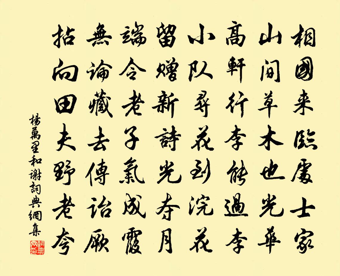 詩詞名句歷史字典書法欣賞書法字典國語詞典說文解字康熙字典古漢語字典標 題 作 者 詩 句 和謝作者:楊萬里 朝代:宋代和謝原文相國來臨處士家,山間草木也光華。高軒行李能過李,小隊尋花到浣花。留贈新詩光奪月,端令老子氣成霞。無論藏去傳詒厥,拈向田夫野老夸。詩詞問答問:和謝的作者是誰?答:楊萬里問:和謝寫於哪個朝代?答:宋代問:楊萬里的名句有哪些?答:楊萬里名句大全楊萬里和謝書法欣賞和謝書法作品詩詞推薦水龍吟(牡丹)王沂孫〔宋代〕曉寒慵揭珠簾,牡丹院落花開未。玉欄乾畔,柳絲一把,和風半倚。國色微酣,天香乍染,扶春不起。自真妃舞罷次韻宋才夫李流謙〔宋代〕麒麟丹青了無夢,香火因緣已成癖。一堂風冷自分明,誰撮虛空強摹畫。蔬食眠烹均一茹,笑取菅麻視繒帛。風幡次韻朋元游王氏園范成大〔宋代〕聯翩步屧翠微間,回首紅塵自鮮歡。捲地雨添千澗急,擁門雲鎖兩山盤。絕憐茶筍能留客,仍喜蛙聲不在官。雪白流年韓偓〔唐代〕三月傷心仍晦日,一春多病更陰天。雄豪亦有流年恨,況是離魂易黯然。送玲首座住定水釋鹹傑〔宋代〕一棒一條痕,一摑一掌血。不是向上機關,亦非單傳妙訣。佛祖見之攢眉,魔外聞之膽折。建立此綱宗,當陽貴直謝朱宰賦南園二十韻陳宓〔宋代〕先君昔歸老,手自植六梅。結亭在人境,尺地陽春回。豈無林塘勝,可以榭與台。自雲飽世味,一室足歡咍。朝詩高陽台(送王歷陽以右曹赴闕)吳文英〔宋代〕淝水秋寒,淮堤柳色,別來幾換年光。紫馬行遲,才生夢草池塘。便乘丹鳳天邊去,禁漏催、春殿稱觴。過松江,瑞鶴仙趙聞禮〔宋代〕凍痕消夢草。又招得春歸,舊家池沼。園扉掩寒悄。倩誰將花信,偏傳深窈。追游趁早,便裁卻、春衫短帽。任殘寄別子云韓元吉〔宋代〕江乾風雪敝貂裘,兄弟相看已白頭。兩月追隨無十日,一春離別甚三秋。清時官職難頻竊,異縣田園合早求。並戲敬酬陳掾親家翁秋夜有贈儲光羲〔唐代〕大姬配胡公,位乃三恪賓。盛德百代祀,斯言良不泯。敬仲為齊卿,當國名益震。仲舉登宰輔,太丘榮縉紳。武皇立春和孫子紹二首王之道〔宋代〕老窮推不去,湖海又逢春。懶復論三甲,空驚薦五辛。柳梢寒已動,萱草暖還新。我亦寰中物,因君試問津。夕眺風泉亭三首白玉蟾〔宋代〕拄杖相尋訪夕陽,詩肩獨聳到昏黃。白苹洲上西風起,黃葉聲中秋意長。君異鄭兄出示舊詩蓋紹定初所信筆也挽仰三十吳潛〔宋代〕彈指江湖三十年,淋漓舊墨尚依然。人生未必堅如紙,心事淒涼雪滿顛。寧考神御奉安原廟王遂〔宋代〕太室裸將嚴體薦,景靈朝獻薦牙盤。九重黼坐盤盂固,四海蒼生奠枕安。寄蘄簟與蒲傳正蘇軾〔宋代〕蘭溪美箭不成笛,離離玉筋排霜脊。千溝萬縷自生風,入手未開先慘忄栗。公家列屋閒蛾眉,珠簾不動花陰移。霧霽雪 / 韓舍人書窗殘雪戎昱〔唐代〕風卷寒雲暮雪晴,江煙洗盡柳條輕。檐前數片無人掃,又得書窗一夜明。和高吉父六絕杜范〔宋代〕平生羽懶怕逢迎,相望何時可合併。妙語貫珠分在手,山齋快讀晚風輕。東歸羅鄴〔唐代〕日日唯憂行役遲,東歸可是有家歸。都緣桂玉無門住,不算山川去路危。秦樹夢愁黃鳥囀,吳江釣憶錦鱗肥。桃夭芡陶弼〔宋代〕三伏池塘沸,難頭美可烹。香囊聯錦破,玉指剝珠明。葉皺非蓮蓋,根甘似竹萌。不應從適口,炎帝亦曾名。和樞密晏太尉元日雪宋祁〔宋代〕寒雲萬里送殘宵,面旋祥霙集歲朝。繁影未能藏夜燎,薄花仍欲伴春椒。光含象闕蒼龍舞,氣勒交衢卓馬驕。豐兆名句推薦高田如樓梯,平田如棋局。楊慎《出郊》 神女生涯原是夢,小姑居處本無郎。李商隱《無題·重幃深下莫愁堂》 欲往從之雪雰雰,側身北望涕沾巾。張衡《四愁詩》 人不可貌相,海水不可斗量。馮夢龍《醒世恆言·卷三》 我與我周旋久,寧作我。劉義慶《世說新語·品藻》 只應守寂寞,還掩故園扉。孟浩然《留別王侍御維 / 留別王維》 雪似梅花,梅花似雪。呂本中《踏莎行·雪似梅花》 春晚綠野秀,岩高白雲屯。謝靈運《入彭蠡湖口》 此地朝來餞行者,翻向此中牧征馬。孟浩然《高陽池送朱二》 鄉心新歲切,天畔獨潸然。劉長卿《新年作》