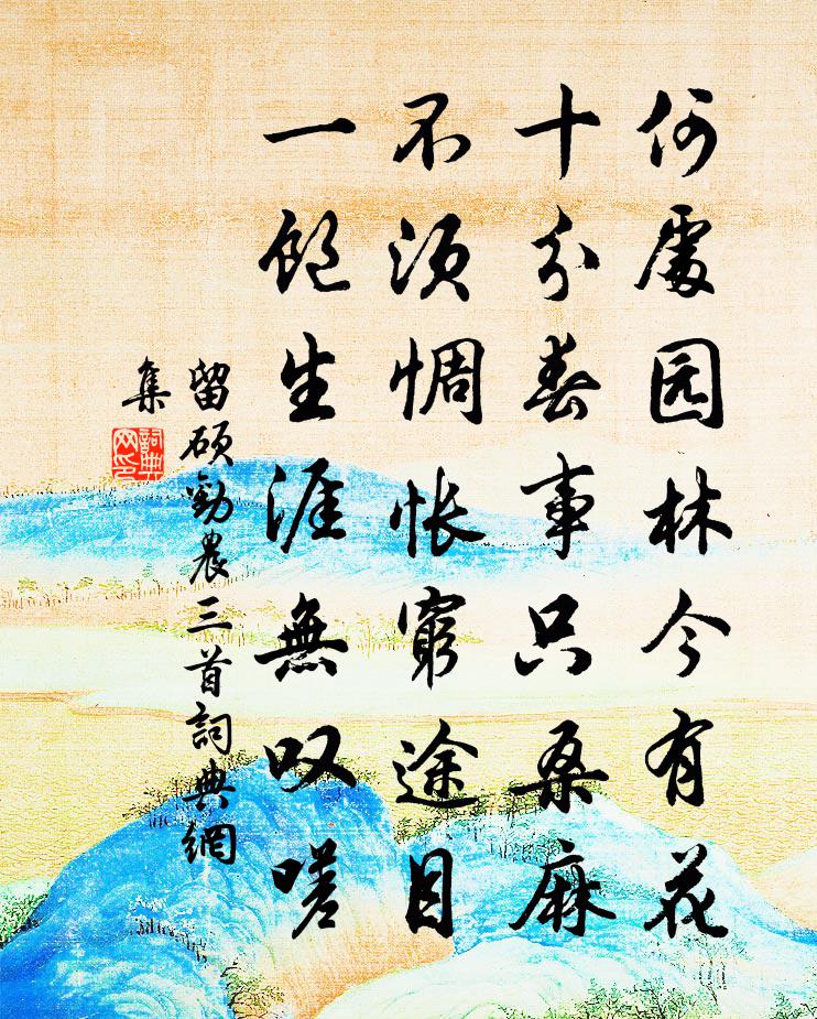 詩詞名句歷史字典書法欣賞書法字典國語詞典說文解字康熙字典古漢語字典標 題 作 者 詩 句 勸農三首作者:留碩 朝代:宋代勸農三首原文何處園林今有花,十分春事只桑麻。不須惆悵窮途目,一飽生涯無嘆嗟。詩詞問答問:勸農三首的作者是誰?答:留碩問:勸農三首寫於哪個朝代?答:宋代留碩勸農三首書法欣賞勸農三首書法作品詩詞推薦游廬山張元乾〔宋代〕古木寒藤挽我住,身非靖節誰能留。多慚不及鸞溪水,長向山前山後流。和顏長官百詠邊庭朱繼芳〔宋代〕虜退邊方得暫寧,棗兒紅近莫休兵。漢家錯信和親議,不見胡雛與父爭。題劉潛夫詩什並以將行葉適〔宋代〕寄來南嶽第三藁,穿尺遺珠簇盡花。幾度驚教祝融泣,一齊傳與尉佗夸。龍鳴自滿空中韻,鳳咮都無巧後哇。庾信南軒陳師道〔宋代〕少日書林頗著勛,暮年貪佛替論文。銅爐瓦枕芒鞋裡,此外惟須對此君。紅窗迥王哲〔元代〕這王三,風得賽。便咄了氣財,色游三昧。因何卻不斷香醪,我神仙也愛。獨自行來真自在。要到處掩然,悉除百題方士繇伯謨五丈所居三首趙蕃〔宋代〕遠庵庵榜晦庵書,不獨人高字亦如。隴畝縱令非我有,溪山政自要君居。柳湖感物蘇轍〔宋代〕柳湖萬柳作雲屯,種時亂插不鬚根。根如臥蛇身合抱,仰視不見蜩蟬喧。開花三月亂飛雪,過牆度水無復還。窮高次韻司封使君新歲喜雪朱長文〔唐代〕玉燭均調應改元,賢侯喜雪望堯天。暗聲撒竹高齊夜,瑞彩連支畫戟前。千里湖山成洞府,萬家觴詠展賓筵。應鄰詩品二十四則。疏野司空圖〔唐代〕惟性所宅,真取弗羈。拾物自富,與率為期。築屋松下,脫帽看詩。但知旦暮,不辨何時。倘然適意,豈必有為。潺潺閣婁乾曜〔宋代〕一派泠泠繞檻清,塵襟洗滌自涼生。夜深好夢才驚破,疑是半天風雨聲。聞葉初秀才東歸林逋〔宋代〕高鴻多北向,極目雨余天。春滿吳山樹,人登汴水船。吟生千里月,醉盡一囊錢。肯便懷鄉邑,時清復少年。臨江仙·金鎖重門荒苑靜鹿虔扆〔唐代〕金鎖重門荒苑靜,綺窗愁對秋空。翠華一去寂無蹤,玉樓歌吹,聲斷已隨風。煙月不知人事改,夜闌還照深宮。藕哭張文翁同舍趙文〔宋代〕豈意渴相如,俄為化子輿。平生一杯酒,活計百篇書。同舍遂欲盡,吾生不願餘。如今念夫子,痛飲未全疏。扶上夢范參政陸游〔宋代〕夢中不知何歲月,長亭慘澹天飛雪。酒肉如山鼓吹喧,車馬結束有行色。我起持公不得語,但道不料今遽別。平生今日何夕曾豐〔宋代〕今夕何夕,粲者如許。其月蕤賓,其日甲午。午與火俱,火為午主。老臣在南,蓋得其侶。馬當山水府廟張鎡〔宋代〕江長九月秋氣豪,霜明岸老天愈高。群真下集水仙府,丁東佩玉聞雲璈。修塗隨處愜奇觀,況此樓殿臨煙皋。割牲虛名宋祁〔宋代〕身外虛名莫妄求,強關事事判悠悠。試看雲將三年役,止博鴻蒙一掉頭。醉中放言黎廷瑞〔宋代〕一器集百蚋,分寸爭營營。醉鄉有太古,長年樂昇平。尚不知揖讓,固應無戰爭。吾嘗涉其境,信美不可名。遺我次韻太守會宜休亭二首張嵲〔宋代〕萬竹鎖深翠,幽亭枕柳塘。共臨朱檻坐,搖借渚苹香。鳥喜樹陰密,魚游荷影涼。聊從山簡醉,疏逸興何長。次泉守游郎中陳宓〔宋代〕七閩遍數刺桐州,自昔賢侯惠愛留。洛水橋新渾似昨,梅溪人誦不能休。近來善政稱三最,相繼清名照九秋。我別名句推薦曾與美人橋上別,恨無訊息到今朝。劉禹錫《楊柳枝 / 柳枝詞》 燕子巢方就,盆池小,新荷蔽。杜安世《鶴沖天·清明天氣》 力分者弱,心疑者背。尉繚《尉繚子·攻權》 眺聽良多感,徙倚獨沾襟。李密《淮陽感秋》 秋風夜渡河,吹卻雁門桑。王昌齡《塞下曲·秋風夜渡河》 靡靡秋已夕,淒淒風露交。陶淵明《己酉歲九月九日》 惻隱之心,人皆有之孟子《孟子·告子章句上·第六節》 角聲吹徹小梅花。夜長人憶家。趙長卿《阮郎歸·客中見梅》 風雨淒淒,雞鳴喈喈。佚名《風雨》 道也者,不可須臾離也;可離,非道也。是故君子戒慎乎其所不睹,恐懼乎其所不聞。子思《中庸·第一章》