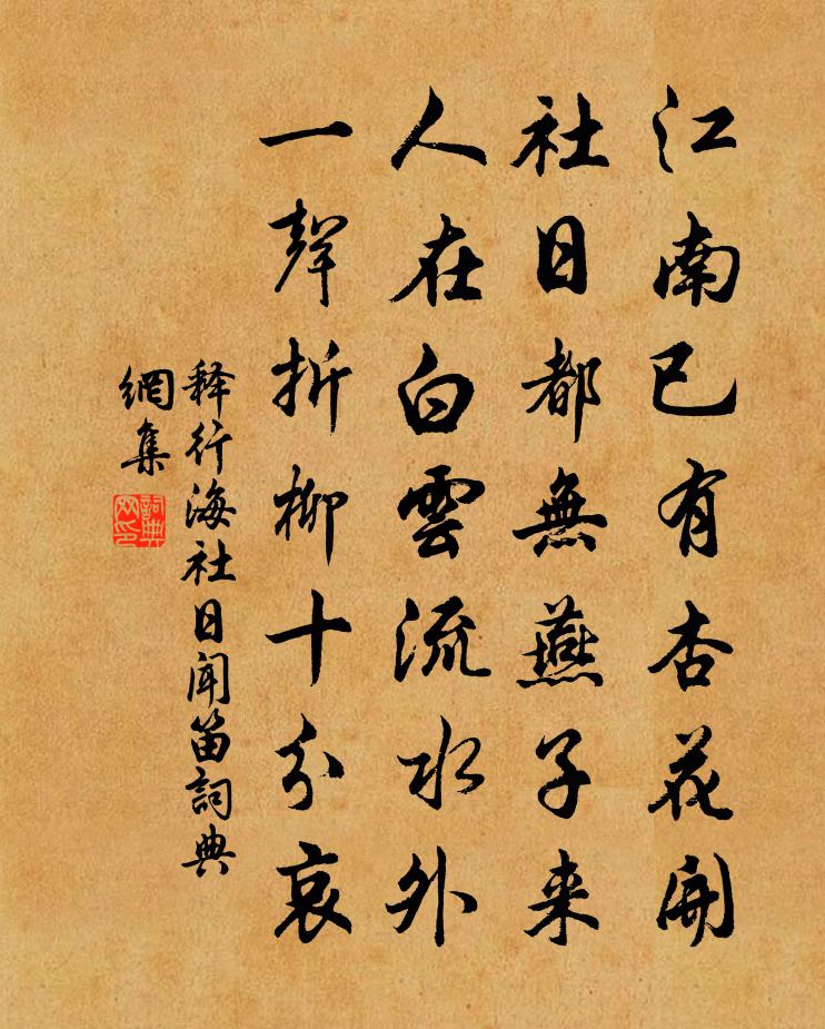 詩詞名句歷史字典書法欣賞書法字典國語詞典說文解字康熙字典古漢語字典標 題 作 者 詩 句 社日聞笛作者:釋行海 朝代:宋代社日聞笛原文江南已有杏花開,社日都無燕子來。人在白雲流水外,一聲折柳十分哀。詩詞問答問:社日聞笛的作者是誰?答:釋行海問:社日聞笛寫於哪個朝代?答:宋代釋行海社日聞笛書法欣賞社日聞笛書法作品詩詞推薦枯樹韓愈〔唐代〕老樹無枝葉,風霜不復侵。腹穿人可過,皮剝蟻還尋。寄託惟朝菌,依投絕暮禽。猶堪持改火,未肯但空心。詣順公問道耿湋〔唐代〕此身知是妄,遠遠詣支公。何法住持後,能逃生死中。秋苔經古徑,蘀葉滿疏叢。方便如開誘,南宗與北宗。句晃沖之〔宋代〕扁舟幾日為詩留。老景人懷一羽輕。叔子擬度驊騮前。宮詞張公庠〔宋代〕度臘深宮暖未回,半天金碧照樓台。百花須待東風發,只有寒梅傲雪開。【越調】憑闌人 贈吳國良倪瓚〔元代〕客有吳郎吹洞簫,明月沉江春霧曉。湘靈不可招,水雲中環佩搖。題隔師松齋張舜民〔宋代〕未解子荊流可枕,冷笑陶令琴無弦。臨流有耳安用洗,續弦得膠還自煎。不禁巢邊黃口鬧,不作竿上鮎魚緣。但欲櫻桃曲顧況〔唐代〕百舌猶來上苑花,遊人獨自憶京華。遙知寢廟嘗新後,敕賜櫻桃向幾家。經秦皇墓魯交〔宋代〕祖龍何事苦東巡,仙駕歸來冢草新。項籍已飛三月火,子嬰猶醉六宮春。元來滄海殊無藥,卻是芒碭暗有人。自古張文通以詩覓小桃走筆依韻和答強至〔宋代〕名園聞說洛陽春,金谷前無石季倫。第一牡丹應慣見,憐君翻作覓花人。臨江仙佚名〔宋代〕結夏駸尋逾六日,蓬壺紀瑞生辰。祥煙蔥鬱藹門庭。驂鸞雙女侍,毓鳳二雛新。暫爾勾稽淹大手,聲名已徹楓宸。題武陵草堂楊浚〔唐代〕草堂列仙樓,上在青山頂。戶外窺數峰,階前對雙井。雨來花盡濕,風度松初冷。登棧行不疲,入谿語彌靜。雲能涼州詞二首王翰〔唐代〕葡萄美酒夜光杯,欲飲琵琶馬上催。醉臥沙場君莫笑,古來征戰幾人回?秦中花鳥已應闌,塞外風沙猶自寒。夜聽觀丙辰省試宣鎖作胡仲弓〔宋代〕四海文章屬品題,老夫刮臘有金篦。諸君熟讀阿房賦,未必能為五色迷。踏莎行 雪晴縱步汪斌〔元代〕踏雪橋邊,訪梅溪曲。春風初破梢頭玉。村村茅屋晚炊煙,更尋村酒穿茅屋。兔月初眉,瑤峰眩目。**振屐鳴空五月二十八日書詩人壁黃宗羲〔清代〕不鉤簾幕晝沉沉,難向庸醫話病深。不識詩人容易病,一春花鳥總關心。謁東坡祠方回〔宋代〕至和嘉佑政途開,老鳳將雛出蜀來。父子聲名天宇小,弟兄筆陣海潮回。岷峨一氣鍾三傑,杜富諸賢得異材。二百【雙調】湘妃怨_武夷山中落張可久〔元代〕武夷山中落花流水出桃源,暖翠晴雲滿藥田。流金古像開香殿,步虛聲未遠,鶴飛來認得神仙。傍草漫山徑,幽花寄題安福鳳林橋王洋〔宋代〕二年廬陵城,不踏安成野。但聞古侯封,活壤富書社。剸煩或容容,書考乃下下。韓君令安成,政事飾儒雅。考實將抵家遇雨鄭會〔宋代〕遄車偏值雨連天,疲馬難支又上船。樹杪鴉兵催急棹,渡頭漁火鎖寒煙。論心知己期將近,念子慈親望久懸。自笑題壽樟亭曾幾〔宋代〕大屋連甍小容足,棟宇以來非一木。豫章不是十圍樗,受命於天何得獨。君莫厭老大蓬蒿間,應龍虹梁果非福。虛名句推薦碧雲無渡碧天沉,是湖心,是儂心。張惠言《江城子·填張春溪西湖竹枝詞》 足國之道:節用裕民,而善臧其餘。荀子《荀子·富國》 過江千尺浪,入竹萬竿斜。李嶠《風》 不仁而富,謂之不幸。牆隙而高,其崩必疾也。范曄《後漢書·列傳·方術列傳上》 又說今夕天津,西畔重歡遇。吳文英《荔枝香近·七夕》 醉舞梁園夜,行歌泗水春杜甫《寄李十二白二十韻》 命室攜童弱,良日登遠遊陶淵明《酬劉柴桑》 姑蘇城外寒山寺,夜半鐘聲到客船張繼《楓橋夜泊》 泥上偶然留指爪,鴻飛那復計東西。蘇軾《和子由澠池懷舊》 土花曾染湘娥黛,鉛淚難消。納蘭性德《採桑子·土花曾染湘娥黛》