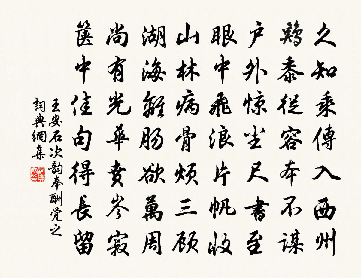 詩詞名句歷史字典書法欣賞書法字典國語詞典說文解字康熙字典古漢語字典標 題 作 者 詩 句 次韻奉酬覺之作者:王安石 朝代:宋代次韻奉酬覺之原文久知乘傳入西州,雞黍從容本不謀。戶外驚塵尺書至,眼中飛浪片帆收。山林病骨煩三顧,湖海離腸欲萬周。尚有光華賁岑寂,篋中佳句得長留。詩詞問答問:次韻奉酬覺之的作者是誰?答:王安石問:次韻奉酬覺之寫於哪個朝代?答:宋代問:王安石的名句有哪些?答:王安石名句大全王安石次韻奉酬覺之書法欣賞次韻奉酬覺之書法作品詩詞推薦寄上田僕射韓翃〔唐代〕家封薛縣異諸田,報主榮親義兩全。僕射臨戎謝安石,大夫持憲杜延年。金裝晝出羅千騎,玉案晨餐直萬錢。應念辛巳仲冬二日冬至孟冬晦日偶成釋文珦〔宋代〕天地一陰陽,推遷見短長。後朝方反覆,此月謾稱良。萍梗余浮跡,桑榆借晚光。有龜還懶卜,唯覺好支床。駸駸太常引 壽劉同知王惲〔元代〕太行晴色泛簾*。對書史,日優遊。賓從盡風流。誰健似、東陵故侯。人間萬事,塵埃野馬,一笑付紋楸。眉宇壽頌古三十一首釋安永〔宋代〕問處分明答處親,縱橫有路慣反身。相如奪得連城璧,秦主安然致太平。醉贈劉十二(一作寄嶺南張明府)殷堯藩〔唐代〕春草正淒淒,知君過惡溪。鶯將吉了語,猿共猓然啼。別路魂先斷,還家夢幾迷。定尋雷令劍,應識越王笄。樹色金蓮出玉花 寄任節級馬鈺〔元代〕任公節級。肯救危難常濟急。此去淳于。報得專專獻缽盂。山東馬鈺。詞寄賢家收養玉。玉里生金。無口能言話古滿庭芳·堠雪翻鴉納蘭性德〔清代〕堠雪翻鴉,河冰躍馬,驚風吹度龍堆。陰燐夜泣,此景總堪悲。待向中宵起舞,無人處、那有村雞。只應是,金笳謝彭大夫惠寒山詩三首曹勛〔宋代〕平生為物役,年紀積漸老。不省這個意,老得越顛倒。自讀二詩來,迷雲掃空照。我為謝彭翁,且喜無煩惱。醉題二首方回〔宋代〕賣花人憩小樓前,買幾枝看日典錢。詩向夢中頻□□,□才醉後便如仙。貧閒略比陶元亮,老壽將過白樂天。□□滿庭芳(茅舍)史浩〔宋代〕柴作疏籬,茅編小屋,繞堤苦竹黃蘆。老翁蝸處,卻自樂清虛。理釣何妨鉤直,據琴又、不管弦無。逍遙處,都捐上杭帥呂舍人王令〔宋代〕玉海澄中粹,金山拔外佳。無前誰與敵,獨進不容偕。列象明星璧,遺思結館娃。一麾迎日下,四海望霖乖。今見莫疑王安石〔宋代〕莫疑禪伯未知禪,莫笑仙翁不學仙。靈骨肯傳黃櫱燼,真心自放赤松煙。蓮華世界何關汝,楮葉工夫浪費年。露鶴上廣東運副馬少卿壽十口號曾豐〔宋代〕文星又轉作郎星,曉握蘭香上玉清。屹立太微東北角,是非時與上台爭。贈碧鑒相士蒲田林行可許月卿六〔宋代〕君如碧鑒照英雄,我鏡清寒印太空。請向文昌橋上看,碧天提出碧流中。句尹穡〔宋代〕本來饑飽非同鼎,安得浮沈自一舟。淮西司空圖〔唐代〕鰲冠三山安海浪,龍盤九鼎鎮皇都。莫夸十萬兵威盛,消個忠良效順無。和章質夫成都運司園亭詩翠錦亭吳師孟〔宋代〕東閣治台政,西堂備燕飲。介於二堂間,華構饒花品。紅紫鎮長春,四時如活錦。公暇一繩床,上有通中枕。題鄭所南蘭倪瓚〔元代〕秋風蘭蕙化為茅,南國淒涼氣已消。只有所南心不改,淚泉和墨寫《離騷》。 京口送朱晝之淮南(一作寄贈妓人)李涉〔唐代〕兩行客淚愁中落,萬樹山花雨後殘。君到揚州見桃葉,為傳風水渡江難。端嘉雜詩二十首劉克莊〔宋代〕少年意氣慕橫行,不覺蹉跎過一生。便脫深衣籠窄袖,去參留守看東京。名句推薦蚤是傷春夢雨天,可堪芳草更芊芊。韋莊《長安清明》 痴兒不知父子禮,叫怒索飯啼門東。杜甫《百憂集行》 落日暴風雨,歸路繞汀灣蘇舜欽《水調歌頭·滄浪亭》 衣不如新,人不如故。佚名《古艷歌》 那裡有鬧紅塵香車寶馬?祗不過送黃昏古木寒鴉。王磐《古蟾宮·元宵》 誰家玉笛暗飛聲,散入春風滿洛城。李白《春夜洛城聞笛 / 春夜洛陽城聞笛》 楚人悲屈原,千載意未歇。蘇軾《屈原塔》 樓頭客子杪秋後,日落君山元氣中。陳與義《登岳陽樓》 泥落畫梁空,夢想青春語。吳文英《生查子·秋社》 處富貴之地,要知貧賤的痛癢;當少壯之時,須念衰老的辛酸。洪應明《菜根譚·概論》