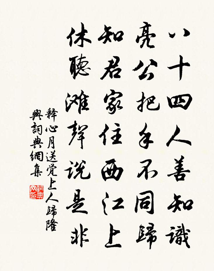詩詞名句歷史字典書法欣賞書法字典國語詞典說文解字康熙字典古漢語字典標 題 作 者 詩 句 送覺上人歸隆興作者:釋心月 朝代:宋代送覺上人歸隆興原文八十四人善知識,亮公把手不同歸。知君家住西江上,休聽灘聲說是非。詩詞問答問:送覺上人歸隆興的作者是誰?答:釋心月問:送覺上人歸隆興寫於哪個朝代?答:宋代釋心月送覺上人歸隆興書法欣賞送覺上人歸隆興書法作品詩詞推薦登黃樓有懷蘇眉山賀鑄〔宋代〕登黃樓,望黃州,黃州望不見,樓下水東流。水流何可留,浮雲更悠悠。傷心澤畔客,憔悴楚蘭秋。連日灌畦蒔菜廢作詩葛立方〔宋代〕莫問新來額插犀,了無魂夢到金閨。平頭上尾慵搜句,重後輕前且灌畦。正自無人嘗鼎臠,不如有客辦萍虀。庾郎王昭君盛世忠〔宋代〕漢使南歸絕信音,氈庭青草始知春。蛾眉卻解安邦國,羞殺麒麟閣上人。行路難曹勛〔宋代〕華堂高張千炬燭,光溢樽罍艷流目。秦姬趙女變新聲,入金石兮裂絲竹。少年意氣凌秋陽,奴僕金張嗤宋玉。文章李子西乙卯秋試畢攜家兄舊詩相過索次韻周必大〔宋代〕三日揮毫迥出群,貳師西伐有奇勳。便從蟾窟升金掌,休戀江東賦暮雲。送元積弟赴淮東總屬樓鑰〔宋代〕南徐來往飽經過,總餉賓寮入禮羅。子去幸陪鄒湛輩,君今還是伯休那。金閨通籍時方可,鐵瓮名城景最多。我有水調歌頭(七夕)姚述堯〔宋代〕三五半圓夜,二七素秋天。銀河耿耿,中渡絳節會星軿。寶鵲喜傳佳信,丹鳳歡迎仙仗,瑞彩映珠躔。此意天長久【正宮】醉太平_湖上洗荷花張可久〔元代〕湖上洗荷花過雨,浴明月平湖,暮雲樓觀景模糊。蘭舟棹舉,溯涼波似泛銀河去,對清風不放金杯住,上雕鞍誰記題扇二十四首曹勛〔宋代〕慣向青林與碧溪,幽居竹石自相宜。種成滿眼花堆錦,開落如今總不知。蘭陵王 王彥強以暮春有懷吳中故居之作見示邵亨貞〔元代〕錦江綠。長想秦城在目。瞿塘上、春水*船,十二遙峰翠如簇。羈懷未易觸。斜日平原散牧。潘郎愛,年少宦遊,蘄春聽琵琶五首孔武仲〔宋代〕百轉千縈住復移,渾如啄木在高枝。春效極目快晴後,峭絕一聲飛去時。浣溪沙(寓意)蘇軾〔宋代〕炙手無人傍屋頭。蕭蕭晚雨脫梧楸。誰憐季子敞貂裘。顧我已無當世望,似君須向古人求。歲寒松柏肯驚秋。偈頌一百四十一首釋師範〔宋代〕現前三昧,了無向背。雪壓樓台,風號松檜。僕射來示有三春向晚四者難並之說誠哉是言輒白居易〔唐代〕三春今向晚,四者昔難並。借問低眉坐,何如攜手行。 ——白居易舊遊多過隙,新宴且尋盟。鸚鵡林須樂,麒麟驀山溪(有贈)仲並〔宋代〕冰清玉映,自是閨房秀。十里卷朱簾,好紫陌、家家未有。天然情素,高壓一城春,花艷麗,月精神,梅韻腰枝瘦送陳判官赴綏德賈島〔唐代〕將軍邀入幕,束帶便離家。身暖蕉衣窄,天寒磧日斜。火燒岡斷葦,風卷雪平沙。絲竹豐州有,春來只欠花。浣溪沙 史院得告歸西山元好問〔金代〕萬頃風煙入酒壺。西山歸去一狂夫。皇家結網未曾疏。情性本宜閒處著,文章自忖用時無。醉來聊為鼓嚨胡。病少間作陸游〔宋代〕身如釣魚水有漚,釣魚病如雲無釣魚根,方其未散間,妄謂有我存;漚壞水渺然,雲滅寧遺痕?回首乃可笑,妄想送章發運楶李復〔宋代〕鄉農不寓兵,經費半非古。天下雖無事,禁虣必備武。浚郊開王畿,屹然根本固。鉤陳擁帝居,百萬環貔虎。軍聲如夢令王哲〔元代〕九七門開八脈。洞達永無相隔。渾似吐氤氳,運轉周回素白。難測。難測。一點當中堪赫。名句推薦還與去年人,共藉西湖草。蘇軾《卜運算元·感舊》 寧戀本鄉一捻土,莫愛他鄉萬兩金。吳承恩《西遊記·第十二回》 笑別廬山遠,何煩過虎溪。李白《別東林寺僧》 有風方起浪,無潮水自平。吳承恩《西遊記·第七十五回》 我也不登天子船,我也不上長安眠。唐寅《把酒對月歌》 何期小會幽歡,變作離情別緒。柳永《晝夜樂·洞房記得初相遇》 雨前初見花間蕊,雨後兼無葉里花。王駕《雨晴》 知足者富。強行者有志。不失其所者久。老子《老子·道經·第三十三章》 五更鼓角聲悲壯,三峽星河影動搖。杜甫《閣夜》 雪虐風饕愈凜然,花中氣節最高堅。陸游《落梅》