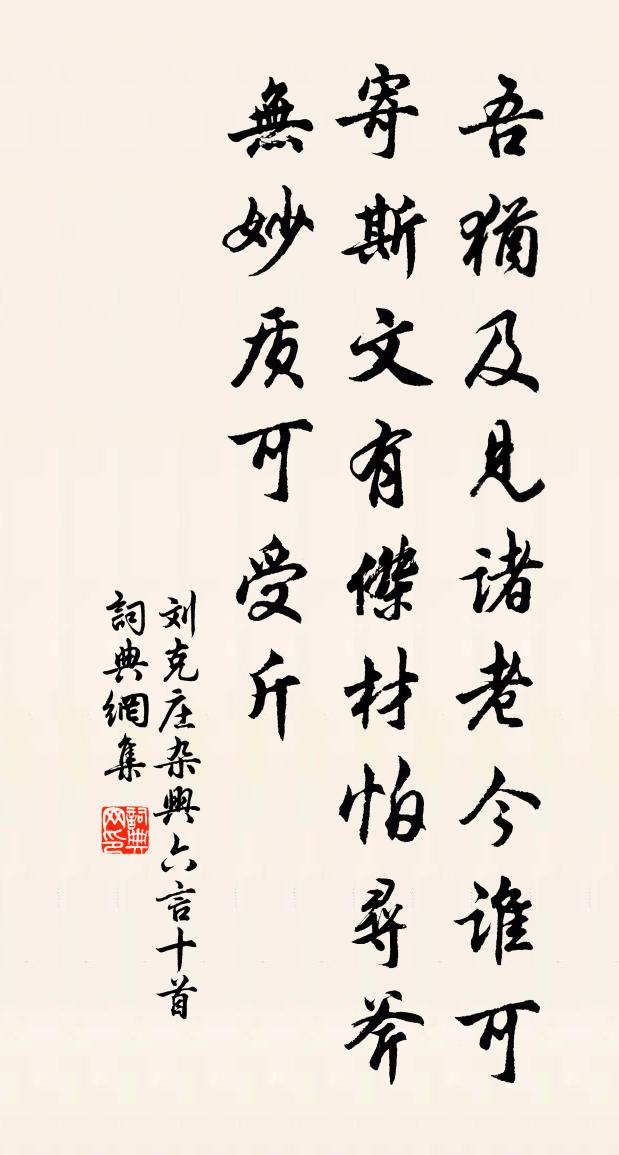 詩詞名句歷史字典書法欣賞書法字典國語詞典說文解字康熙字典古漢語字典標 題 作 者 詩 句 雜興六言十首作者:劉克莊 朝代:宋代雜興六言十首原文吾猶及見諸老,今誰可寄斯文。有傑材怕尋斧,無妙質可受斤。詩詞問答問:雜興六言十首的作者是誰?答:劉克莊問:雜興六言十首寫於哪個朝代?答:宋代問:劉克莊的名句有哪些?答:劉克莊名句大全劉克莊雜興六言十首書法欣賞雜興六言十首書法作品詩詞推薦漢宮春晁沖之〔宋代〕黯黯離懷,向東門系馬,南浦移舟。薰風亂飛燕子,時下輕鷗。無情渭水,問誰教、日日東流。常是送、行人去後寄山友徐靈暉翁卷〔宋代〕若非殊俗好,那肯愛幽居。深么無來客,空山自讀書。樹蟬經雨少,門柳望秋疎。相憶何時去,閒園共爾鋤。送儲令赴韶州樂昌梅堯臣〔宋代〕嘗聞韶石下,虞舜古祠深。至樂久已寂,況持陶令琴。炎方不道遠,一去值秋霖。桃源憶故人趙彥端〔宋代〕修檐墮玉欺窗竹。獨坐冷雲堆屋。此味與誰同宿。幾寸東齋燭。煙鬟霧鬢春山曲。好夢淺愁相續。那慰沈腰如束。新年晁說之〔宋代〕何事重新作此年,身無疾病意欣然。春風莫但開桃李,吹落妖星靜九天。水調歌(題弩社頭籌簇)程節齋〔宋代〕都尉部千弩,舊事漢材官。連拳一臂三石,夜半破陰山。曾使中有捫足,造次摧堅挫銳,分白辱寵涓。省括一機耳閒居無瑕酬答假庭下三物作梅問竹方岳〔宋代〕一壑煙寒孰與娛,橫斜影對此君癯。風饕雪虐轉強項,惟我與君其是夫。和季弟韻二十首劉克莊〔宋代〕蠡管安能測混茫,楚狂敢道國人狂。似聞函谷逐秦客,恰見初筵笑郭郎。壯志不如乘下澤,微辭何足諷高唐。入山暮春雜興葛起耕〔宋代〕小隱山林羽已成,市朝聲利讓渠爭。是非每向靜中見,悔吝多從動處生。且約蒼官陪竹友,共邀歡伯訪梅兄。歲寒長乾里羅必元〔宋代〕山壠中間號曰乾,此乾長里盛衣冠。想應王謝朝回後,日日行人看繡鞍。薌林感舊釋行海〔宋代〕平生最愛薌林石,奇樹怪藤猿往來。舊友共題行記處,如今字字是蒼苔。南中送北使二首張說〔唐代〕傳聞合蒲葉,曾向洛陽飛。何日南風至,還隨北使歸。紅顏渡嶺歇,白首對秋衰。高歌何由見,層堂不可違。誰憐將赴汝州,途出浚下,留辭李相公劉禹錫〔唐代〕長安舊遊四十載,鄂渚一別十四年。後來富貴已零落,歲寒松柏猶依然。初逢貞元尚文主,雲闕天池共翔舞。相看千秋歲 壽劉中庵程文海〔元代〕報梅開處。又報君初度。冰雪種,瓊瑤樹。重逢仍嫵媚,方發非遲暮。春滿面,廣平消得平生賦。觀里桃應妒。無次韻斯遠折梅之作趙蕃〔宋代〕春歸寂寞誰與傳,梅開年後並臘前。江南此物處處有,不論水際仍山顛。為之著句道所以,點檢敗篋曾年年。七言題郭侍郎親仁里幽居姚合〔唐代〕入門塵外思,苔徑藥苗間。洞裡應生玉,庭前自有山。帝城唯此靜,朝客更誰閒。野鶴松中語,時時去復還。送復夢赴韋令幕元稹〔唐代〕世上於今重檢身,吾徒耽酒作狂人。西曹舊事多持法,慎莫吐他丞相茵。念奴嬌王以寧〔宋代〕雲收天碧。漸風高露冷,群喧初寂。遠浦歸舟荒渡口,搴篷橫棹堤側。一帶澄江,十分蟾影,千里寒光白。襟懷迎益昌道中次兄長韻二首李流謙〔宋代〕木杪著郵亭,山行未飽經。已成身挈挈,恐失鬢青青。老樹霞烘幄,陰岸雪糝屏。冰霜先訓先,敢負舊趨庭。移瑞香姜特立〔宋代〕少年無酒答群葩,投老逢春鬢已華。今日對花無意思,花應憐我我憐花。名句推薦日日雨不斷,愁殺望山人。賈島《望山》 其日,有雨不採,晴有雲不採;晴,采之、蒸之、搗之、焙之、穿之、封之、茶之乾矣。陸羽《茶經·三之造》 孤山寺北賈亭西,水面初平雲腳低。白居易《錢塘湖春行》 賞賜不能喜,誅罰不能威。墨子《墨子·05章 七患》 霜風漸欲作重陽,熠熠溪邊野菊香。蘇軾《捕蝗至浮雲嶺山行疲苶有懷子由弟二首·其二》 孤芳一世,供斷有情愁,消瘦損,東陽也,試問花知否曹組《驀山溪·梅》 既生瑜,何生亮!羅貫中《三國演義·第五十七回》 借得山東煙水寨,來買鳳城春色施耐庵《念奴嬌·天南地北》 浩蕩離愁白日斜,吟鞭東指即天涯。龔自珍《己亥雜詩·其五》 霸圖今已矣,驅馬復歸來。陳子昂《燕昭王》