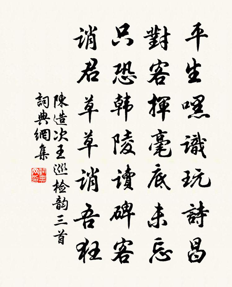 詩詞名句歷史字典書法欣賞書法字典國語詞典說文解字康熙字典古漢語字典標 題 作 者 詩 句 次王巡檢韻三首作者:陳造 朝代:宋代次王巡檢韻三首原文平生嘿識玩詩昌,對客揮毫底未忘。只恐韓陵讀碑客,誚君草草誚吾狂。詩詞問答問:次王巡檢韻三首的作者是誰?答:陳造問:次王巡檢韻三首寫於哪個朝代?答:宋代陳造次王巡檢韻三首書法欣賞次王巡檢韻三首書法作品詩詞推薦雜詩錢選〔宋代〕青春躍馬兩山間,溪柳岩花動客顏。日落孤城金鐸振,草深荒塚石人閒。庾郎賦就元無味,阮籍途窮且未還。江左登四明山 * 澄〔宋代〕會稽東南秀,四明名更佳。蜿蜒三百里,慘澹青蓮花。伊昔天地初,山川始萌芽。六丁揮神斧,斲削如人家。四牖正月二日雪張蘊〔宋代〕雨送冬雷了,如篵墮曉晴。縈盈溪樹色,騷殺紙窗聲。著瓦消還易,因風凍不成。紛紛門外屨,猶自賀元正。伯兄新樓十首王柏〔宋代〕野色晴暉展畫屏,綠槐古樾兩娉婷。卻嫌一帶無情竹,只放金華半段青。眼兒媚仲並〔宋代〕鈴閣尋盟未肯寒。鷁首駐江乾。雲煙翰墨,風流尊俎,不放更殘。金聲擲地西清老,天未許終閒。知音素賞,當筵病起白居易〔唐代〕病不出門無限時,今朝強出與誰期?經年不上江樓醉,勞動春風揚酒旗。金陵有美堂梅堯臣〔宋代〕李白愛山如洛陽,三杯為歌愁日長。廢基台殿不可識,玉燕舊棲王謝堂。公來碧瓦起棟宇,羅列圖畫牙作床。池頭元日衛宗武〔宋代〕曉來雲氣忽氤氳,上瑞俄驚到眼頻。隔得一農猶帶臘,飛畫萬點總成春。方傳六琯葭灰動,又報千林花事新。試向余夫人輓詞張嵲〔宋代〕弱歲承苹藻,慈和內政惇。辛勤立門戶,壽考見曾孫。寵秩官封貴,徽音琬琰存。新阡卜何許,當可萬家屯。詠架上鷹崔鉉〔唐代〕天邊心膽架頭身,欲擬飛騰未有因。萬里碧霄終一去,不知誰是解絛人。鑷白曲薛逢〔唐代〕去年鑷白鬢,鏡里猶堪認年少。今年鑷白髮,兩眼昏昏手戰跳。滿酌濃酹假顏色,顏色不揚翻自笑。少年曾讀古人天台思古趙湘〔唐代〕遊人行盡天台路,仙家杳杳知何處。惟有山前一派溪,落花依舊流春暮。戲題無常鍾二絕范成大〔宋代〕著衫脫褲兩浮休,切莫隨渠認路頭。三尺蒲牢關底事,尋聲接響大悠悠。朱娘曲葉適〔宋代〕憶昔剪茅長橋濱,朱娘酒店相為鄰。自言三世充拍戶,官拋萬斛嗟長貧。母年七十兒亦老,有孫更與當壚否。后街幽意趙崇嶓〔宋代〕開簾野水聲,倚杖青山色。幽意在人間,人間不相識。望鳴皋山白雲寄洛陽盧主簿李頎〔唐代〕飲馬伊水中,白雲鳴皋上。氛氳山絕頂,行子時一望。照日龍虎姿,攢空冰雪狀。嵡嵸殊未已,崚嶒忽相向。皎皎句楊億〔宋代〕渡海鯨波息,登山豹霧清。梅花喜神譜大開一十四枝宋伯仁〔宋代〕仙掌在何處,徒成千載羞。唯有故園菊,沾濡當九秋。貪泉鄧林〔宋代〕千古遺蹤散曉煙,空餘兩字寺門前。世間貪者滔滔是,何必俱曾飲此泉。螢火張嵲〔宋代〕徂暑初殘夜,飛螢遍曲塘。翕張舒焰短,雨注引輝長。翻屋星移位,窺簾燼吐光。未應彌輦路,聊可映書囊。乍與名句推薦郎到斷橋須有路,儂住處,柳如金。張惠言《江城子·填張春溪西湖竹枝詞》 重幃深下莫愁堂,臥後清宵細細長。李商隱《無題·重幃深下莫愁堂》 思君如滿月,夜夜減清輝。張九齡《賦得自君之出矣》 家住層城臨漢苑,心隨明月到胡天。皇甫冉《春思》 雪岸叢梅發,春泥百草生。杜甫《陪裴使君登岳陽樓》 翰林風月三千首,寄與吳姬忍淚看。劉著《鷓鴣天·雪照山城玉指寒》 親戚不附,無務外交。墨子《墨子·02章 修身》 烽火城西百尺樓,黃昏獨上海風秋。王昌齡《從軍行七首》 琴里知聞唯淥水,茶中故舊是蒙山。白居易《琴茶》 以此虧奪民衣食之財,仁者弗為也。墨子《墨子·32章 非樂(上)》