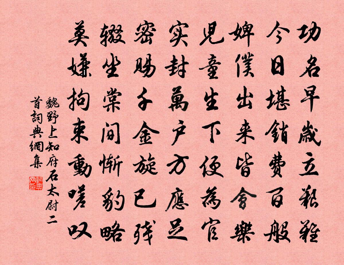 詩詞名句歷史字典書法欣賞書法字典國語詞典說文解字康熙字典古漢語字典標 題 作 者 詩 句 上知府石太尉二首作者:魏野 朝代:宋代上知府石太尉二首原文功名早歲立艱難,今日堪銷費百般。婢僕出來皆會樂,兒童生下便為官。實封萬戶方應足,密賜千金旋已殘。輟坐棠間慚豹略,莫嫌拘束動嗟嘆。詩詞問答問:上知府石太尉二首的作者是誰?答:魏野問:上知府石太尉二首寫於哪個朝代?答:宋代魏野上知府石太尉二首書法欣賞上知府石太尉二首書法作品詩詞推薦答子勉三首蘇軾〔宋代〕驚人得佳句,或以傲王公。處士還清節,滑稽安足雄。深沉似康樂,簡遠到安豐。一點無俗氣,相期林下風。送許仁叔解組東歸度正〔宋代〕萬里來官蜀錦城,西南籍籍飲清名。幕中議論誰為敵,天下交遊我與盟。聖處工夫須自得,明時事業只安行。草堂浮丘亭范成大〔宋代〕黟山鬱律神仙宅,三十六峰雷雨隔。碧城欄檻偃雙旌,笑挹浮丘為坐客。岩扉無鎖晝長開,紫雲明滅多樓台。雲中和炅法師游昆明池詩 二庾信〔南北朝〕秋光麗晚天。鷁舸泛中川。密菱障浴鳥。高荷沒釣船。碎珠縈斷菊。殘絲繞折蓮。落花催斗酒。棲烏送一弦。金柅園晏殊〔宋代〕臨川樓上柅園中,十五年前此會同。一曲清歌滿樽酒,人生何處不相逢。出都來陳,所乘船上有題小詩八首,不知何人蘇軾〔宋代〕我行無疾徐,輕楫信溶漾。船留村市鬧,閘發寒波漲。觀梅王柟〔宋代〕誰見梅花正發時,江天天雪意欲垂垂。疏枝冷蕊春無幾,斷水殘雲意自奇。疏影偶因明月見,暗香惟有好風知。何清夜辭十首白玉蟾〔宋代〕憑虛兮御氣,乘風兮駕浮。朝罷兮歸來,天邊兮月鉤。王敬伯歌李端〔唐代〕妾本舟中女,聞君江上琴。君初感妾意,妾亦感君心。遂出合歡被,同為交頸禽。傳杯唯畏淺,接膝猶嫌遠。侍婢晏子不死君難左丘明〔先秦〕崔武子見棠姜而美之,遂取之。莊公通焉。崔子弒之。 晏子立於崔氏之門外。其人曰:“死乎?”曰:“獨吾村樂黃敏求〔宋代〕敲冰汲淥洪茶鼎,撼雪梯薪給地爐。圃有麥苗畦有菜,更於何地享膏腴。清平樂(詠岩桂)蘇庠〔宋代〕斷崖流水。香度青林底。元配騷人蘭與芷。不數春風桃李。淮南叢桂小山。詩翁合得攀翻。身到十洲三島,心游萬賦得瀑布張耒〔宋代〕浩浩自太古,洋洋灌百川。深將一源潤,首出萬峰巔。晴浴岱宗日,香通華岳蓮。應有真仙子,揮榜上青天。武昌懷古棲一〔唐代〕戰國城池盡悄然,昔人遺蹟遍山川。笙歌罷吹幾多日,台榭荒涼七百年。蟬響夕陽風滿樹,雁橫秋島雨漫天。堪嗟願成四勝深心偈晃逈〔宋代〕豁然悟空,瞭然見性。凝然不動,寂然無思。和陶詠貧士七首吳芾〔宋代〕我愛徐孺子,高名滿江乾。眾人皆欲仕,乃獨恥為官。曾不憚辛苦,負耒營一餐。清節映千古,至今聞者寒。洪井西江月(送衛卿弟赴定遠簿)葛勝仲〔宋代〕萬卷舊推鴻博,一官且慰蹉跎。昇平樓下賜危科。曾對顒昂黼坐。燕頷從來骨貴,鸞棲尚屈才多。今宵且共入無何細雨晁公溯〔宋代〕細雨真宜麥,輕陰似養花。人煙隨土斷,村徑逐溪斜。大道能方軌,春泥欲濺車。歸來洗鞾袴,城郭未吹笳。宜月梅方蒙仲〔宋代〕人言廣寒宮,合種梅花樹。那知白玉容,自怕嫦娥妒。次韻王大光見贈衛博〔宋代〕頭角崢嶸冠八龍,相逢宛馬昔從東。披懷一笑交情重,轉眼三年世事空。浪跡偶登君子裡,歲寒今見古人風。新詩名句推薦試上吳門窺郡郭,清明幾處有新煙。張繼《閭門即事》 橋成漢渚星波外,人在鸞歌鳳舞前。晏幾道《鷓鴣天·當日佳期鵲誤傳》 受人之託,忠人之事馮夢龍《警世通言·卷三十四》 團扇不搖風自舉,盈盈翠竹,纖纖白薴,不受些兒暑。文徵明《青玉案·庭下石榴花亂吐》 年華共,混同江水,流去幾時回納蘭性德《滿庭芳·堠雪翻鴉》 何日請纓提銳旅,一鞭直渡清河洛。岳飛《滿江紅·登黃鶴樓有感》 昔日橫波目,今成流淚泉。李白《長相思三首·其二》 掩淚空相向,風塵何處期盧綸《李端公/送李端》 凌余陣兮躐余行,左驂殪兮右刃傷。屈原《國殤》 江上晚來堪畫處,釣魚人一蓑歸去。馬致遠《壽陽曲·江天暮雪》