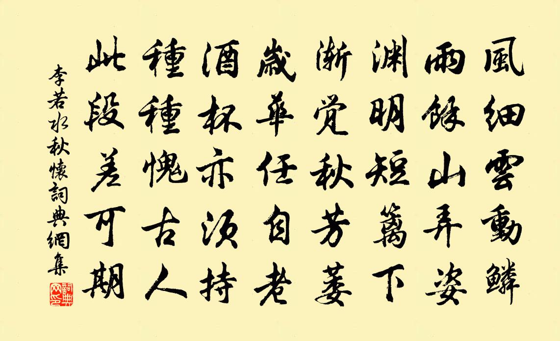 詩詞名句歷史字典書法欣賞書法字典國語詞典說文解字康熙字典古漢語字典標 題 作 者 詩 句 秋懷作者:李若水 朝代:宋代秋懷原文風細雲動鱗,雨余山弄姿。淵明短籬下,漸覺秋芳萎。歲華任自老,酒杯亦須持。種種愧古人,此段差可期。詩詞問答問:秋懷的作者是誰?答:李若水問:秋懷寫於哪個朝代?答:宋代李若水秋懷書法欣賞秋懷書法作品詩詞推薦柳湖晚歸鄭獬〔宋代〕碧天寫入柳湖底,天上醉遊春日斜。便留畫舫入城去,不忍馬蹄踏落花。君錫宰壽春李覯〔宋代〕淪落多愁笑不成,水邊還是送君行。官為令長前程好,地近鄉關喜氣生。百里有人觀惠術,三年唯我見交情。山中送僧之東都貫休〔唐代〕之子之東洛,囊中有偈新。紅塵誰不入,獨鶴自難親。定鼎門連岳,黃河凍過春。憑師將遠意,說似社中人。瑣窗寒劉辰翁〔宋代〕嫩綠如新,嬌鶯似舊,今吾非故。空山過雨,睍睆留春春去。似尊前曲曲陽關,行人回首江南處。漫停雲低黯,征嘲林可山稱和靖七世孫姜夔〔宋代〕和靖當年不聚妻,因何七世有孫兒。若非鶴種並龍種,定是瓜皮搭李皮。觀漲馮伯規〔宋代〕孤城如深村,過客絕輪鞅。江流卷初霽,晚風納微爽。我來適幽懷,新漲逸遠響。汀沒鷗鷺翔,牧罷牛羊上。郡古題晉王大令保母帖湯炳龍〔宋代〕曹娥洛神遍堪輿,保母后出爭瀾趨。一時耳目喜新畢,九原誰復哀意如。世人重藝不重義,每以好奇夸好事。集古米元章賞心詩帖贊岳珂〔宋代〕金陵之賞心,天下之奇觀,真足以當南宮之詩翰。予之持節登覽大一旦,而得此詩八年之泮奐。吁嗟公兮,豈料百括賀新涼林正大〔宋代〕生長湖山曲。羨吳兒、呼吸湖光,飽餐山淥。世外不須論隱逸,誰似先生冰玉。自骨冷、神清無俗。我不識君曾夢無為縣齋古梅劉用行〔宋代〕疏疏密密臥檐牙,古縣清貧有此花。彭澤菊松無醞藉,河陽桃李太鉛華。臨池照影成雙好,與雪爭輝自一家。消得偶成石延年〔宋代〕力振前文覺道孤,恥同流輩論榮枯。動非仁義何如靜,得見機關不似無。孔孟也宜輕管晏,臯夔未必失唐虞。侯王感山十詠石橋姚勉〔宋代〕石樑平砥似,池水明鏡如。晚涼散步穩,憑欄此觀魚。所思杜甫〔唐代〕苦憶荊州醉司馬,謫官樽俎定常開。九江日落醒何處,一柱觀頭眠幾回。可憐懷抱向人盡,欲問平安無使來。故憑禪人並化主寫真求贊釋正覺〔宋代〕靈靈而空,了了而融。正偏之機轉,佛祖之道同。玉井有月,冰壺無風。兒孫得力成家事,影現諸塵三昧中。品令(詠棋)楊 * 〔宋代〕日長風靜。濃香在、珠簾花影。棋具對著明窗近。未排角勢,鴉鷺先分陣。雙疊遠山非有恨。正藏機休問。便如喝滿庭芳(萍)劉貴翁〔宋代〕宮鳥西飛,楊花北去,春風飄向伊誰。盈盈小小,輕薄不堪肥。天付風流到骨,消不盡、流落青池。誰知道,踏歌春詞毛滂〔宋代〕八風調養力,九地發生深。共被年豐賜,誰知日昃心。玉漏遲史深〔宋代〕綠樹深庭院。侵簾暝草,沿砌幽蘚。問訊餘芳,糝逕碎紅千點。暗有芹香墜幾,認杏棟、營巢新燕。晴思軟。春光發臨洮將赴北庭留別(得飛字)岑參〔唐代〕聞說輪台路,連年見雪飛。春風曾不到,漢使亦應稀。白草通疏勒,青山過武威。勤王敢道遠,私向夢中歸。送延平二堂長陳宓〔宋代〕延平學術號淵源,端的名師四代傳。連歲朋來多秀士,一朝歸去兩高賢。休言道統追千載,但淑人心直幾錢。見說名句推薦至樂無樂,至譽無譽。莊子《莊子·外篇·至樂》 異鄉物態與人殊,惟有東風舊相識歐陽修《春日西湖寄謝法曹歌》 以眾擊寡,利以清晨;強弩長兵,利以捷次諸葛亮《將苑·卷二·便利》 試澆橋下水,今夕到湘中。陳與義《臨江仙·高詠楚詞酬午日》 河西幕中多故人,故人別來三五春。岑參《涼州館中與諸判官夜集》 今之孝者,是謂能養。至於犬馬皆能有養;不敬,何以別乎?孔子弟子《論語·為政篇》 楝花飄砌。蔌蔌清香細。謝逸《千秋歲·詠夏景》 民之無良,相怨一方,受爵不讓,至於己斯亡。荀子《荀子·儒效》 三杯通大道,一醉解千愁。佚名《增廣賢文·上集》 風雨送春歸,飛雪迎春到。 * 《卜運算元·詠梅》