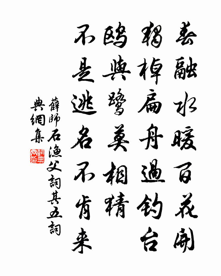 詩詞名句歷史字典書法欣賞書法字典國語詞典說文解字康熙字典古漢語字典標 題 作 者 詩 句 漁父詞(其五)作者:薛師石 朝代:宋代漁父詞(其五)原文春融水暖百花開。獨棹扁舟過釣台。鷗與鷺,莫相猜。不是逃名不肯來。詩詞問答問:漁父詞(其五)的作者是誰?答:薛師石問:漁父詞(其五)寫於哪個朝代?答:宋代問:漁父詞(其五)是什麼體裁?答:詞薛師石漁父詞(其五)書法欣賞漁父詞(其五)書法作品詩詞推薦頌古九十八首釋印肅〔宋代〕東西南北,通徹交過。悟者清涼,迷者大禍。隨流入流,法真不墮。若未全提,誰敢擔何。別蒲圻徐丞於金雞驛次李和卿韻廖行之〔宋代〕金雞亭上小舂容,日射湖光照眼沈。痛飲壯君堪八斗,劇談應我避群鋒。笑看天際孤飛鶩,驚起波中老蟄龍。明日郊行釋文珦〔宋代〕陋室隨緣住,空山信意行。何須稱隱逸,且復謝將迎。古木青猨性,孤煙白鳥程。由來各有適,豈必用浮名。頌釋清〔宋代〕諸佛出身處,東山水上行。石壓筍斜出,岸懸花倒生。伊水門樓穎〔唐代〕朝涉伊水門,伊水入門流。愜心乃成興,澹然泛孤舟。霏微傍青靄,容與隨白鷗。竹陰交前浦,柳花媚中洲。日落次花翁冬日三詩杜范〔宋代〕料理新陽在此朝,休文但覺頻寬腰。懶將漫刺巡門到,病怕時人舉酒邀。強裹青衫空自累,滿簪白髮不相饒。冥心織婦嘆戴復古〔宋代〕春蠶成絲復成絹,養得夏蠶重剝繭。絹未脫軸擬輸官,絲未下車圖贖典。一春一夏為蠶忙,織婦布衣仍布裳;有布春日田園雜興周暕〔宋代〕蛙聲似吹雨初足,桑萁欲紅風始和。少婦每憂蠶利薄,老夫惟喜秫苗多。舊栽花木山鶯識,新買陂塘野鷺過。此境題李成寒雅圖仇遠〔宋代〕老樹枯苔雪乍晴,飢烏飛集噤無聲。蒺藜沙上花開早,且讓春風與燕鶯。絕句敖陶孫〔宋代〕霜風欺斷柳,星月愛平蕪。船暖知村近,鍾寒想寺孤。杏花天(賦疏杏)張炎〔宋代〕湘羅幾翦粘新巧。似過雨、胭脂全少。不教枝上春痕鬧。都被海棠分了。帶柳色、愁眉暗惱。謾遙指、孤村自好。品令歐陽修〔宋代〕漸素景。金風勁。早是淒涼孤冷。那堪聞、蛩吟穿金井。喚愁緒難整。懊惱人人薄倖。負雲期雨信。終日望伊來,甲子春過浙和周去華韻五絕史堯弼〔宋代〕雙峰翠掃半天餘,遙想岷峨霽雪初。足踏東南今已遍,卻思歸臥舊時廬。梅花蘇軾〔宋代〕南行渡關山,沙水清練練。行人已愁絕,日暮集微霰。殷勤小梅花,仿佛吳姬面。暗香隨我去,回首驚千片。至今臨頓為吳中偏勝之地陸魯望居之不出郛郭曠若…奉題屋壁皮日休〔唐代〕一方蕭灑地,之子獨深居。繞屋親栽竹,堆床手寫書。高風翔砌鳥,暴雨失池魚。暗識歸山計,村邊買鹿車。籬疏送薛予舒船官葛天民〔宋代〕憶君江上去,船重載書多。學乃從吾好,閒應喜客過。薰風新綠樹,明月舊滄波。自古關情處,相思人詠歌。姚行簡撫乾歸霅川袁說友〔宋代〕一見油然慰所望,巾車更辱到他鄉。相從樂處光陰速,索笑濃時意味長。樽酒未堪留好客,湖山早已關歸艎。秋來題張簿尉槎溪集劉克莊〔宋代〕千載枯槎無主名,才翁子晦各偷撐。分明博望升天訴,不許人間別姓爭。翠羽池陳岩〔宋代〕錦雞花鴨爛成文,連雁雙鳧雪羽紛。同免王孫金彈子,飛來飛去一群群。飲酒陸游〔宋代〕我酒本小戶,痛飲乃有時;意氣不相值,終日持空卮。醉或能齋莊,不醉或狂逸,乃知老子狂,非自麴孽出。今日名句推薦江南自是離愁苦,況游驄古道,歸雁平沙。王沂孫《高陽台·和周草窗寄越中諸友韻》 輕財足以聚人,律己足以服人,量寬足以得人,身先足以率人。陳繼儒《小窗幽記·集醒篇》 不種閒花,池亭畔、幾竿修竹。陸容《滿江紅·詠竹》 出犯繁花露,歸穿弱柳風溫庭筠《清明日》 吳興才人怨春風,桃花滿陌千里紅。李賀《送沈亞之歌·並序》 花自飄零水自流。一種相思,兩處閒愁。李清照《一剪梅·紅藕香殘玉簟秋》 靈台無計逃神矢,風雨如磐暗故園。魯迅《自題小像》 一道殘陽鋪水中,半江瑟瑟半江紅。白居易《暮江吟》 寧添一斗,莫添一口。佚名《增廣賢文·上集》 民惟邦本,本固邦寧。佚名《尚書·夏書·五子之歌》