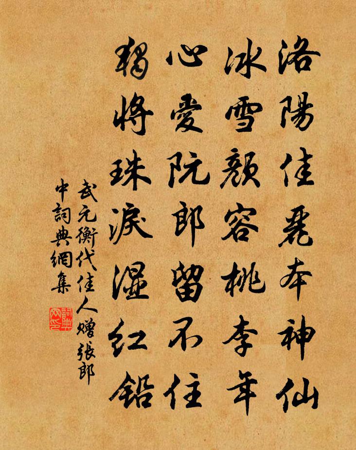 詩詞名句歷史字典書法欣賞書法字典國語詞典說文解字康熙字典古漢語字典標 題 作 者 詩 句 代佳人贈張郎中作者:武元衡 朝代:唐代代佳人贈張郎中原文洛陽佳麗本神仙,冰雪顏容桃李年。心愛阮郎留不住,獨將珠淚濕紅鉛。詩詞問答問:代佳人贈張郎中的作者是誰?答:武元衡問:代佳人贈張郎中寫於哪個朝代?答:唐代問:代佳人贈張郎中是什麼體裁?答:七絕武元衡代佳人贈張郎中書法欣賞代佳人贈張郎中書法作品注釋全唐詩:卷317-116詩詞推薦初冬真山民〔宋代〕林葉新經數夜霜,地爐獨擁一山房。塵書邀我共高閣,濁酒勸人歸醉鄉。費省家貧還似富,身閒日短亦如長。梅花張居士歌李廌〔宋代〕凡夫冥冥不知曉,劫塵流浪如沙掃。上天宮闕隔青雲,九原壠暮空秋草。神仙有意憐下土,獨取飆車出三島。張翁偶成二首張耒〔宋代〕綠遍長安樹,春歸空隔年。愁多落花地,情遠倚樓天。河漢崑崙外,蒼龍北極天。老知玄有味,羞更賦神仙。挽段夫人二首劉克莊〔宋代〕斷機手自訓三珠,彤史遺芳未必如。子貴面槐陪國論,母賢畫荻課兒書。百官未講回班禮,千乘空多送葬車。曾忝台中題壁武元衡〔唐代〕柏台年未老,蓬鬢忽蒼蒼。無事裨明主,何心弄憲章。雀聲愁霰雪,鴻思恨關梁。會脫簪纓去,故山瑤草芳。句孫山〔宋代〕結宇孤峰上,安禪巨浪間。賦得春雪映早梅元稹〔唐代〕飛舞先春雪,因依上番梅。一枝方漸秀,六出已同開。積素光逾密,真花節暗催。摶風飄不散,見晛忽偏摧。郢曲贈太子太保晁文公輓詞二首宋庠〔宋代〕帝禁留辭范,儒林老棟材。方期割牲禮,遽近奠楹災。歲晏巢鵀逝,天秋弔鶴來。宗工銘盛德,千古照泉台。嘏辭先秦無名〔先秦〕皇屍命工祝。承致多福無疆。於女孝孫。來女孝孫。使女受祿於天。宜稼于田。眉壽萬年。笏替引之。南陽小將張彥硤口鎮稅人場射虎歌(一作白居易詩)韋莊〔唐代〕海內昔年狎太平,橫目穰穰何崢嶸。天生天殺豈天怒,忍使朝朝餵猛虎。關東驛路多丘荒,行人最忌稅人場。張彥次韻二首鄧肅〔宋代〕怪底祥光夜滿門,朝來入社得詩人。空疏嗟我句無眼,俊逸知君筆有神。共隱兵戈不到處,相攜雲水自由身。便當謁金門丘崈〔宋代〕羅袖薄。玉臂鏤花金約。起晚欠伸蓮步弱。倚床嬌韻惡。獨自青樓珠箔。怎向日長花落。門掩東風春寂寞。誤人瞋排遍第六(帶花遍)曾布〔宋代〕向紅塵里,有喧呼攘臂,轉聲辟眾,莫遣人冤濫、殺張室,忍偷生。僚吏驚呼呵叱,狂辭不變如初,投身屬吏,慷達磨贊釋可湘〔宋代〕萬里見梁王,無風波浪起。不得一莖蘆,幾乎沉殺你。書紫芝卷後蘇泂〔宋代〕為愛君詩清入骨,每常吟便學推敲。明知篋笥篇篇有,百度逢來百度抄。送張知錄葉適〔宋代〕門閥飛龍後,家聲入館前。身饒太常長,客欠廣文氈。流落無先譽,遭逢有宿緣。炎洲路多少,謾數去鴻邊。五峰瀑布倪思〔宋代〕行行窮盡深林外,碧瓦鱗差依翠麓。峰巒左右相迴環,萬葉霜丹間晴綠。忽聞雷霆腳底聲,聲撼乾關隱坤軸。雙龍堯任舜禹行釋文珦〔宋代〕堯任舜禹,聖化日熙。二臣至德,惟堯克知。明良胥會,徵庸弗疑。佐命垂統,股肱綱維。行堯之道,蚤夜孳孳。醉落魄/一斛珠王千秋〔宋代〕驚鷗撲蔌。蕭蕭臥聽鳴幽屋。窗明怪得雞啼速。牆角爛斑,一半露松綠。歌樓管竹誰翻曲。丹唇冰面噴餘馥。遺珠南鄉子 贈友人魏初〔元代〕一別五雲城。慚愧朝陽有鳳鳴。奔走幾年成潦倒,堪驚。底事能傳萬古名。猶記少年行。可慣清樽獨自傾。昨日東名句推薦數州訊息斷,愁坐正書空。杜甫《對雪》 夜來攜手夢同游,晨起盈巾淚莫收。白居易《夢微之》 望征路愁迷,離緒難整陸叡《瑞鶴仙梅》 乍咽涼柯,還移暗葉,重把離愁深訴王沂孫《齊天樂·蟬》 畢竟西湖六月中,風光不與四時同。楊萬里《曉出淨慈寺送林子方》 巧匠目意中繩,然必先以規矩為度韓非及後人《韓非子·有度》 今古長如白練飛,一條界破青山色。徐凝《廬山瀑布》 心能辨事非,處事方能決斷;人不忘廉恥,立身自不卑污。王永彬《圍爐夜話·第二十則》 當場不論,過後枉然。佚名《增廣賢文·下集》 念往昔,繁華競逐,嘆門外樓頭,悲恨相續。王安石《桂枝香·登臨送目》