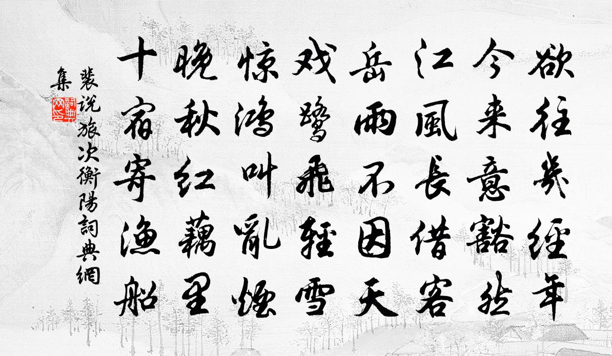 詩詞名句歷史字典書法欣賞書法字典國語詞典說文解字康熙字典古漢語字典標 題 作 者 詩 句 旅次衡陽作者:裴說 朝代:唐代旅次衡陽原文欲往幾經年,今來意豁然。江風長借客,岳雨不因天。戲鷺飛輕雪,驚鴻叫亂煙。晚秋紅藕里,十宿寄漁船。詩詞問答問:旅次衡陽的作者是誰?答:裴說問:旅次衡陽寫於哪個朝代?答:唐代問:旅次衡陽是什麼體裁?答:五律裴說旅次衡陽書法欣賞旅次衡陽書法作品注釋全唐詩:卷720-33詩詞推薦七言四韻十六首張伯端〔宋代〕草木陰陽亦兩齊,若還缺一不芳菲。初開緣葉陽先唱,次發紅花陰後隨。常道只斯為日用,真源返覆有誰知。報言句王之望〔宋代〕雪班遠岫明蒼鬢,春秀奇峰擁翠鬟。又和喜晴陳宓〔宋代〕年來日日候陰晴,渾是耕耘隴上人。但得雞豚歡里社,敢將蠱鼠累陶鈞。陶者梅堯臣〔宋代〕陶盡門前土,屋上無片瓦。寸指不沾泥,鱗鱗居大廈。和竟陵王遊仙詩沈約〔南北朝〕夭矯乘絳仙。螭衣方陸離。玉鑾隱雲霧。溶溶紛上馳。瑤颱風不息。赤水正漣漪。崢嶸玄圃上。聊攀瓊樹枝。滿江紅(次盧漕高秋長短句,並呈都大)京鏜〔宋代〕才近重陽,喜風露、醞成爽氣。應料有、悲秋情緒,澹妝慵試。 * 籬邊開遍否,紫鴻塞外歸來未。但倚闌、高處贈萬生下第還吳)郎士元〔唐代〕直道多不偶,美才應息機。灞陵春欲暮,雲海獨言歸。為客成白首,入門嗟布衣。蓴羹若可憶,慚出掩柴扉。野燒陳舜俞〔宋代〕急燒山上草,莫顧山下木。燒草得地美,欲種來歲粟。乘風縱巨燎,烈烈遍岩谷。既不問玉石,何暇愛麋鹿。寄謝鯉湖劉克莊〔宋代〕凡是龍居處,皆難敵此泉。下窮源至海,上有穴通天。小派猶成瀑,低峰亦起煙。莫疑乘鯉事,能住即能仙。古意呈補闕喬知之 / 古意 / 獨不見沈佺期〔唐代〕盧家少婦鬱金堂,海燕雙棲玳瑁梁。九月寒砧催木葉,十年征戍憶遼陽。白狼河北音書斷,丹鳳城南秋夜長。誰知次張使君韻劉克莊〔宋代〕欲架茅堂久不成,蕭然身世托專城。日無車轄非常靜,月有餐錢未是清。髠首向來輸白粲,短衣老去斸黃精。絕憐絕句三首余知閣〔宋代〕洛邑名園歌舞沈,亂鴉啼破幾深林。何人學得香山老,千載精廬有梵音。南湖有鷗成群里閭間雲數十年未嘗見也實塵中張鎡〔宋代〕朝陽鳴鳳國之祥,瑞事吾家鷗鷺行。最愛幾聲煙外響,和他漁艇獨敲榔。慶梅州劉侯修葺程鄉學宮落成三章林陶〔宋代〕闇誾諸生,振鷺來翔。詩書禮樂,游息修藏勉爾行業,為時俊良。毋毀於隨,毋嬉於荒。三歲大比,用寶於王。離巫山晚泊棹石灘下李埴〔宋代〕黃昏風雨阻江濱,翠綰群峰莫色勻。一夜子規啼到曉,孤舟愁殺未歸人。冬日雜興趙蕃〔宋代〕憒憒若有失,岑岑殊未佳。枯藜茅屋靜,高枕竹窗斜。冬日誰雲短,吾生幸有涯。薰爐微結篆,茗盌細浮花。送彭大老提舶泉南孫應時〔宋代〕人言西府厭編摩,歸臥方山意若何。出處無心亦無累,寧知世上有風波。芭蕉雨楊萬里〔宋代〕芭蕉得雨便欣然,終夜作聲清更妍。細聲巧學蠅觸紙,大聲鏘若山落泉。三點五點俱可聽,萬籟不生秋夕靜。芭蕉偈頌一百零二首釋紹曇〔宋代〕煙晴竹樹啼姑惡,月冷松梢哭子規。莫謂一聲聲破夢,未歸須憶到家時。水龍吟(自遣)趙長卿〔宋代〕煞曾著意斟量過,天下事、無窮盡。貪榮貪富,朝思夕計,空勞方寸。躡足封王,功名蓋世,誰如韓信。更堆金名句推薦多謝梅花,伴我微吟。韓疁《高陽台·除夜》 天下熙熙,皆為利來;天下攘攘,皆為利往。司馬遷《史記·貨殖列傳》 三分春色二分愁,更一分風雨。葉清臣《賀聖朝·留別》 江山如畫,一時多少豪傑蘇軾《念奴嬌·赤壁懷古》 地冷葉先盡,谷寒雲不行。李白《冬日歸舊山》 天命之謂性;率性之謂道子思《中庸·第一章》 亦余心之所善兮,雖九死其猶未悔。屈原《離騷》 論德而定次,量能而授官。荀子《荀子·君道》 禍與福同門,利與害同城。佚名《增廣賢文·下集》 鬧花深處層樓,畫簾半卷東風軟。陳亮《水龍吟·春恨》