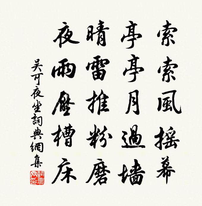 詩詞名句歷史字典書法欣賞書法字典國語詞典說文解字康熙字典古漢語字典標 題 作 者 詩 句 夜坐作者:吳可 朝代:宋代夜坐原文索索風搖幕,亭亭月過牆。晴雷推粉磨,夜雨壓槽床。詩詞問答問:夜坐的作者是誰?答:吳可問:夜坐寫於哪個朝代?答:宋代吳可夜坐書法欣賞夜坐書法作品詩詞推薦題滴水岩鮮于師中〔宋代〕岩前山溜灑如傾,三峽都無此景清。坐對秦宮垂箔景,靜聞鮫室落盤聲。好追祓禊蘭亭會,疑到神仙洞府行。每羨王真畫桃花玉頰兒扇李石〔宋代〕飛上桃花玉頰兒,小紅輕踏碧萎蕤。莫教啄破枝頭雨,怕見胭脂淚點垂。文殊台錢聞詩〔宋代〕五台山里現文殊,人指此台名似虛。正馬東峰有獅子,恐曾高跨入匡廬。柬施上舍劉宰〔宋代〕萬里秋光酒一鍾,別來木末幾西風。懷人滾滾東流水,問訊冥冥北去鴻。愧我形容難似書,喜君意氣尚摩空。相逢壽李夔州乃陽枋〔宋代〕乾月生真賢,老子其猶龍。主靜以觀動,萬籟鳴秋蟲。片心間淵明,結社同遠公。俯仰身世浮,妍華收晴虹。堂迥三月五日陪大夫泛長沙東湖(一作李群玉詩)張又新〔唐代〕上巳餘風景,芳辰集遠坰。彩舟浮泛盪,繡轂下娉婷。棲樹回蔥蒨,笙歌轉杳冥。湖光迷翡翠,草色醉蜻蜓。鳥弄市舶提舉管仲登飲於萬貢堂有詩戴復古〔宋代〕七十老翁頭雪白,落在江湖賣詩冊。平生知己管夷吾,得為萬貢堂前客。嘲吟有罪遭天厄,謀歸未辦資身策。雞林奉和張舍人閣老閣中直夜思聞雅琴因以書事通簡僚友權德輿〔唐代〕紫垣宿清夜,藹藹復沈沈。圓月衡漢淨,好風松滌深。軒窗韻虛籟,蘭雪懷幽音。珠露銷暑氣,玉徽結遐心。盛才投翰林蕭侍郎張蠙〔唐代〕九仞牆邊絕路岐,野才非合自求知。靈湫豈要魚棲浪,仙桂那容鳥寄枝。纖草不銷春氣力,微塵還助岳形儀。從來相士釋師範〔宋代〕鱗皴一塊爛枯柴,幾見春風長綠苔。豈謂先生也相許,驢年決定放花開。老將一首劉克莊〔宋代〕昨解兵符歸故里,耳聽邊事幾番新。偶逢戲下來猶識,欲說遼陽記不真。兒覓寶刀偏愛惜,奴吹蘆管輒悲辛。夜寒頌古五十五首釋紹曇〔宋代〕柳掛金絲鶯織曉,花鋪翠錦蝶眠春。見成一幅新圖畫,不待王維手眼親。奉使契丹二十八首其二十送文太師致仕還洛三蘇轍〔宋代〕國老無心豈為身,五年朝謁慰簪紳。元臣事業通三世,舊將威名服四鄰。遍閱後生真有道,欲談前事恐無人。比公答呂公著見贈歐陽修〔宋代〕晉人歌蟠蟀,孔子錄於詩。因知聖賢心,豈不惜良時。行樂不及早,朱顏忽焉衰。馳光如騕褭,一去不可追。今也送天竺僧還鄉釋永頤〔宋代〕月冷雲深天上寺,桂花千樹繞樓台。歸時若對間人說,莫道身從朋里來。荊州即事藥名詩八首黃庭堅〔宋代〕垂空青幕六,一一排風開。石友常思我,預知子能來。次韻蘇守金橘陳棣〔宋代〕孤根移植自秋山,長養潛私刺史天。青女染成金色淺,馮夷剖出蚌胎圓。慚非甘吉曾同傳,恥與楊盧議並肩。況有庚辰西域清明耶律楚材〔元代〕清明時節過邊城,遠客臨風幾許情。野鳥間關難解語,山花爛熳不知名。蒲萄酒熟愁腸亂,瑪瑙杯寒醉眼明。遙想偶興楊億〔宋代〕芳蘭琴滋九畹,琴蕭蒿亦旁植。威鳳翔丹山,鴟梟猶接翼。雅琴歌南風,蛙鳴不容息。驪珠媚清川,魚目光激射。和韋開州盛山十二首梅溪張籍〔唐代〕自愛新梅好,行尋一徑斜。不教人掃石,恐損落來花。名句推薦塞下秋來風景異,衡陽雁去無留意。范仲淹《漁家傲·秋思》 己欲立而立人,己欲達而達人。孔子弟子《論語·雍也篇》 溪壑可盈,志欲無滿。姚察、姚思廉《梁書·列傳·卷五十三》 菱葉縈波荷颭風,荷花深處小船通。白居易《採蓮曲》 兒不嫌母醜,狗不嫌家貧。佚名《增廣賢文·下集》 飢則附人, 飽便高颺房玄齡《晉書·載記·第二十三章》 曾苦傷春不忍聽,鳳城何處有花枝李商隱《流鶯》 連天衰草,望斷歸來路。李清照《點絳唇·閨思》 虛負凌雲萬丈才,一生襟抱未曾開。崔珏《哭李商隱》 細看茱萸一笑,詩翁健似常年。張可久《風入松·九日》