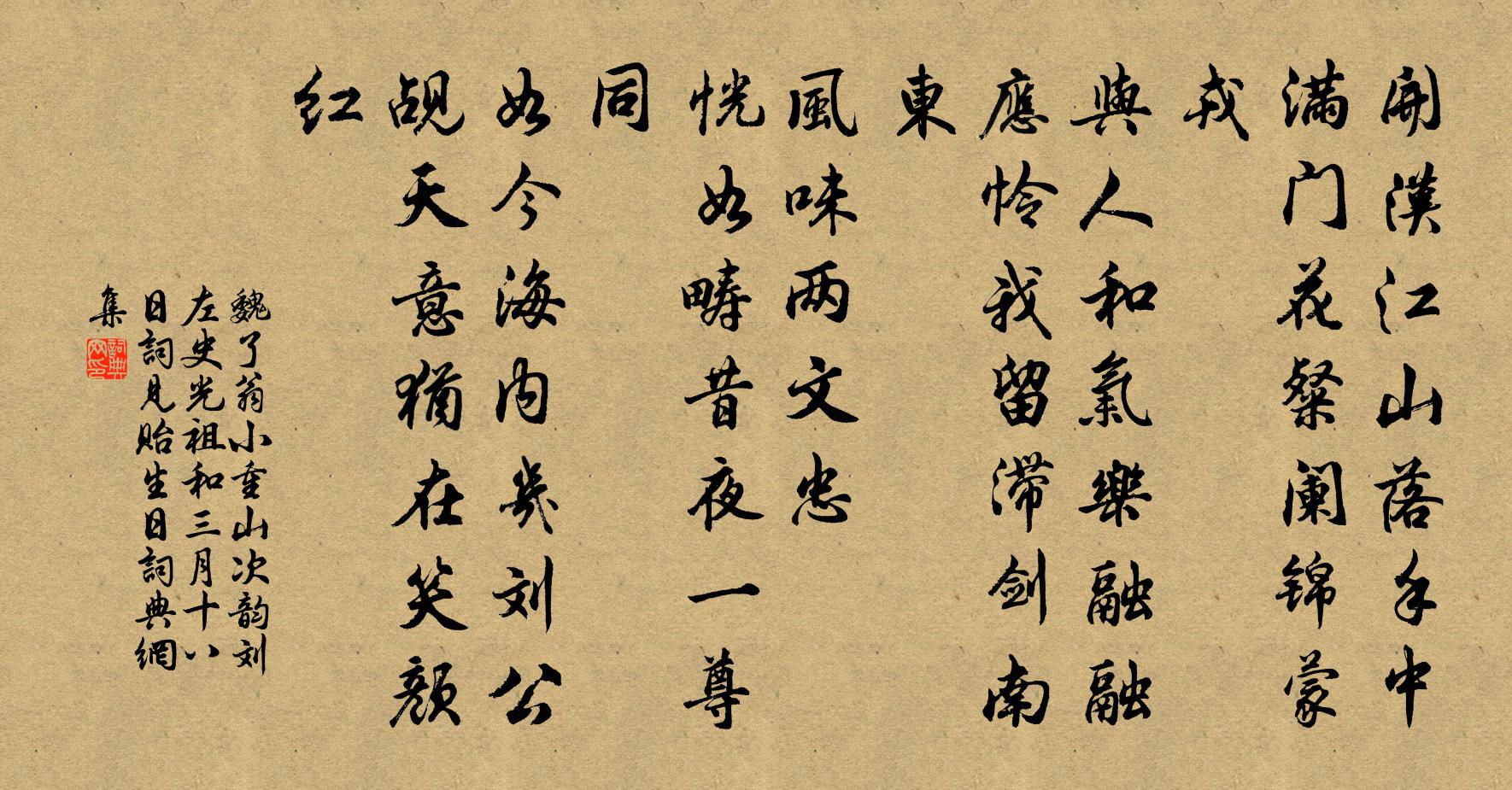 詩詞名句歷史字典書法欣賞書法字典國語詞典說文解字康熙字典古漢語字典標 題 作 者 詩 句 小重山(次韻劉左史光祖和三月十八日詞見貽生日)作者:魏了翁 朝代:宋代原文開漢江山落手中。滿門花粲闌,錦蒙戎。與人和氣樂融融。應憐我,留滯劍南東。風味兩文忠。恍如疇昔夜,一尊同。如今海內幾劉公。覘天意,猶在笑顏紅。詩詞問答問:《小重山(次韻劉左史光祖和三月十八日詞見貽生日)》的作者是誰?答:魏了翁問:該詩寫於哪個朝代?答:宋代問:該詩是什麼體裁?答:詞書法欣賞小重山(次韻劉左史光祖和三月十八日詞見貽生日)書法作品詩詞推薦過朝天嶺二首范祖禹〔宋代〕夜上朝天曉不極,舉頭唯見蒼蒼色。回看初日半輪明,下視嘉陵千丈黑。鳳陽花鼓佚名〔明代〕說鳳花陽,說鳳花陽,鳳陽花本是好地花方。自從出了朱皇帝,十年倒有九年荒。大戶人家賣騾馬,小戶人家賣兒次韻斯遠見夢有作六言二首趙蕃〔宋代〕白也江南逐客,少陵因夢成詩。我亦移官衡岳,驚烏未有安枝。慧禪人這萬年釋智愚〔宋代〕鼠入錢筒伎已窮,十年蹤跡眼頭空。如今又問平田路,山舍半吹黃葉風。頌古十首釋普岩〔宋代〕鐵壁銀山幾萬重,有無這字若為通。斬關豈非搴旗手,枉有虛名落漢中。孤山詩二首釋智圓〔宋代〕峭拔湖心起,湖心四望通。盤根入巨浸,疊翠點寒空。勢迥侔蓬島,層危敵閬風。僧樓籠淡霧,雁塔礙飛鴻。曉井旴士張季攜所注三略訪西山先生既跋其書余復劉克莊〔宋代〕張生快士非拘儒,袖出一編相斫書。撲虱拍蚊吾不忍,斷蛇刺虎子何粗。見劉後村先生吳龍翰〔宋代〕天錄臞仙后代孫,巍科幾世屬名門。千年絕學追先聖,四海真儒仰後村。直向天邊扶日月,只從筆底轉乾坤。年來六宮戲嬰圖楊維楨〔元代〕黃雲複壁椒塗蘇,銀床水噴金蟾蜍。宜男草生二月初,燕燕求友烏將雛。芙蓉花冠金結樓,飄飄儘是瑤台侶。宮中懷圭峰影林泉李洞〔唐代〕吾家舊物賈生傳,入內遙分錫杖泉。鶴去帝移宮女散,更堪嗚咽過樓前。元夕觀駕御端門詩強至〔宋代〕仙韶樓底弄春和,簾額隨風卷繡波。午夜九霄開寶扇,一聲萬壽徹明河。燈纏月影祥光動,酒入天顏喜氣多。侍從賦梅堂閒吟陳宓〔宋代〕濃霜輕雪妒清華,暖日烘時只見花。天意似憐塵世界,故將茅舍換仙家。題時遁澤畫卷十首王柏〔宋代〕虎嘯風生壑,龍藏氣吐雲。草廬勿高臥,天地正絪緼。太湖避兵方文〔清代〕將近楓橋路,唯聞人語喧。北來兵肆掠,東去艇皆奔。震澤煙波迥,高秋風雨繁。此時期免患,艱苦復何論。逢韓茂貽因贈並追傷戴敬夫邢昉〔清代〕莫道相逢久嘆嗟,尚憐流落在天涯。故人長隔黃壚面,苕水空餘白雪花。行路更無磨鏡具,扣門唯識賣漿家。羌村絕句趙希青〔宋代〕手執黃庭上石台,竹陰掃月遍蒼苔。欲從此處即仙去,玉立清風待鶴來。別輞川別業王縉〔唐代〕山月曉仍在,林風涼不絕。殷勤如有情,惆悵令人別。句曾槃〔宋代〕還持病眼將昏力,來看仙山未了青。送仇仁近持山村圖求屋貲方回〔宋代〕浪多年二十,是事弗如之。老我初登第,聞君早解詩。風霜懸齒頰,錦繡簇肝脾。才是通漫刺,誰非獻屈卮。貴人劉訥畫廬陵三老圖求詩周必大〔宋代〕同辭宦路返鄉閭,兩驌驦中間以駑。前後顧瞻羞倚玉,支幹引從偶連珠。三人不用邀明月,九老何妨續畫圖。從漢名句推薦料敵以遠,須謀於今;去賊以盡,其謀無忌。來俊臣《羅織經·謀劃卷第九》 迢迢新秋夕,亭亭月將圓。陶淵明《戊申歲六月中遇火》 年來腸斷秣陵舟,夢繞秦淮水上樓王士禎《秦淮雜詩二十首·其一》 以少總多,情貌無遺矣。劉勰《文心雕龍·物色》 夜聞歸雁生鄉思,病入新年感物華。歐陽修《戲答元珍》 商女不知亡國恨,隔江猶唱後庭花。杜牧《泊秦淮》 綠葉陰濃,遍池亭水閣,偏趁涼多。元好問《驟雨打新荷》 侵夜鸞開鏡,迎冬雉獻裘。李商隱《陳後宮》 易求無價寶,難得有心郎。魚玄機《贈鄰女 / 寄李億員外》 夫孝者,善繼人之志,善述人之事者也。子思《中庸·第十九章》