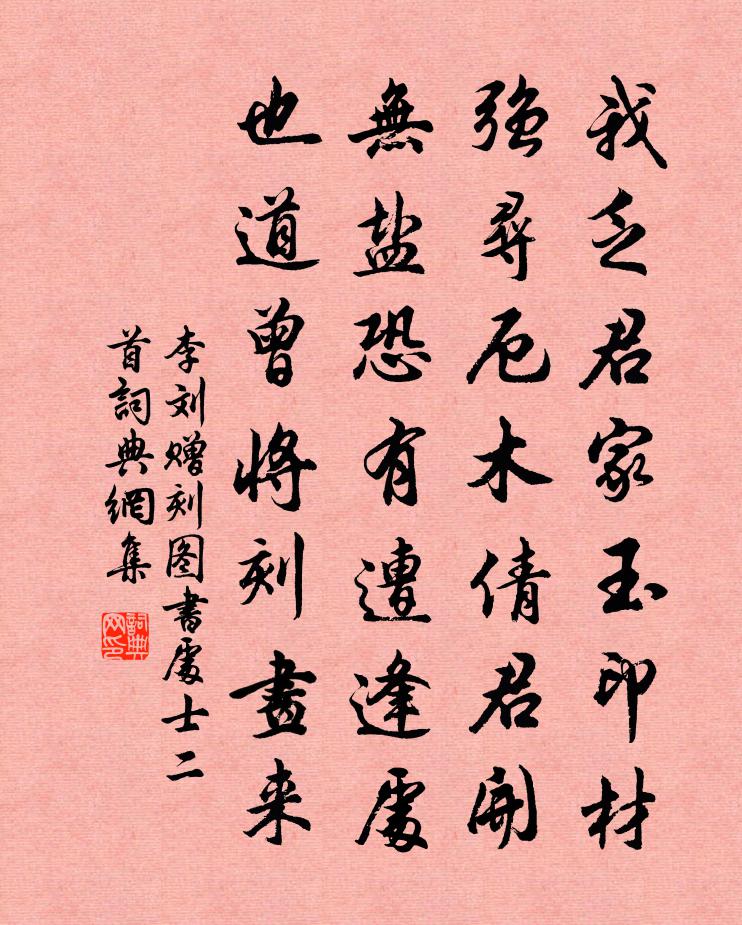 詩詞名句歷史字典書法欣賞書法字典國語詞典說文解字康熙字典古漢語字典標 題 作 者 詩 句 贈刻圖書處士二首作者:李劉 朝代:宋代贈刻圖書處士二首原文我乏君家玉印材,強尋厄木倩君開。無鹽恐有遭逢處,也道曾將刻畫來。詩詞問答問:贈刻圖書處士二首的作者是誰?答:李劉問:贈刻圖書處士二首寫於哪個朝代?答:宋代李劉贈刻圖書處士二首書法欣賞贈刻圖書處士二首書法作品詩詞推薦掃花游/掃地游周密〔宋代〕柳花颺白,又火冷餳香,歲時荊楚。海棠似語。惜芳情燕掠,錦屏紅舞。怕里流芳,暗水啼煙細雨。帶愁去。嘆寂殘句:帝憐守土舊時臣王禹偁〔宋代〕帝憐守土舊時臣,添賜春光入酒尊。春晚謠蔣華子〔宋代〕汀洲三月楊花飛,河魨出水江鱭肥。雨聲翻作斷腸曲,薄寒戀戀輕羅衣。新愁壓眉雙碧聚,作意挽春春不住。無情十二時/憶少年佚名〔宋代〕君天下,萬國來王。玉帛湊梯航。五風十雨,品物蕃昌。棲壠有餘糧。躬千畝、天步龍翔。化重光。舉祖彝章。驗閒中戲賦村落景物陸游〔宋代〕覆筱初成屋,編荊旋作門。孤雲生釣瀨,微雨過棋軒。柳種來傍縣,花栽乞近村。石欹聊可坐,地褊不成園。酒榼春晚官舍呈幕中宋祁〔宋代〕萬點飛花拂路塵,行春罷後惜殘春。雨催菖葉全成甲,風播榆錢不算緡。多病已慚官綬束,長年惟共酒杯親。坐題名都篇曹植〔魏晉〕名都多妖女,京洛出少年。寶劍值千金,被服麗且鮮。鬥雞東郊道,走馬長楸間。馳騁未能半,雙兔過我前。攬弓雜興六言十首劉克莊〔宋代〕穆陵聖學高妙,詞臣絕企清光。大典冊多貼改,小字本通商量。和陳長卿五人同集韻王洋〔宋代〕愛廛書均宅畝,書雨矩漸經書營。湖泛書輕舟遁,峰排老岫嶸。牧之推上第,吏部絕心兵。列爵分全服,和聲奏大紅樓夢十二曲——恨無常曹雪芹〔清代〕喜榮華正好,恨無常又到,眼睜睜把萬事全拋,盪悠悠芳魂銷耗。望家鄉路遠山高。故向爹娘夢裡相尋告:兒命已春興七首白玉蟾〔宋代〕望中白鳥入空無,一帶青山似畫圖。宿雨初醒雲半斂,垂楊微困水平鋪。簡提刑吳大卿二首周必大〔宋代〕瑞節頻移意可知,西川西廣又江西。蘇黃到處君行部,物色分留待品題。泊上虞驛來日行四首陳造〔宋代〕溪山可圖畫,風物憶吾鄉。漁艇鷗鶩亂,茅茨菱芡香。旄丘佚名〔先秦〕旄丘之葛兮,何誕之節兮。叔兮伯兮,何多日也?何其處也?必有與也!何其久也?必有以也!狐裘蒙戎,匪車不崔覲詩文同〔宋代〕崔覲者高幹,梁州城固人。讀書不求官,但與耕稼親。夫婦既已老,左右無子孫。一日召奴婢,盡又田宅均。俾之竹杖姜特立〔宋代〕竹杖點湘斑,長隨掌握間。老來方得力,伴我一生閒。清河縣樓作韋莊〔唐代〕有客微吟獨憑樓,碧雲紅樹不勝愁。盤雕迥印天心沒,遠水斜牽日腳流。千里戰塵連上苑,九江歸路隔東周。故人送王彥聲歸苕溪二首李彌遜〔宋代〕盛世英才偶未逢,寄身無地轉如蓬。詩親東野窮尤壯,賦擬相如老更工。鵰鶚不飛行奮迅,璠璵未獻要磨礲。會須出遊陸游〔宋代〕朝行躡屩穿幽谷,暮返褰裳涉亂流。提起短筇成一笑,每煩上座為分憂。送袁偁盧綸〔唐代〕諫獵名空久,多因病與貧。買書行幾市,帶雨別何人。客路山連水,軍州日映塵。淒涼一分手,俱恨老相親。名句推薦成人不自在,自在不成人。佚名《增廣賢文·下集》 萬里傷心嚴譴日,百年垂死中興時。杜甫《送鄭十八虔貶台州司戶傷其臨老陷賊之故闕為面別情見於詩》 雨橫風狂三月暮,門掩黃昏,無計留春住。歐陽修《蝶戀花·庭院深深深幾許》 問姓驚初見,稱名憶舊容。李益《喜見外弟又言別》 笙歌散盡遊人去,始覺春空。歐陽修《採桑子·群芳過後西湖好》 孤舟向廣武,一鳥歸成皋。岑參《鞏北秋興寄崔明允》 食之以時,用之以禮。孟子《孟子·盡心章句上·第二十三節》 玩人喪德,玩物喪志。佚名《尚書·周書·旅獒》 長堤春水綠悠悠,畎入漳河一道流。王之渙《宴詞》 臣心一片磁針石,不指南方不肯休。文天祥《揚子江》