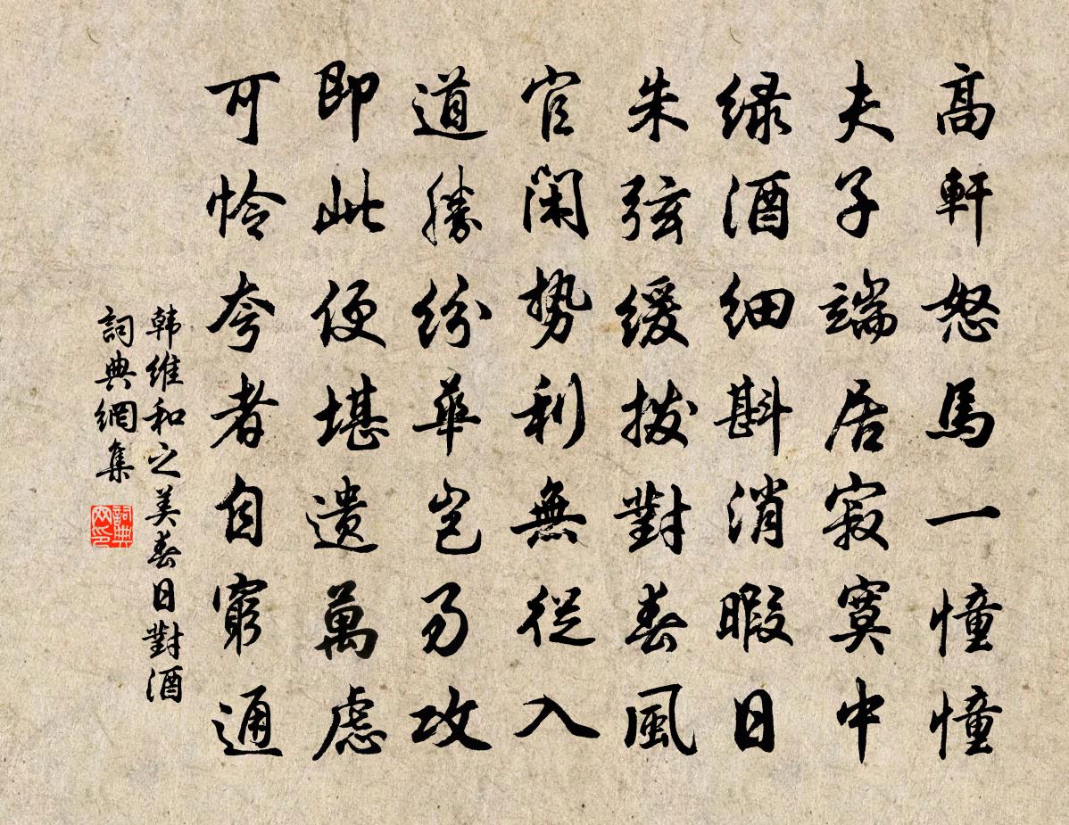 詩詞名句歷史字典書法欣賞書法字典國語詞典說文解字康熙字典古漢語字典標 題 作 者 詩 句 和之美春日對酒作者:韓維 朝代:宋代和之美春日對酒原文高軒怒馬一憧憧,夫子端居寂寞中。綠酒細斟消暇日,朱弦緩撥對春風。官閒勢利無從入,道勝紛華豈易攻。即此便堪遺萬慮,可憐夸者自窮通。詩詞問答問:和之美春日對酒的作者是誰?答:韓維問:和之美春日對酒寫於哪個朝代?答:宋代韓維和之美春日對酒書法欣賞和之美春日對酒書法作品詩詞推薦春夜信筆書李彌遜〔宋代〕枝上紅殘遍地香,沈郎瘦骨嘆更長。東鄰喚客竹歌鬧,琥珀杯空夜未央。謝林默之居士惠酒居士山居方與世絕尚欲友此陳傅良〔宋代〕不將鵝鴨惱比鄰,林下蕭然老幅巾。乞與青州十從事,添成明月兩閒人。小重山·春愁吳淑姬〔宋代〕謝了荼縻春事休。無多花片子,綴枝頭。庭槐影碎被風揉。鶯雖老,聲尚帶嬌羞。獨自倚妝樓。一川菸草浪,襯雲臨終偈釋師範〔宋代〕來時空索索,去也赤條條。更要問端的,天台有石橋。北望鄭思肖〔宋代〕紫塞風高直北秋,黃河水自向東流聲。穆王御馬還宮日,沲經內封疆只屬周。家叔沚次暮春韻呈知止秘校汪應辰〔宋代〕一日復一日,山間已暮春。人事有怵迫,景物無疏親。誰知一雨後,滿目皆懷新。風光欠管領,付與得閒人。冬早書事楊時〔宋代〕窈冥誰為宰爐錘,榮謝唯知歲序催。臘日未經梅已綻,春風尚遠凍先開。愁無潤澤歸芳樹,獨有餘寒著死荄。收盡登祥雲庵謁東林明首座釋正覺〔宋代〕伐木清喔癖在腸,握筇蒼磴履重霜。玲瓏墮壑乳泉響,蕭瑟到門松吹香。高寒夜雨凍一色,虛淨曉雲流五光。社散夢感梅堯臣〔宋代〕生哀百十載,死苦千萬春。何為千萬春,厚地不復晨。我非忘情者,夢故不夢新。宛若昔之日,言語尋常親。及寤贈關彥長陳師道〔宋代〕少年毛初識字,毛已誦子虛毛賦。嘗疑毛天上人,已離人間去。蹉跎二十年,久自嘆遲暮。倦遊梁宋間,郤踏江湖漁村雜句十首薛嵎〔宋代〕非智非愚浪著鞭,前程倒指事茫然。臨漢一洗巢由耳,獨立斜陽認釣船。同劉季游登天柱岡四首楊萬里〔宋代〕兩隻胡床小憩些,一枝筇杖拄傾斜。煙雲慘澹天將雪,風日荒寒梅未花。人去客來酤酒市,雞鳴犬吠野人家。清游再賦二首呈奇父陳與義〔宋代〕國香薰坐先生醉,秋葉藏花客子迷。驅使晚風同勝地,東軒不用鎮帷犀。和冕仲觀試進進士黃庭堅〔宋代〕人圍廟垣重,鼓作宮漏曉。晨門傳放鑰,坌入荒庭秒。初如求木猿,稍若安巢鳥。黃爐答拜辱,月淡秋天杳。發題上廣東運副馬少卿壽十口號曾豐〔宋代〕文星又轉作郎星,曉握蘭香上玉清。屹立太微東北角,是非時與上台爭。夏日閒居張籍〔唐代〕多病逢迎少,閒居又一年。藥看辰日合,茶過卯時煎。草長晴來地,蟲飛晚後天。此時幽夢遠,不覺到山邊。寄制誥李舍人羅隱〔唐代〕梁王握豹韜,雪裡見枚皋。上客趨丹陛,遊人嘆二毛。門閒知待詔,星動想濡毫。一首長楊賦,應嫌索價高。端午帖子皇帝閣周必大〔宋代〕縷繒採藥謾區區,誰似君王用意殊。仁政便為醫國艾,德威那假辟兵符。送商季皋皎然〔唐代〕比來知爾有詩名,莫恨東歸學未成。新豐有酒為我飲,消取故園傷別情。中秋招王才臣賞梅花廷秀待制有詩次韻周必大〔宋代〕山中無歷記時節,望月巡檐探花發。適看如來金粟布,旋觀姑射膚凝雪。春自春兮秋自秋,總把繁枝插滿頭。那知名句推薦零落棲遲一杯酒,主人奉觴客長壽。李賀《致酒行》 妾家高樓連苑起,良人執戟明光里。張籍《節婦吟·寄東平李司空師道》 罩向金籠好羽儀,分明喉舌似君稀僧定渚《詠鸚鵡》 誠知此恨人人有,貧賤夫妻百事哀。元稹《遣悲懷三首·其二》 同穴窅冥何所望,他生緣會更難期。元稹《遣悲懷三首·其三》 不在其位,不謀其政。孔子弟子《論語·泰伯篇》 無田似我猶欣舞,何況田間望歲心。曾幾《蘇秀道中》 白鳥悠悠自去,汀洲外、無限蒹葭。王國維《滿庭芳·水抱孤城》 我也不登天子船,我也不上長安眠。唐寅《把酒對月歌》 人無禮則不生,事無禮則不成,國家無禮則不寧。荀子《荀子·修身》