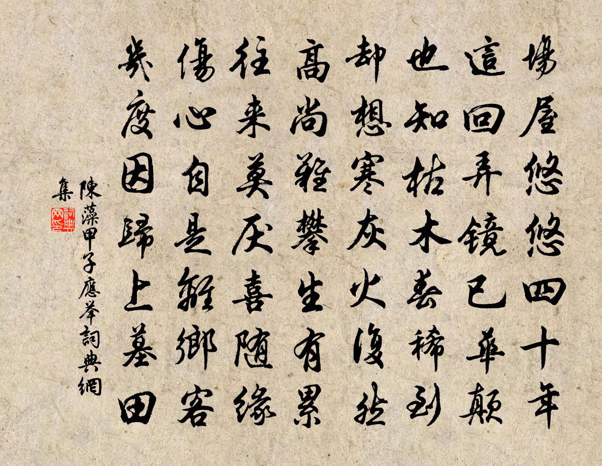 詩詞名句歷史字典書法欣賞書法字典國語詞典說文解字康熙字典古漢語字典標 題 作 者 詩 句 甲子應舉作者:陳藻 朝代:宋代甲子應舉原文場屋悠悠四十年,這回弄鏡已華顛。也知枯木春稀到,卻想寒灰火復然。高尚難攀生有累,往來莫厭喜隨緣。傷心自是離鄉客,幾度因歸上墓田。詩詞問答問:甲子應舉的作者是誰?答:陳藻問:甲子應舉寫於哪個朝代?答:宋代陳藻甲子應舉書法欣賞甲子應舉書法作品詩詞推薦歲終呈一齋吳汝弌〔宋代〕磊砢千丈松,清陰蔭林丘。豈無棟樑用,匠伯不見收。匠伯恐未良,棟樑終有求。天風葉偃蓋,五雲常為浮。次韻嚴子文旅中見贈范成大〔宋代〕杯中疇昔共江天,傾座新詩報警聯。海浦寸心空共月,京華雙鬢各凋年。交情敢說同方友,句法甘從弟子員。有意遊仙詞三十三首王鎡〔宋代〕金光倒射玉樓台,海上仙人採藥回。花下閒談屍解事,葛翁忽跨白驢來。送張問南遊宋祁〔宋代〕草遠花明溝水頭,同君此地並離愁。蓋餘瓮酒沈三賦,合作盤鯖厭五侯。覺在他鄉應有夢,信非吾土少登樓。楚山再賦周必大〔宋代〕時節三吳重,勻圓萬顆同。溲浮雖有法,烹煮豈無功。杜喜雲抄白,徐妨酒復中。策勛俱是秫,適口不同風。景祐親享太廟二首真宗〔宋代〕追養奉先,納孝練主。金奏鳳鳴,開雎樂舞。奠眼恭神,肥腯展俎。積慶聰明,降景環宇。饋春茶天制司屬官袁說友〔宋代〕戊午新芽上蜀江,表情未有敢先嘗。幾年爭鬭無雙品,萬里書來第一綱。水截龍章浮碾玉,爐煎蟹眼試憑湯。知君句宋中行〔宋代〕路轉五盤知地遠,鋪名太薄見人情。句陳曄〔宋代〕朝看碧溪初騰日,暮對青山淡抹雲。歐陽季默以油煙墨二丸見餉各長寸許戲作小詩蘇軾〔宋代〕書窗拾輕煤,佛帳掃余馥。辛勤破千夜,收此一寸玉。痴人畏老死,腐朽同草木。欲將東山松,涅盡南山竹。墨堅寄蘭溪邑長史宮贊林逋〔宋代〕溪上紅蘭露泫華,豀波浮動長人衙。公餘即有扁舟興,幾弄潺湲到日斜。送高景仁之廣德連文鳳〔宋代〕不愁離別難,江浙片雲間,黃葉晚秋徑,白茅深處山。有詩連夢遠,無累得身間。若遇西風便,安書寄雁還。題劉氏綠映亭二首呂祖謙〔宋代〕鷺浴魚跳在鏡屏,搖青浮碧太鮮明。牆東種得陰成幄,隔葉看來卻有情。寄白蓮寺隆虛岩顧逢〔宋代〕人自菁山出,先須問老師。未痊張籍眼,不廢貫休詩。課佛輪珠滑,翻經破帽欹。幾年修淨業,喜近白功池。薛簡肅夫人輓詞四首梅堯臣〔宋代〕冠劍將朝去,常知好直言。戒辭猶可托,先見久應存。瑩 * 兼玉,清芬蕙與蓀。堂塗從此閉,何日卜丘原。賀新涼(次拙逸劉直孺維揚客中賀新涼韻)張榘〔宋代〕襟度天為侶。價平生、放浪江湖,浮雲行住。倒挽峽流歸筆底,袞袞二並四具。何尚友、滄波鷗鷺。藻黻皇猷君能謁金門(秋興)佚名〔宋代〕秋淡淡。彌望暮天雲黯。窗小新糊便老眼。不應疏酒盞。菊淨橙香霜晚。何處數聲來雁。飛下湖邊紅蓼岸。有詩方憶京雒木芍藥三絕蘇籀〔宋代〕沈薌亭北壓欄桿,眩耀熒煌障幄寬。不薄官梅伴飛霰,只饒蘭蕙楚騷寒。常祀皇地祗五首佚名〔宋代〕禮崇禋祀,神鑒孔明。牲牲博腯,以炰以烹。聲香蠲潔,品物惟精。錫以純嘏,享茲至誠。溪庵十首劉克莊〔宋代〕村深保社雜樵漁,歲晚溪翁此卜居。門下諸生皆去矣,塚旁二客定誰歟。即今不惜頻投轄,他日毋煩更下車。卻笑名句推薦寒沙四面平,飛雪千里驚。范雲《效古詩》 惆悵孤帆連夜發,送行淡月微雲。蘇軾《臨江仙·送錢穆父》 瀚海闌乾百丈冰,愁雲慘澹萬里凝。岑參《白雪歌送武判官歸京》 有情風、萬里卷潮來,無情送潮歸。蘇軾《八聲甘州·寄參寥子》 少年聽雨歌樓上。紅燭昏羅帳。蔣捷《虞美人·聽雨》 雲盡月如練,水涼風似秋。歐陽詹《荊南夏夜水樓懷昭丘直上人云夢李莘》 金吾不禁夜,玉漏莫相催。蘇味道《正月十五夜》 絲絲楊柳絲絲雨。春在溟濛處。蔣捷《虞美人·梳樓》 天山三丈雪,豈是遠行時。李白《獨不見》 力田已告成,計日宜收藏。黃燮清《秋日田家雜詠》