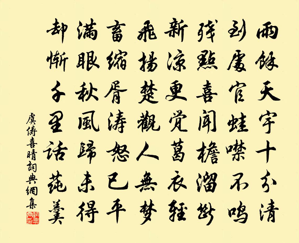 詩詞名句歷史字典書法欣賞書法字典國語詞典說文解字康熙字典古漢語字典標 題 作 者 詩 句 喜晴作者:虞儔 朝代:宋代喜晴原文雨餘天宇十分清,到處官蛙噤不鳴。殘點喜聞檐溜斷,新涼更覺葛衣輕。飛揚楚觀人無夢,畜縮胥濤怒已平。滿眼秋風歸未得,卻慚千里話蓴羹。詩詞問答問:喜晴的作者是誰?答:虞儔問:喜晴寫於哪個朝代?答:宋代虞儔喜晴書法欣賞喜晴書法作品詩詞推薦除夜共蔣力父有秋宿南浦館王邁〔宋代〕客里逢年酒半醺,篝燈課送窮文章。對休共聽巴山雨,入夢休思巫峽雲。好整衣冠朝北闕,新栽桃李屬東居。平明中秋夜登樓望月寄人戎昱〔唐代〕西樓見月似江城,脈脈悠悠倚檻情。萬里此情同皎潔,一年今日最分明。初驚桂子從天落,稍誤蘆花帶雪平。知稱送東上人釋道璨〔宋代〕上頭上面得人憎,少見生獰個樣僧。莫道無又輕放過,病來無力舉烏藤。見梅張道洽〔宋代〕寒梅沖雪領春回,桃李紛紛趁腳來。一點陽和無盡處,從頭分與百花開。楊柳汪遵〔唐代〕亞夫營畔柳濛濛,隋主堤邊四路通。攀折贈君還有意,翠眉輕嫩怕春風。初到碧澗招明契上人劉長卿〔唐代〕漸老知身累,初寒曝背眠。白雲留永日,黃葉減餘年。猿護窗前樹,泉澆谷後田。沃洲能共隱,不用道林錢。和中齋韻文天祥〔宋代〕見說黃沙接五原,飄零隻影向南轅。江山有恨銷人骨,風雨無情斷客魂。淚似空花千點落,鬢如碩果數根存。肉飛沁園春(守歲)陳人傑〔宋代〕太歲茫茫,猶有歸時,我胡不歸。為桂枝關約,十年闕下,梅花夢想,半夜天涯。婪尾三杯,膠牙一標,節物依然居延海樹聞鶯同作陳子昂〔唐代〕邊池無芳樹。鶯聲忽聽新。間關如有意。愁絕若懷人。明妃失漢寵。蔡女沒胡塵。坐聞應落淚。況憶故園春。鳲鳩佚名〔先秦〕鳲鳩在桑,其子七兮。淑人君子,其儀一兮。其儀一兮,心如結兮。鳲鳩在桑,其子在梅。淑人君子,其帶伊絲。晚舟過臨平吳龍翰〔宋代〕煙鍾舂起夕陽愁,森森臨平春事幽。惟有風蒲愛吟客,岸邊繚亂綰行舟。別環首座釋正覺〔宋代〕雪立空庭疇墮賓,丹山握手履芳塵。石人破曉初移位,玉女羞明卻轉身。去意江湖頻掛夢,回頭棠棣一成春。叢林減字木蘭花陳汝羲〔宋代〕纖纖素手。盤裡醉花新點就。對葉雙心。別有東風意思深。瓊沾粉綴。消得玉堂留客醉。試嗅清芳。別有紅羅巧袖將作監栽竹徐直翁清叟俾予書植賢亭三大字以魏了翁〔宋代〕客夢時時繞故山,夢余砉見玉孱顏。徐公本自無通介,自是時人醉眼斑。偈頌一百零二首釋紹曇〔宋代〕奴顏婢膝走人間,羞見羊裘七里灘。文叔雖為天子貴,子陵只作故人看。七月十七日游浮山值夜未快所觀急歸作詩李流謙〔宋代〕田疇渺渺平一望,側嶺橫峰環四向。那知中有此巉岩,倚天削鐵三千丈。坤靈湧出薦地寶,方嶠飛來憩靈仗。我來晚虹王令〔宋代〕晚虹隨雨過山巔,誰插青雲倒掛懸。可惜兩垂空到海,不令一直徑沖天。不堪暮靄難相蔽,常到斜陽亦可憐。好使晴偏好佚名〔宋代〕平湖百傾生芳草。芙蓉不照紅顛倒。東坡道。波光瀲灩晴偏好。金國賀正旦使副到闕紫宸殿宴致語口號周必大〔宋代〕北斗回杓恰指寅,東皇御極蚤施仁。光風麗日依稀轉,御柳宮花次第新。魚藻有頒安萬物,鹿苹式燕樂嘉賓。小臣答番昜使君胡直院二首劉克莊〔宋代〕老欠人書債,惟公幸恕之。不逢斬窗處,即值攬衣時。膽薄書行詔,才慳倚合詩。自憐雙鬢禿,猶忝屬車隨。名句推薦知音少,弦斷有誰聽。岳飛《小重山·昨夜寒蛩不住鳴》 嗜欲不能勞其目,淫邪不能惑其心佚名《黃帝內經·上古天真論》 江山如此多嬌,引無數英雄競折腰 * 《沁園春·雪》 行得春風,指望夏雨馮夢龍《警世通言·卷二十五》 一聲畫角譙門,豐庭新月黃昏,雪裡山前水濱。白樸《天淨沙·冬》 鞭影落春堤,綠錦鄣泥卷。納蘭性德《生查子·鞭影落春堤》 西園何限相思樹,辛苦梅花候海棠。元好問《鷓鴣天·候館燈昏雨送涼》 白首相知猶按劍,朱門先達笑彈冠。王維《酌酒與裴迪》 東風不與周郎便,銅雀春深鎖二喬。杜牧《赤壁》 驚風亂颭芙蓉水,密雨斜侵薜荔牆。柳宗元《登柳州城樓寄漳汀封連四州》